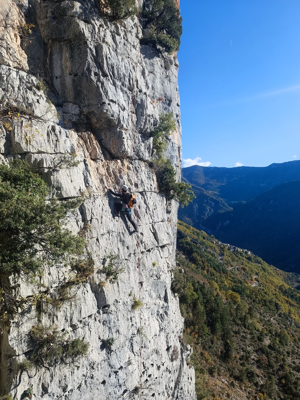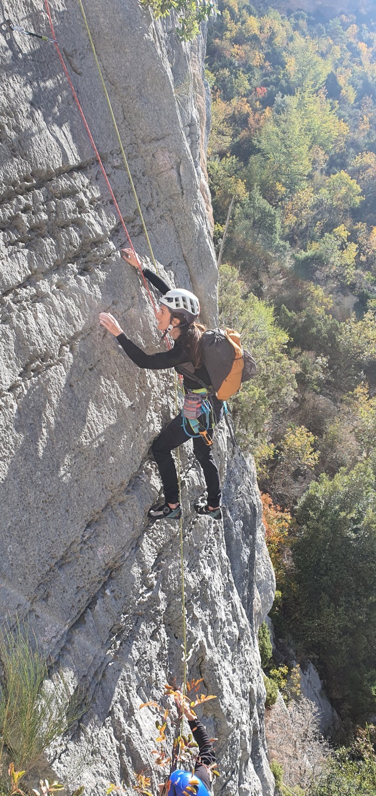 Derrière nous, Jean-Luc a pris la tête depuis le relais peu confortable du 6a+ et choisit de faire le 4c et le 5c en une fois, ce qui l’oblige à faire le dernier relais juste sous le sommet, n’ayant pas assez de corde pour atteindre le fameux chêne ! Finalement, il est 16h15 lorsque le dernier grimpeur atteint le sommet. Le soleil est encore là mais passe derrière les sommets, faisant du même coup chuter la température de quelques degrés. Matos rangé, on attaque la marche retour qui commence par grimper raide pour retrouver le magnifique chemin de rando qui nous ramène au village. On profite des couleurs de l’automne et les frotales n’auront été utiles que pour aller explorer la grotte obscure et observer ses 2 chauve-souris sur le chemin du retour.