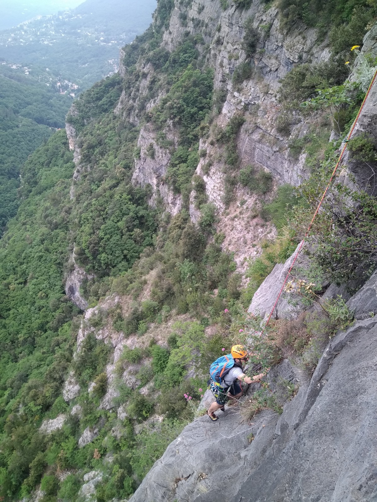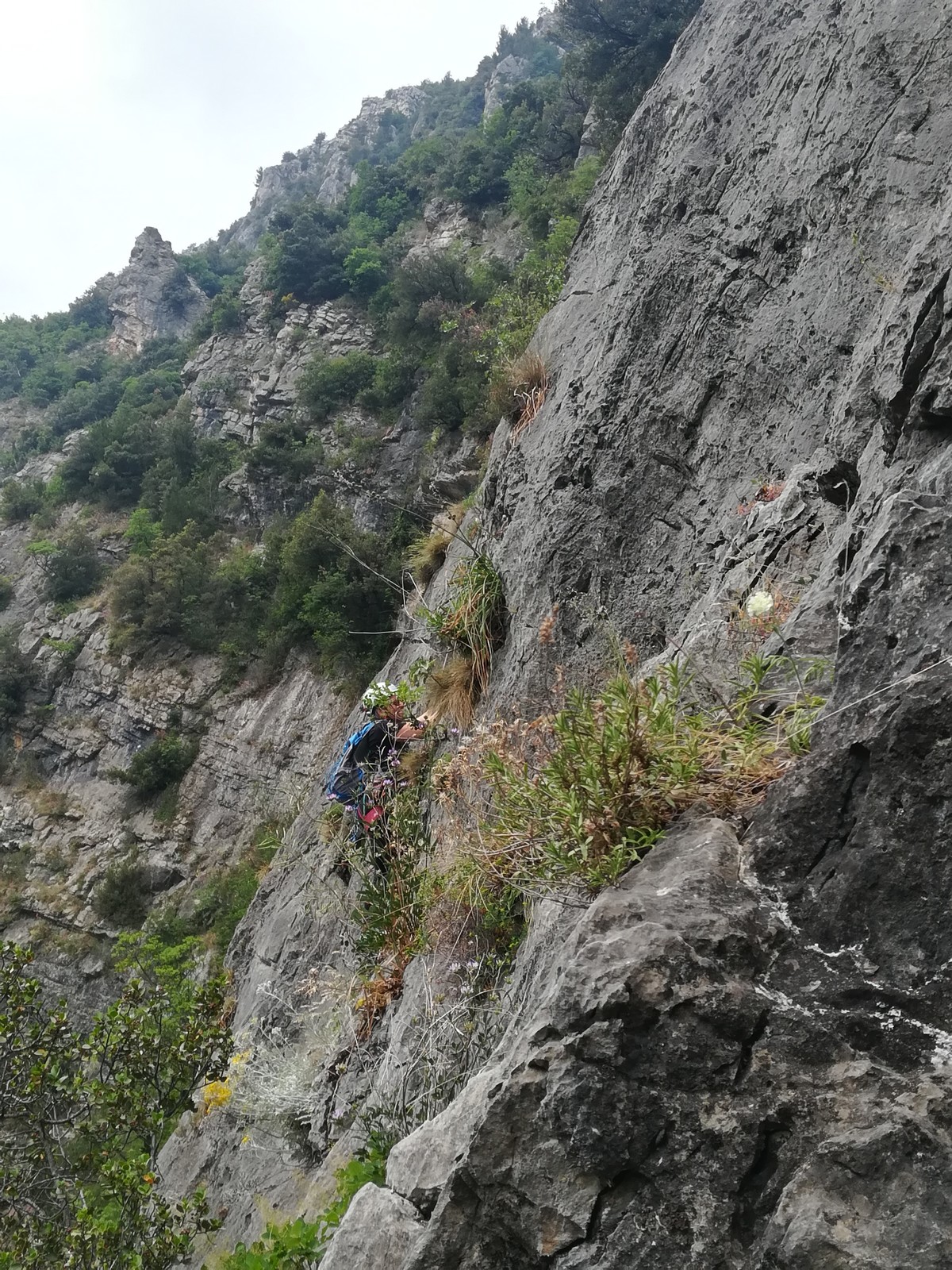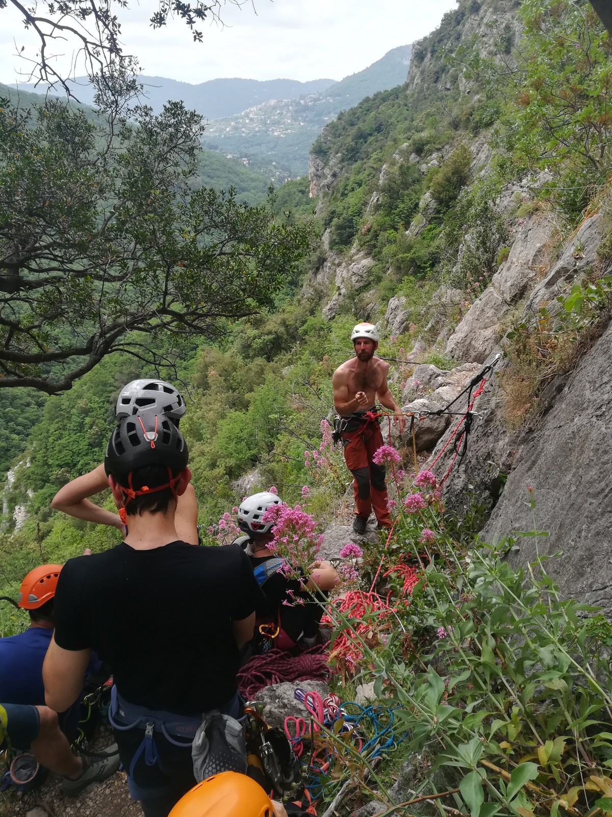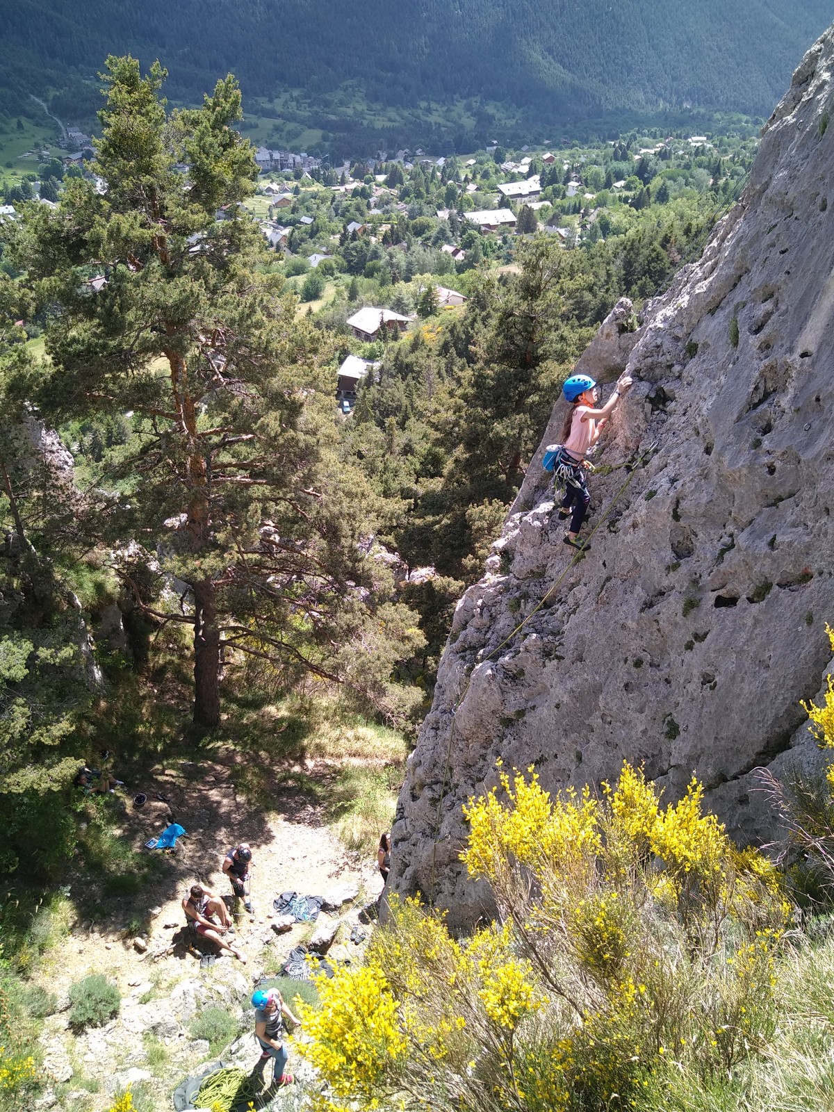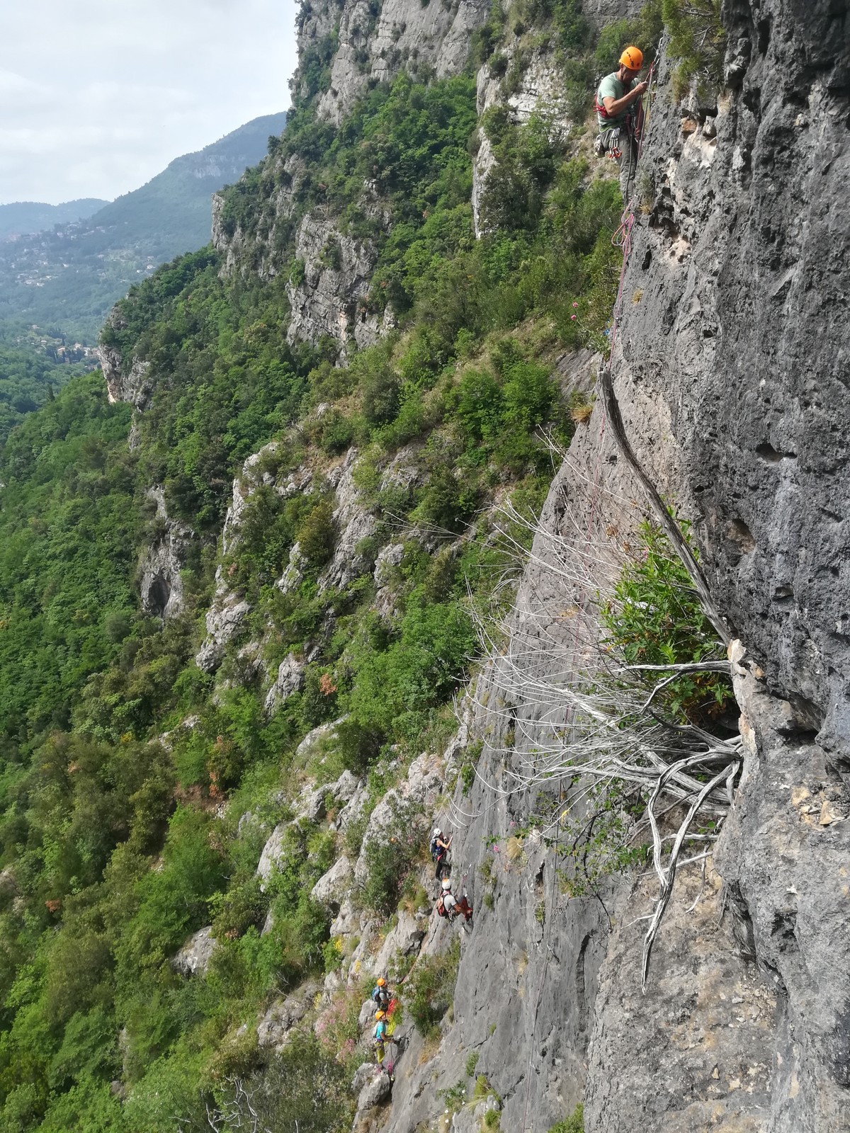 Cécile et Gautier s’élancent en premier dans « La rondeur des jours », 150m, 6b max. Jean-Luc est rapidement prêt également et attaque la première longueur en 6a de « Merci madame le maire », 150m, 6a max avec Xav et moi, suivis par Jean, Philippe et Laura.