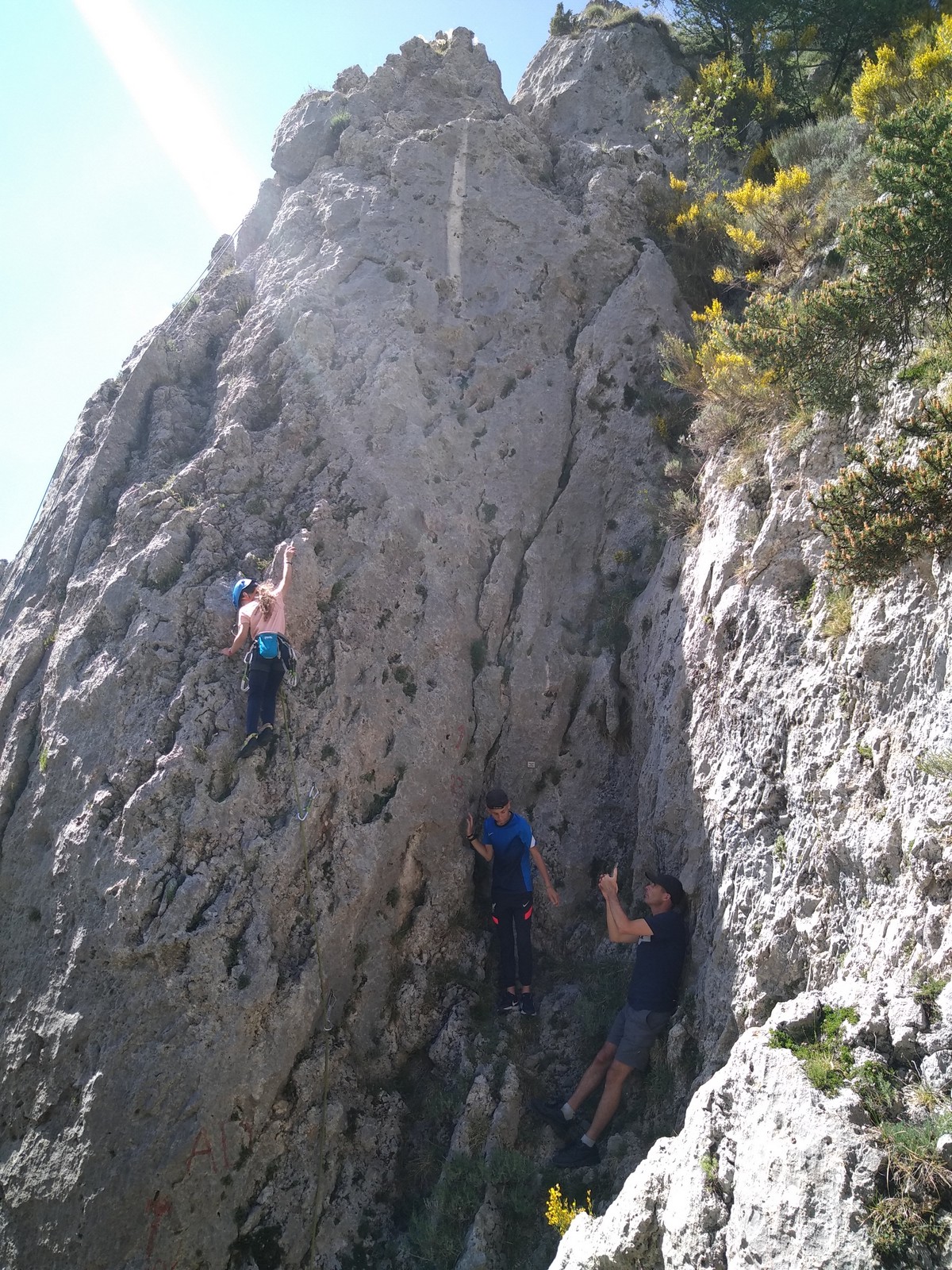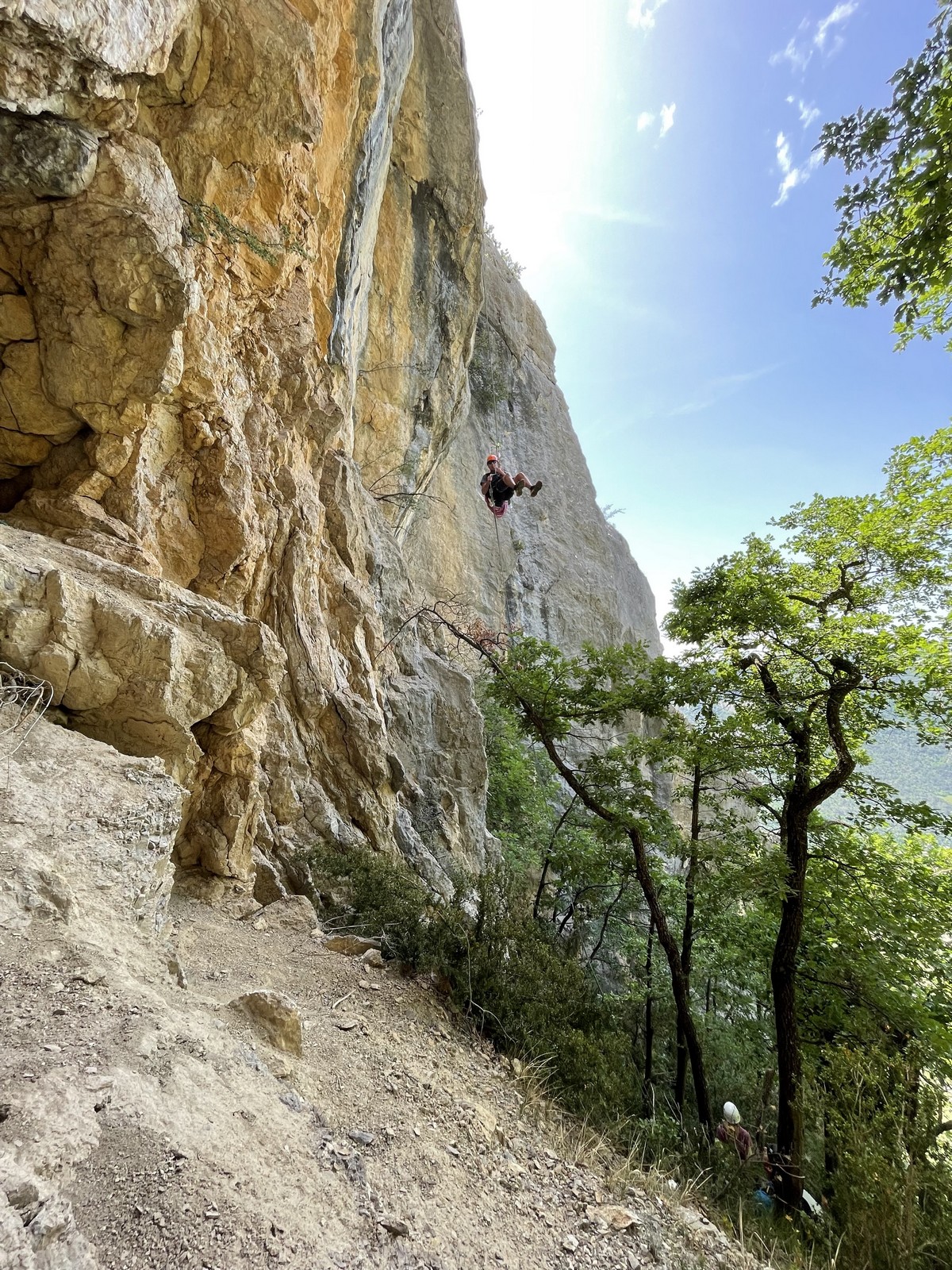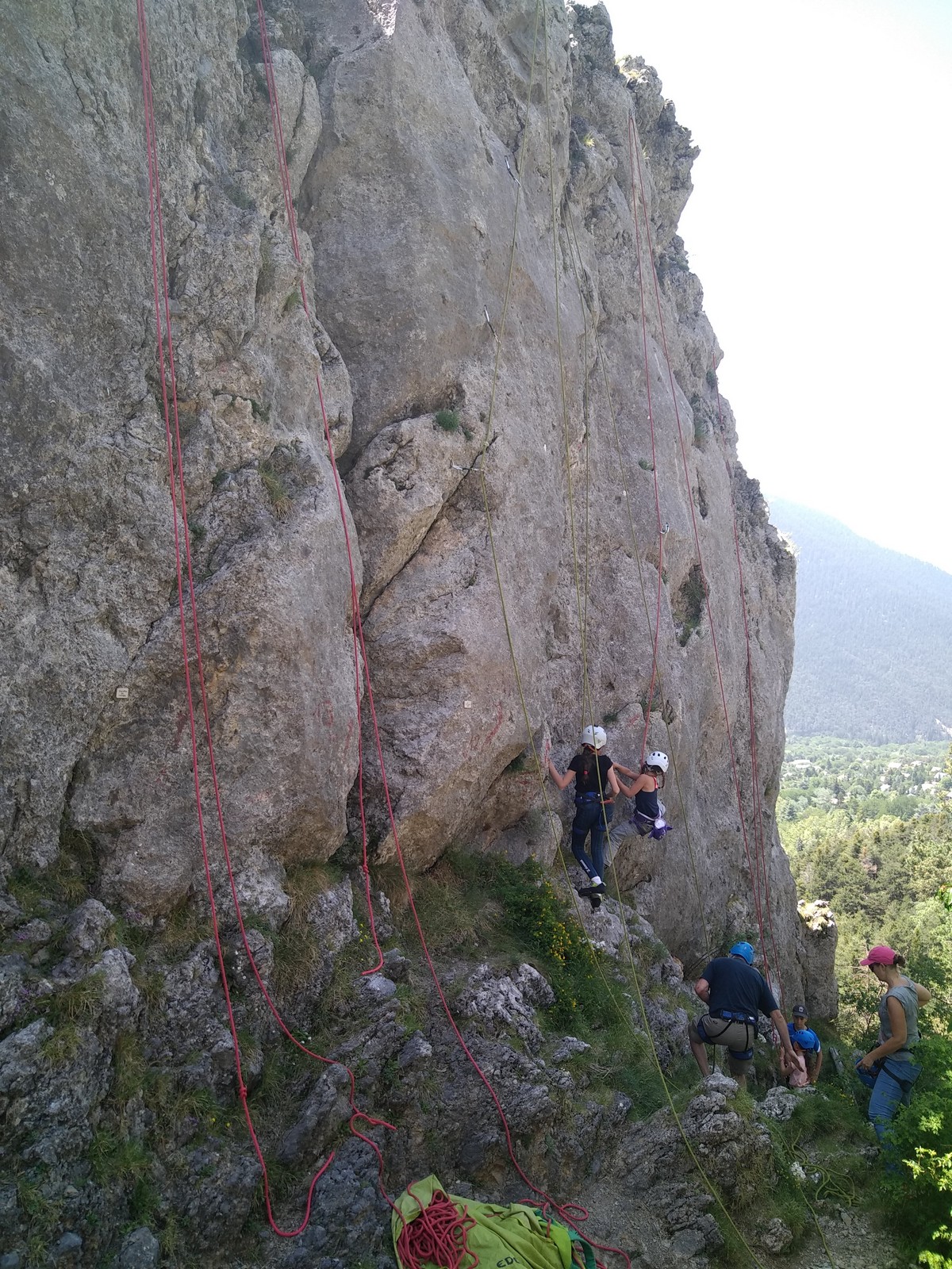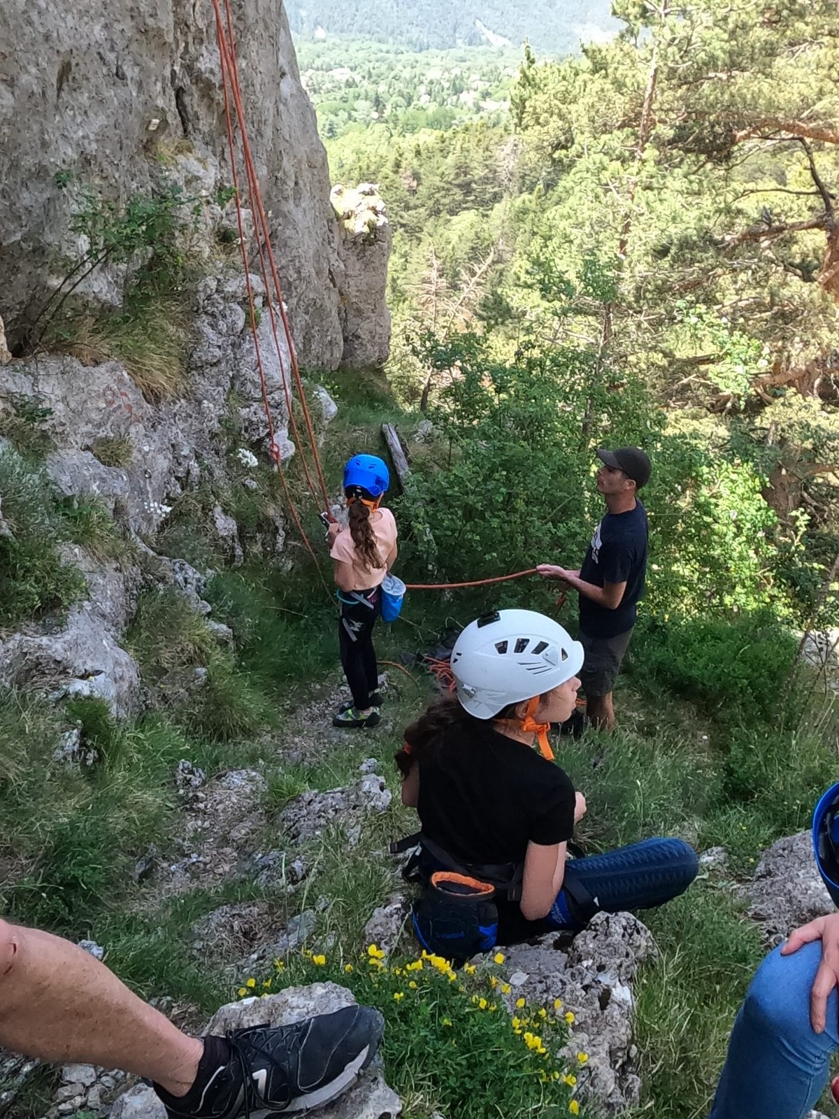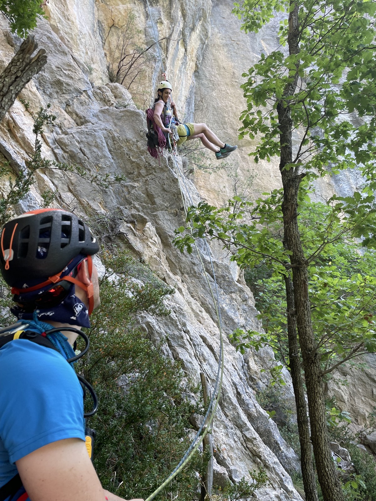 Un court trajet en voiture et une petite marche d’approche plus loin, nous voilà au pied du secteur, pas encore complètement à l’ombre mais pas loin. Les cordées s’organisent, le matériel aussi et c’est parti pour des voies de 2 ou 3 longueurs avec descente en rappel. Tout le monde y met du sien et se concentre sur la gestion du relais et des cordes. L’escalade est vraiment facile, et on se promène avec Sébastien sur les différents relais pour surveiller et donner quelques explications supplémentaires.