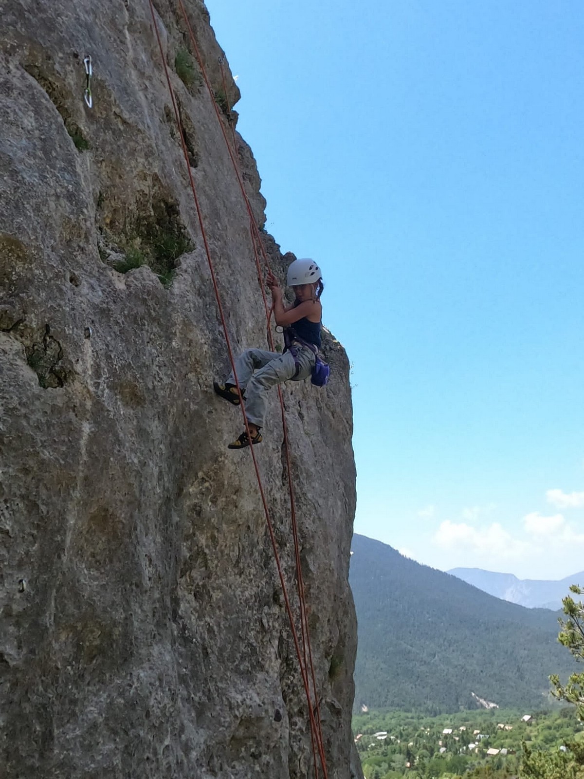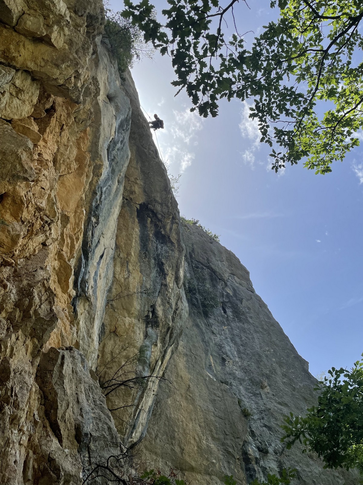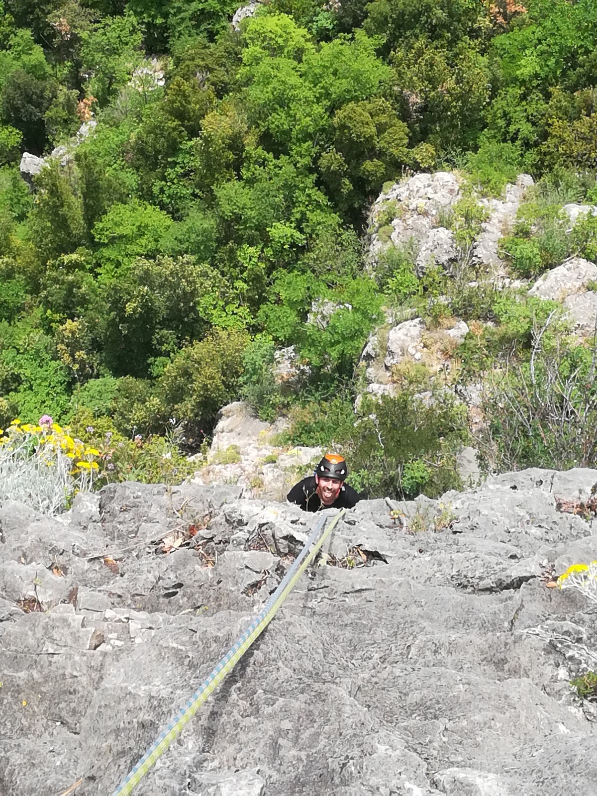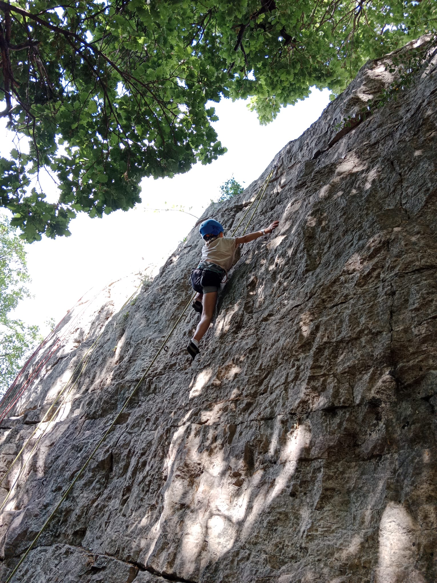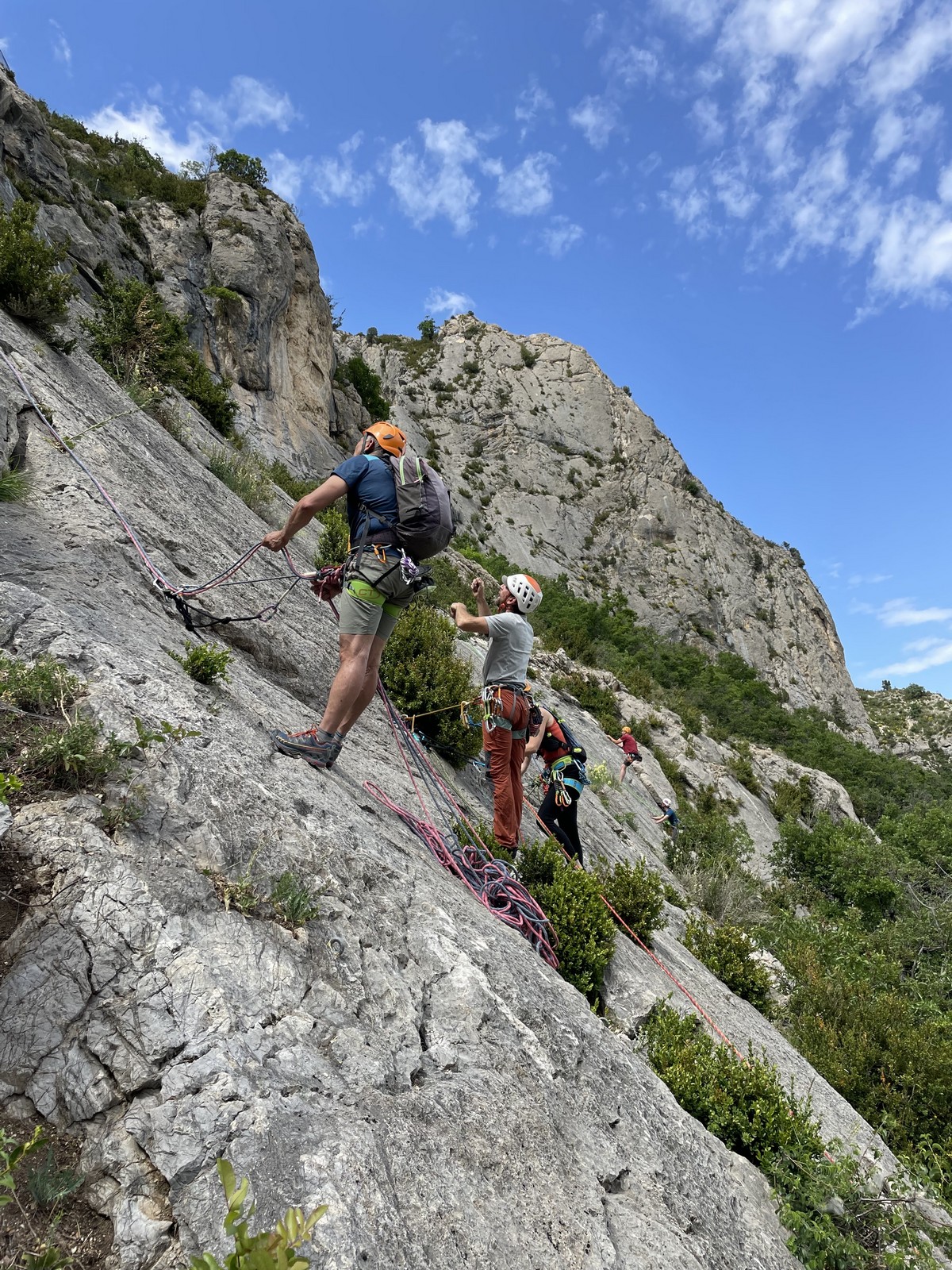 Un court trajet en voiture et une petite marche d’approche plus loin, nous voilà au pied du secteur, pas encore complètement à l’ombre mais pas loin. Les cordées s’organisent, le matériel aussi et c’est parti pour des voies de 2 ou 3 longueurs avec descente en rappel. Tout le monde y met du sien et se concentre sur la gestion du relais et des cordes. L’escalade est vraiment facile, et on se promène avec Sébastien sur les différents relais pour surveiller et donner quelques explications supplémentaires.
