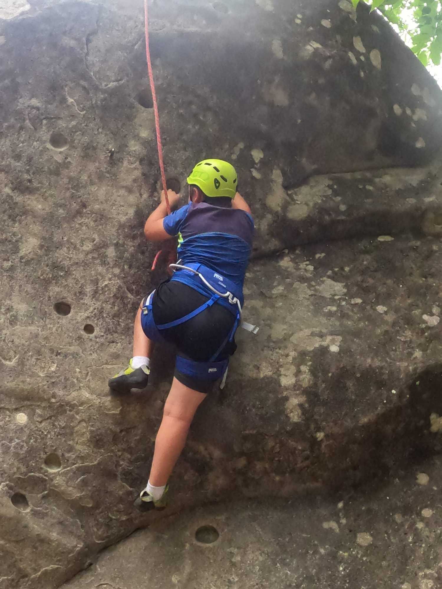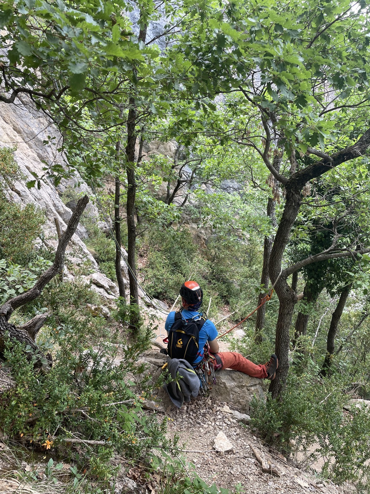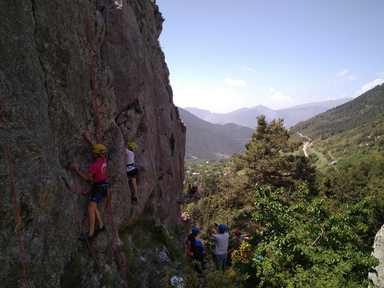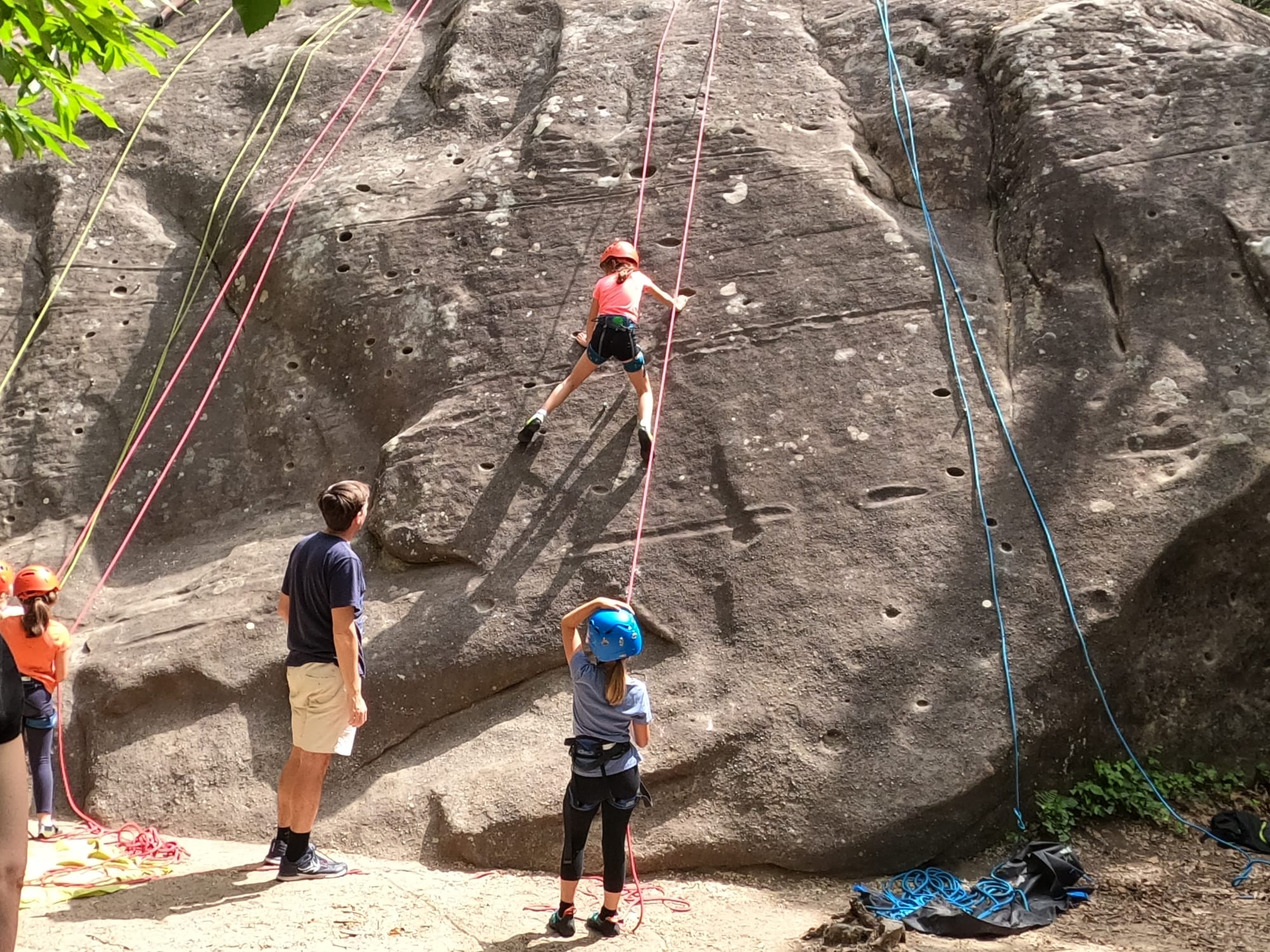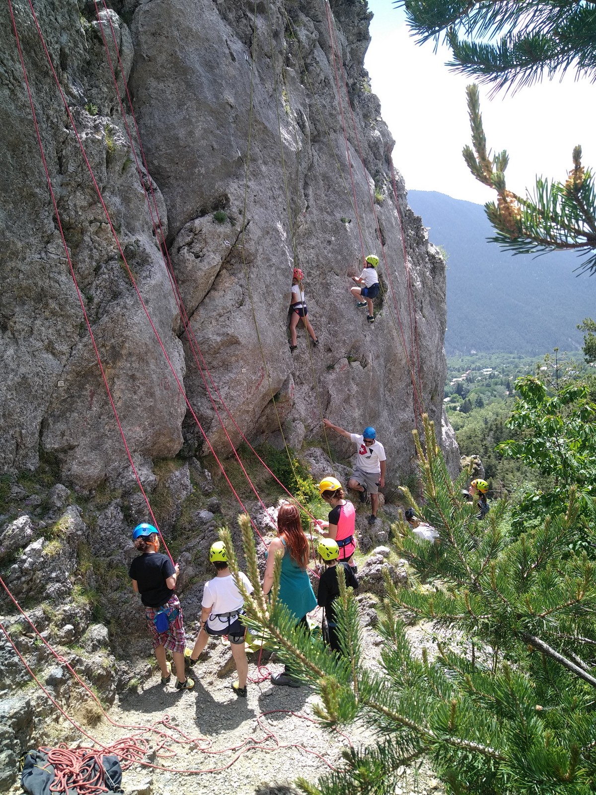 Un court trajet en voiture et une petite marche d’approche plus loin, nous voilà au pied du secteur, pas encore complètement à l’ombre mais pas loin. Les cordées s’organisent, le matériel aussi et c’est parti pour des voies de 2 ou 3 longueurs avec descente en rappel. Tout le monde y met du sien et se concentre sur la gestion du relais et des cordes. L’escalade est vraiment facile, et on se promène avec Sébastien sur les différents relais pour surveiller et donner quelques explications supplémentaires.