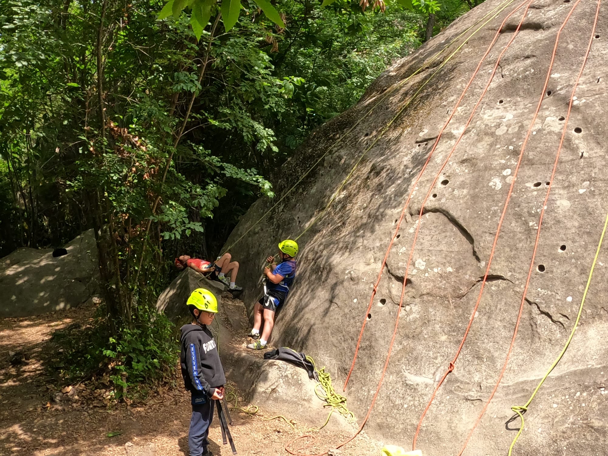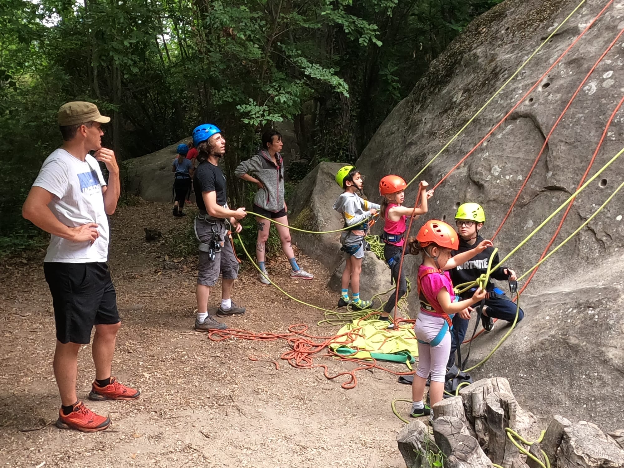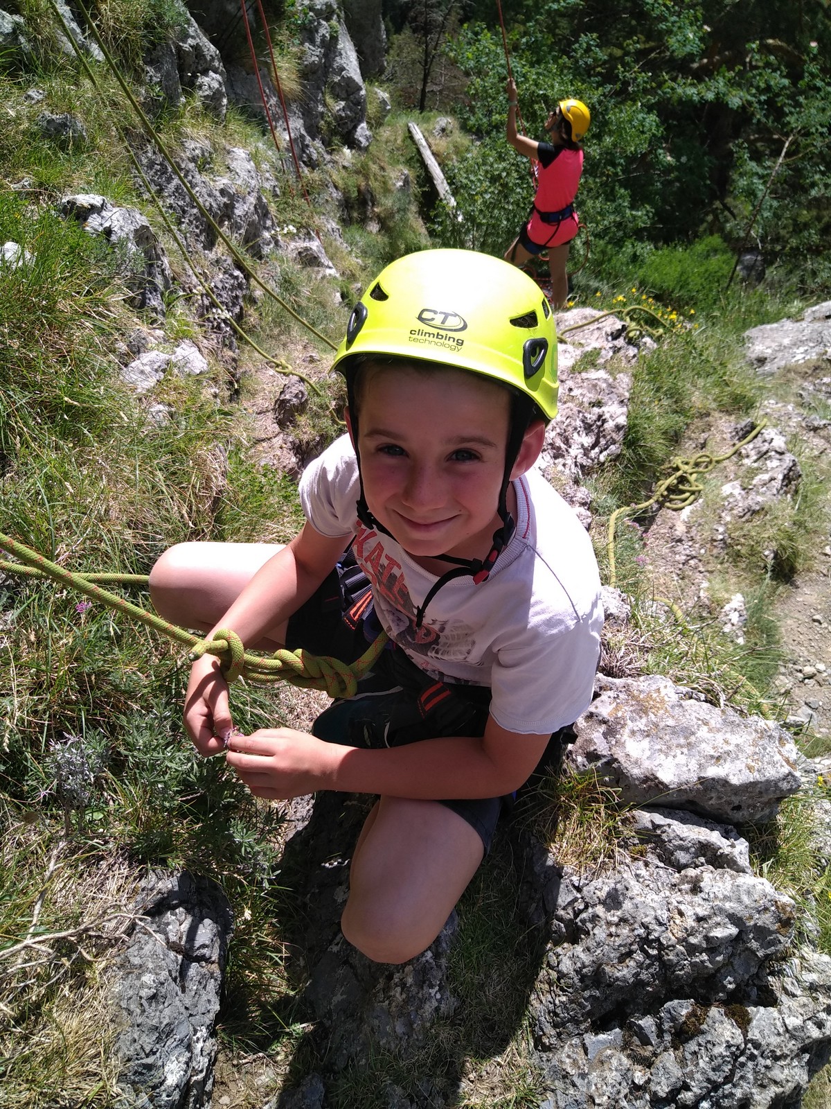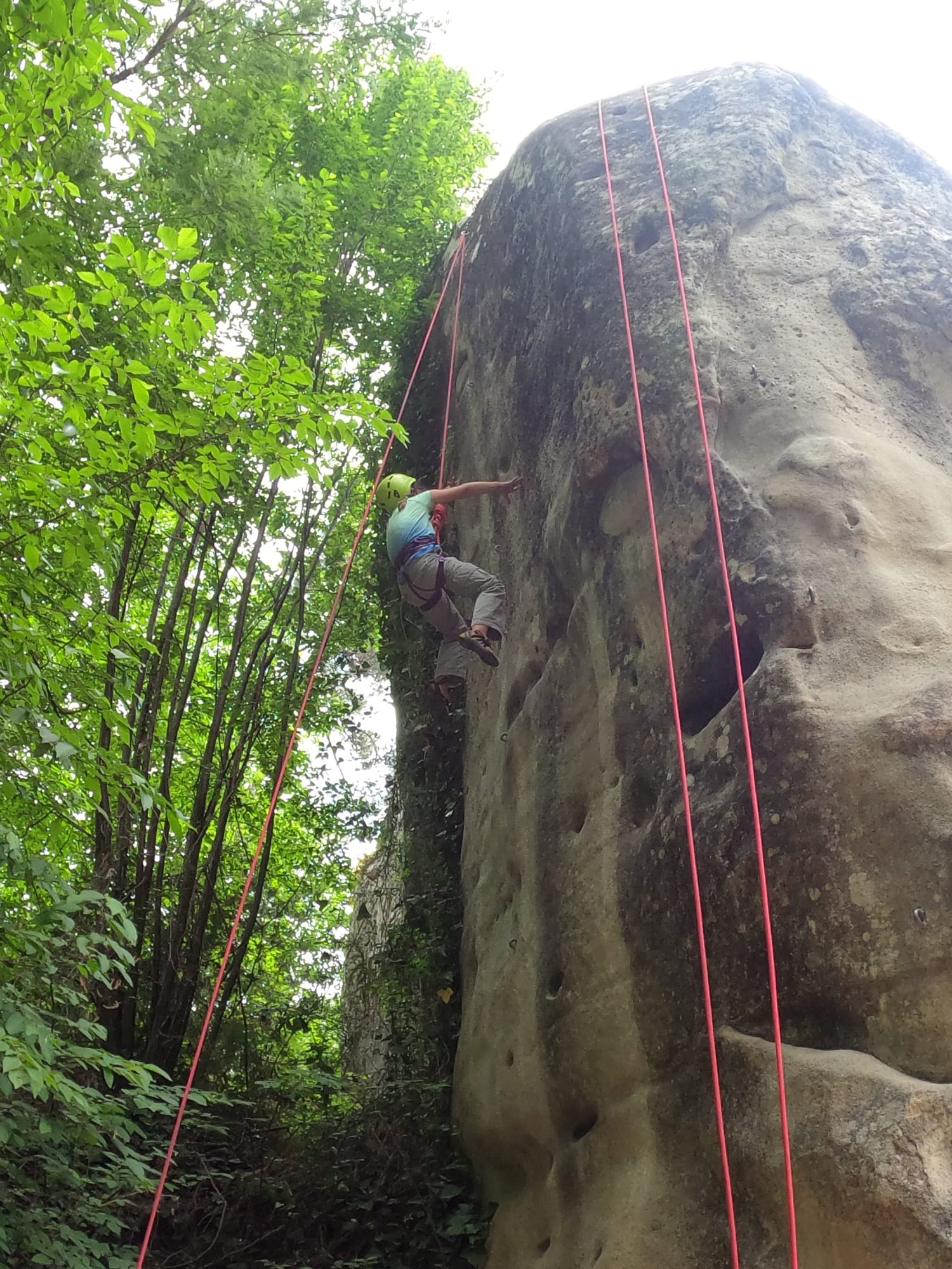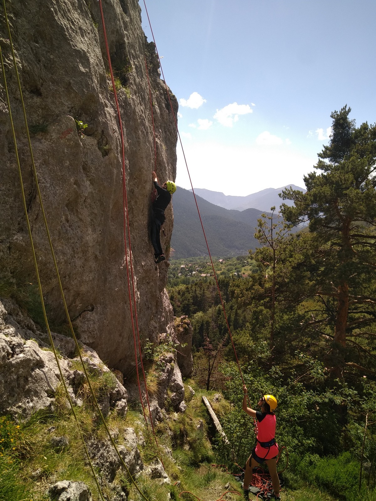 Un court trajet en voiture et une petite marche d’approche plus loin, nous voilà au pied du secteur, pas encore complètement à l’ombre mais pas loin. Les cordées s’organisent, le matériel aussi et c’est parti pour des voies de 2 ou 3 longueurs avec descente en rappel. Tout le monde y met du sien et se concentre sur la gestion du relais et des cordes. L’escalade est vraiment facile, et on se promène avec Sébastien sur les différents relais pour surveiller et donner quelques explications supplémentaires.
