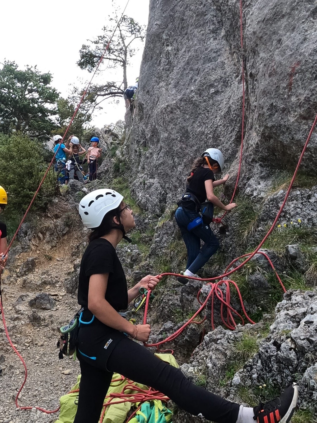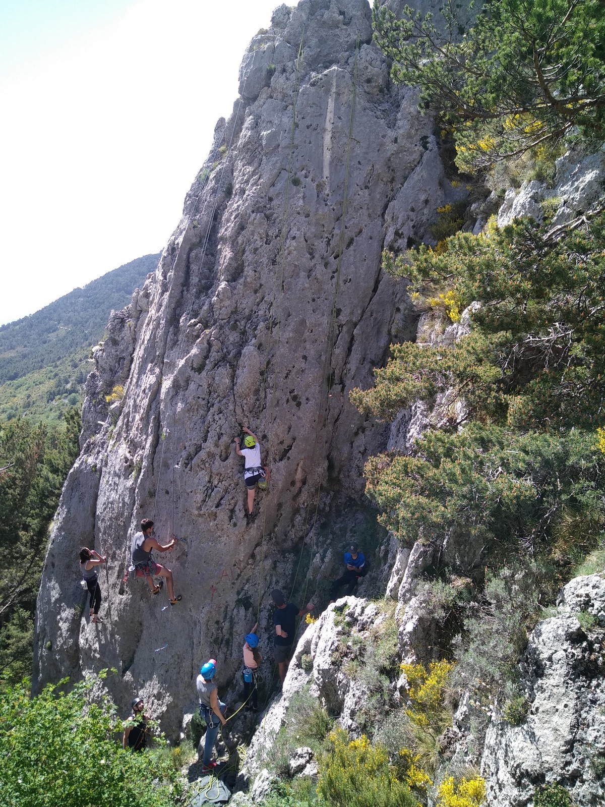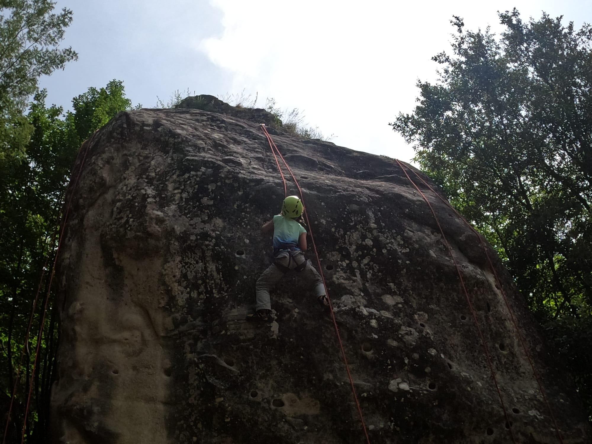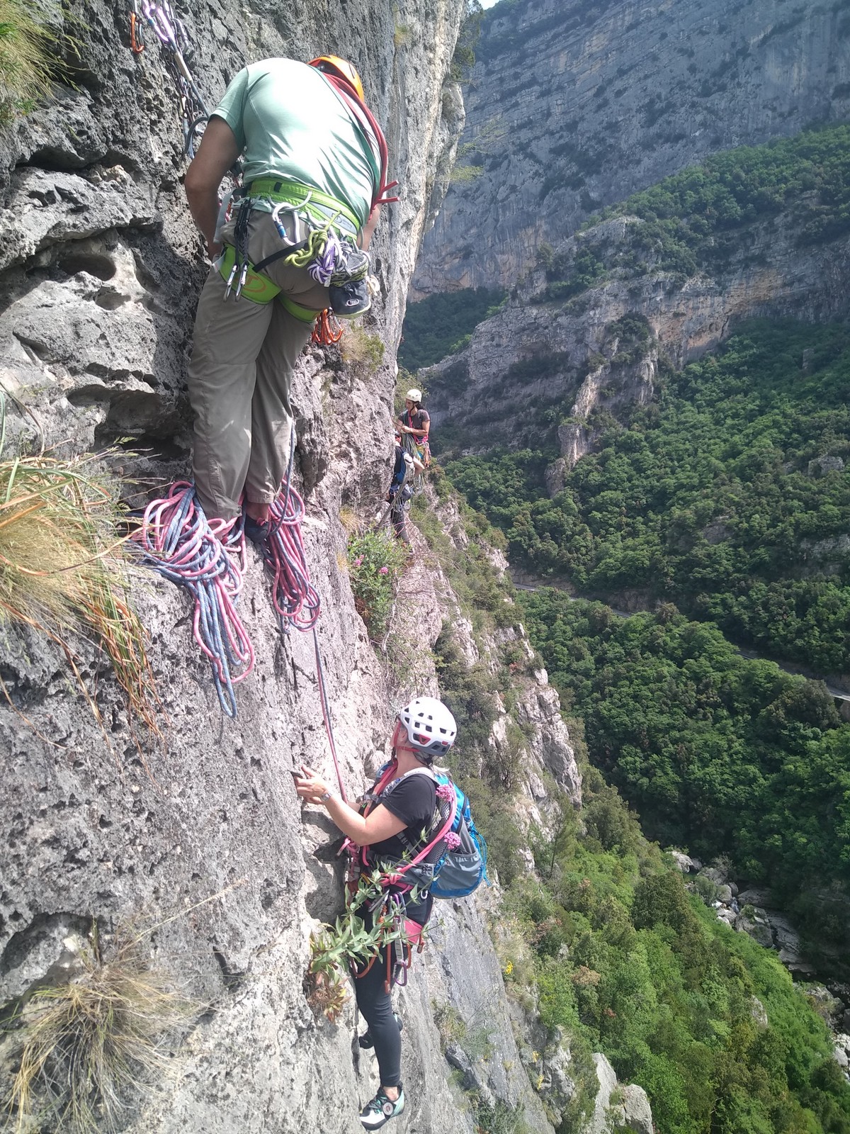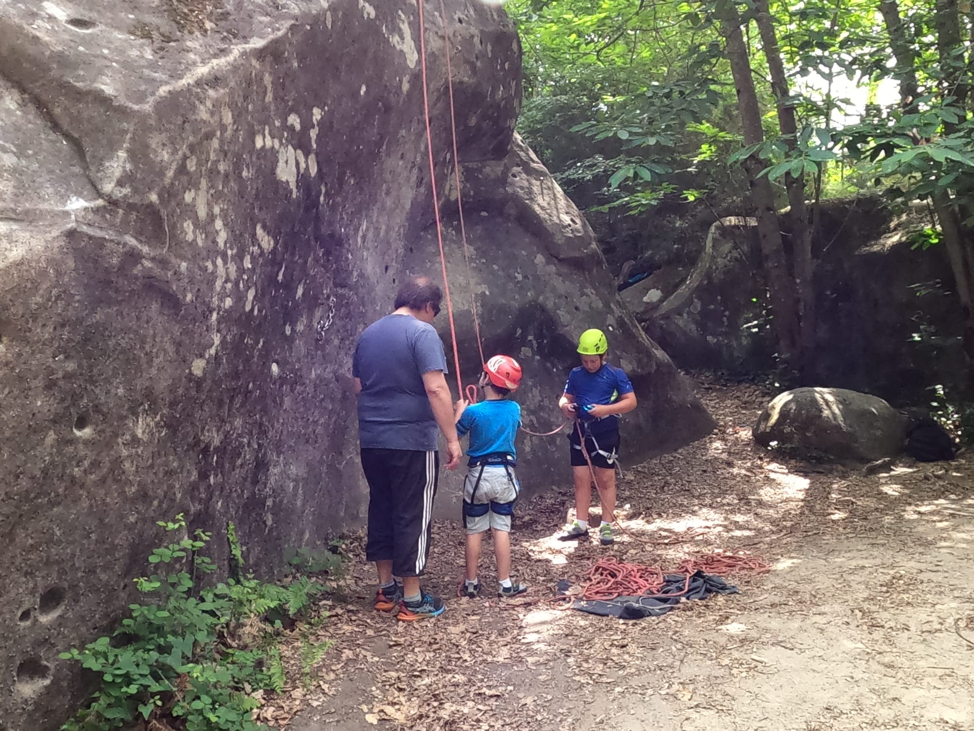 Un court trajet en voiture et une petite marche d’approche plus loin, nous voilà au pied du secteur, pas encore complètement à l’ombre mais pas loin. Les cordées s’organisent, le matériel aussi et c’est parti pour des voies de 2 ou 3 longueurs avec descente en rappel. Tout le monde y met du sien et se concentre sur la gestion du relais et des cordes. L’escalade est vraiment facile, et on se promène avec Sébastien sur les différents relais pour surveiller et donner quelques explications supplémentaires.