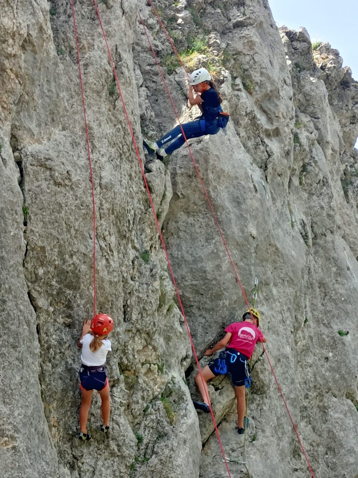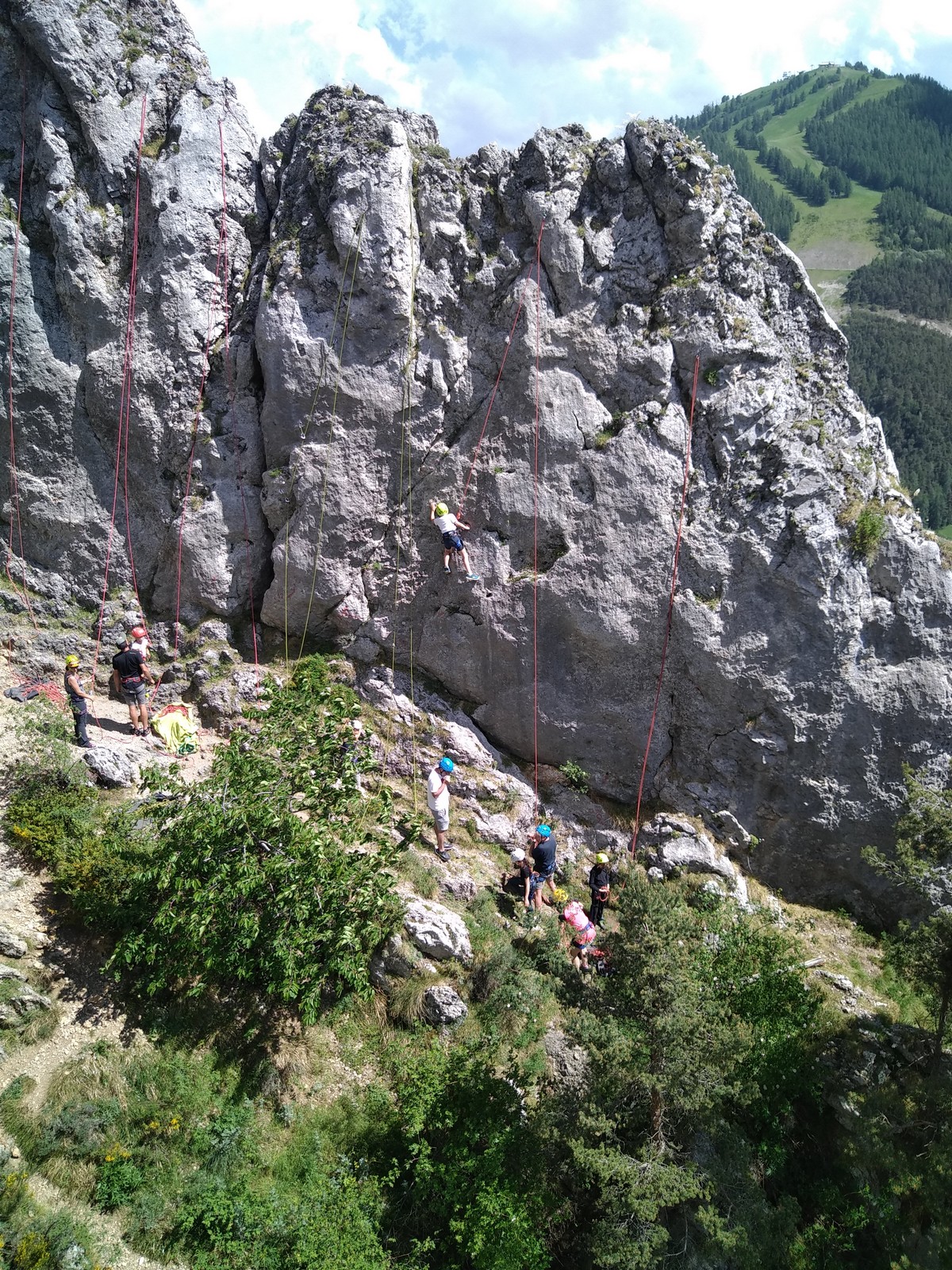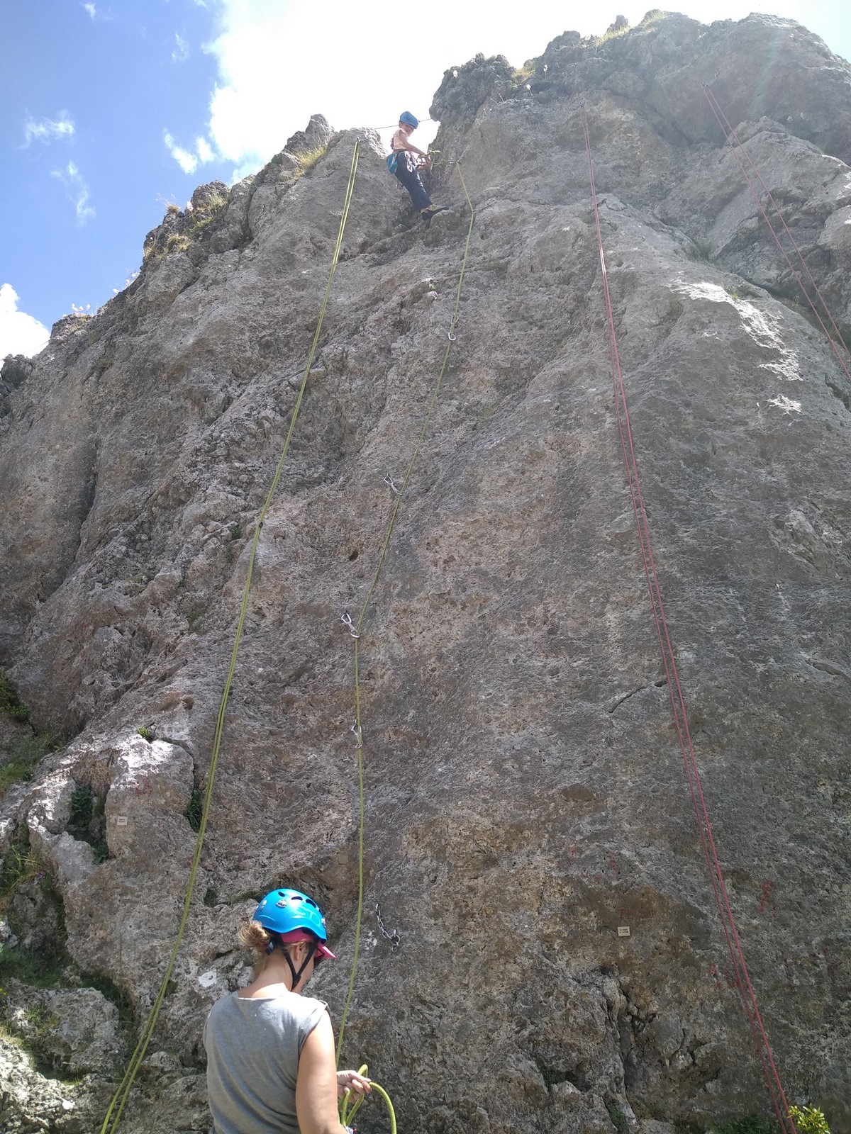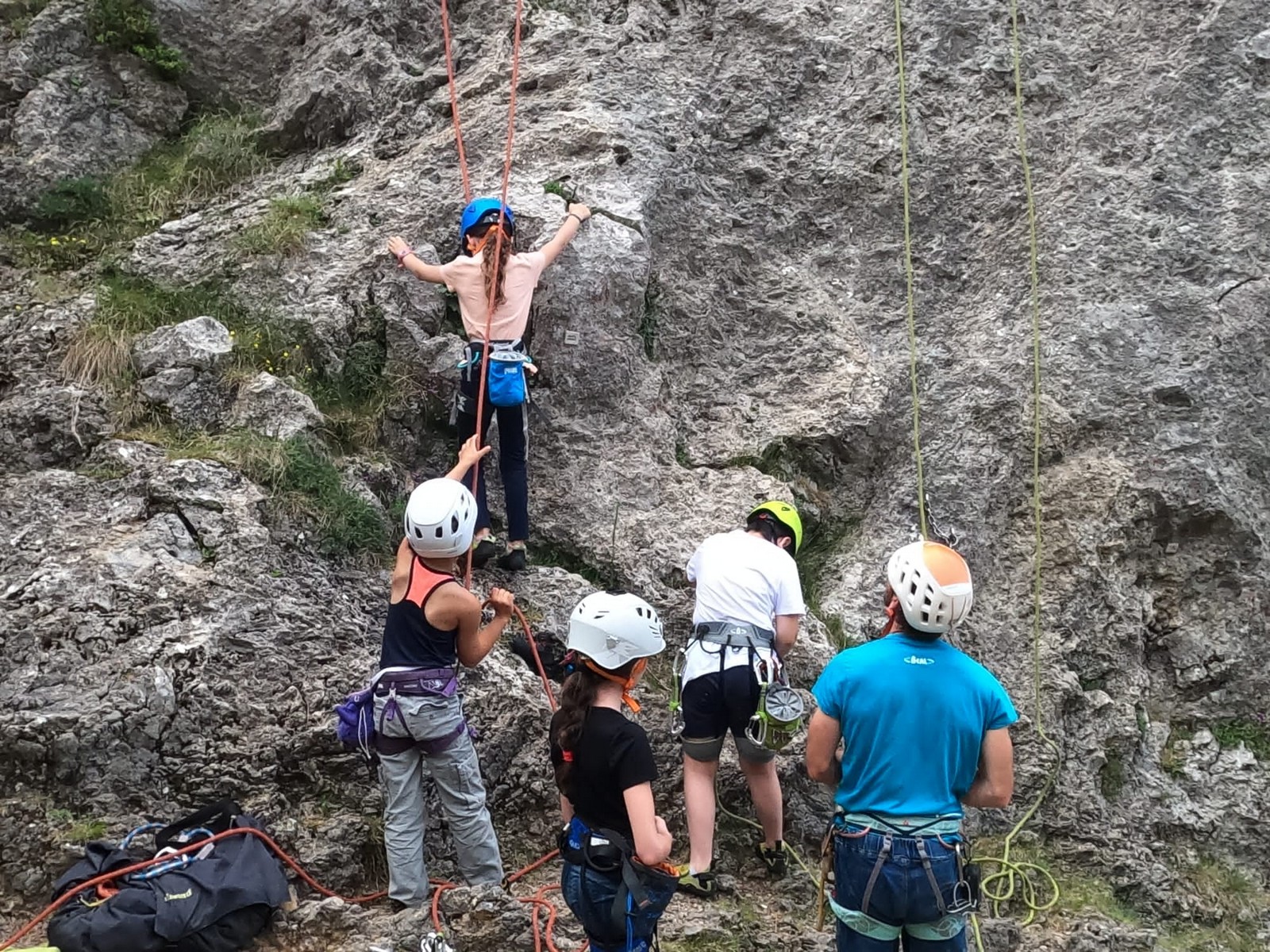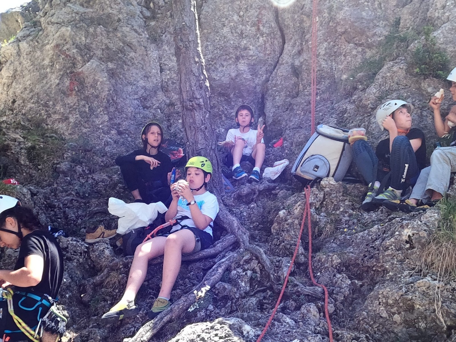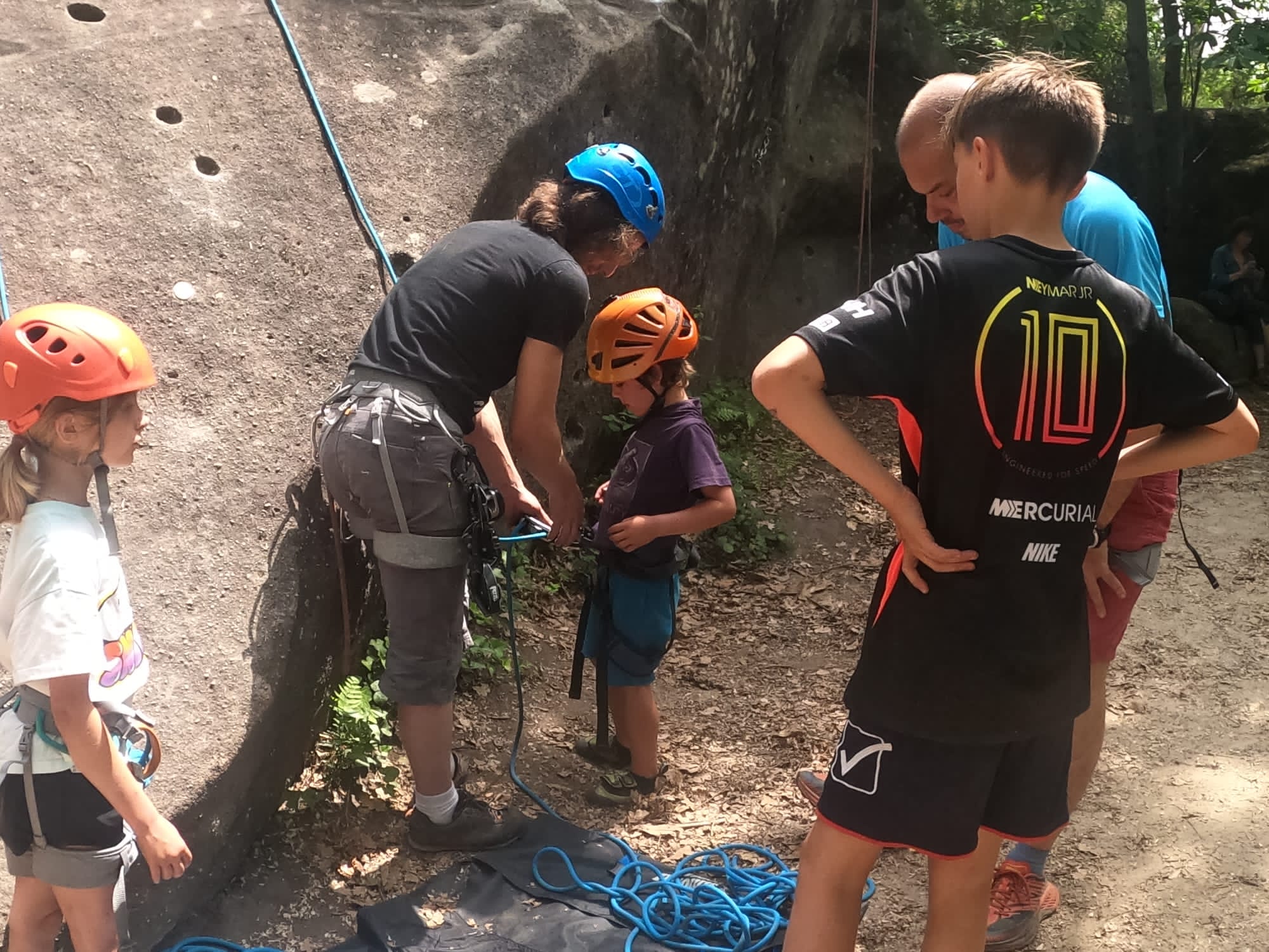 Un court trajet en voiture et une petite marche d’approche plus loin, nous voilà au pied du secteur, pas encore complètement à l’ombre mais pas loin. Les cordées s’organisent, le matériel aussi et c’est parti pour des voies de 2 ou 3 longueurs avec descente en rappel. Tout le monde y met du sien et se concentre sur la gestion du relais et des cordes. L’escalade est vraiment facile, et on se promène avec Sébastien sur les différents relais pour surveiller et donner quelques explications supplémentaires.