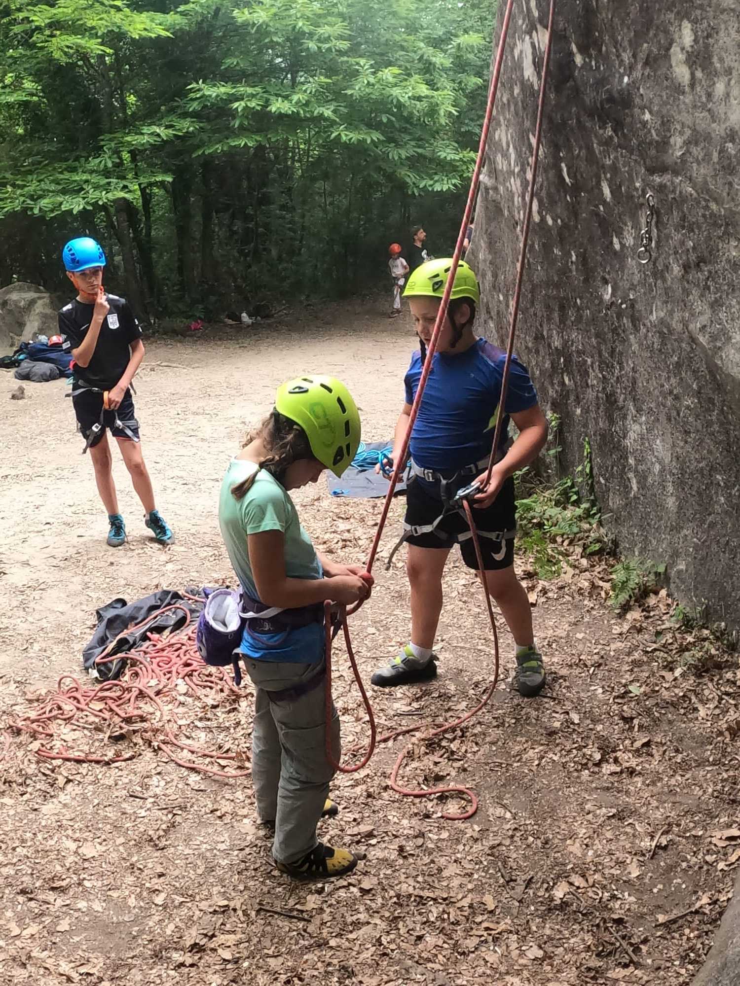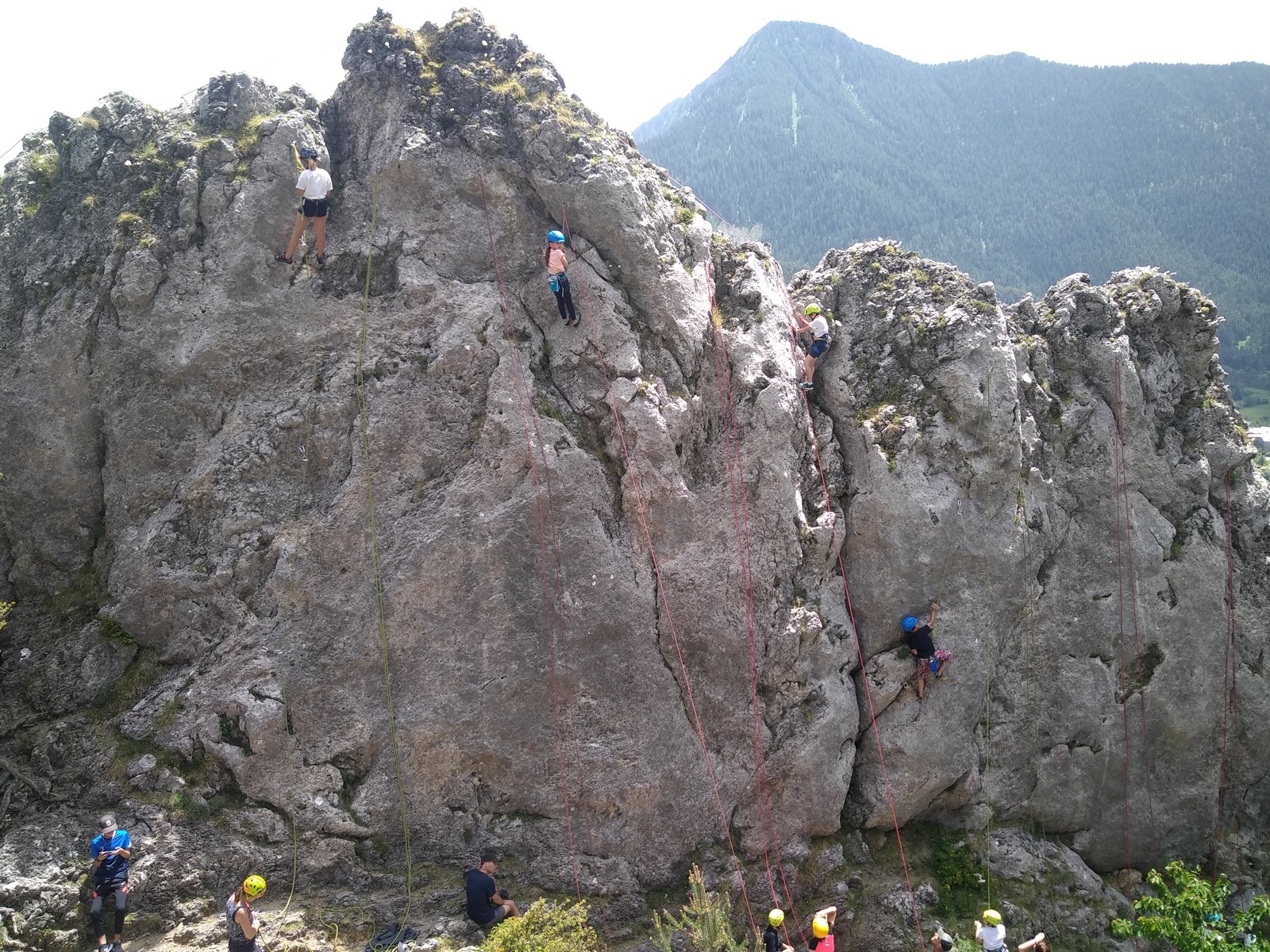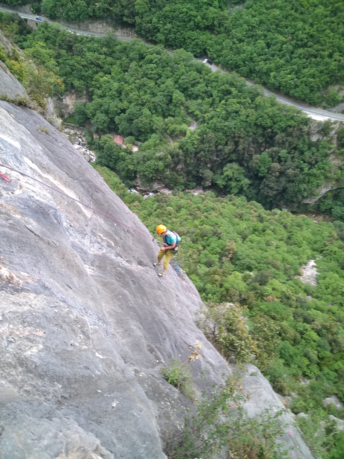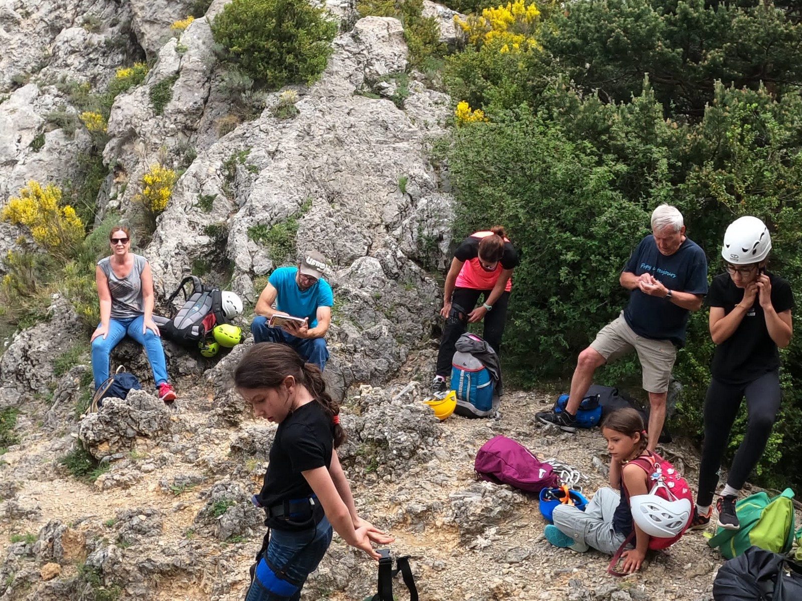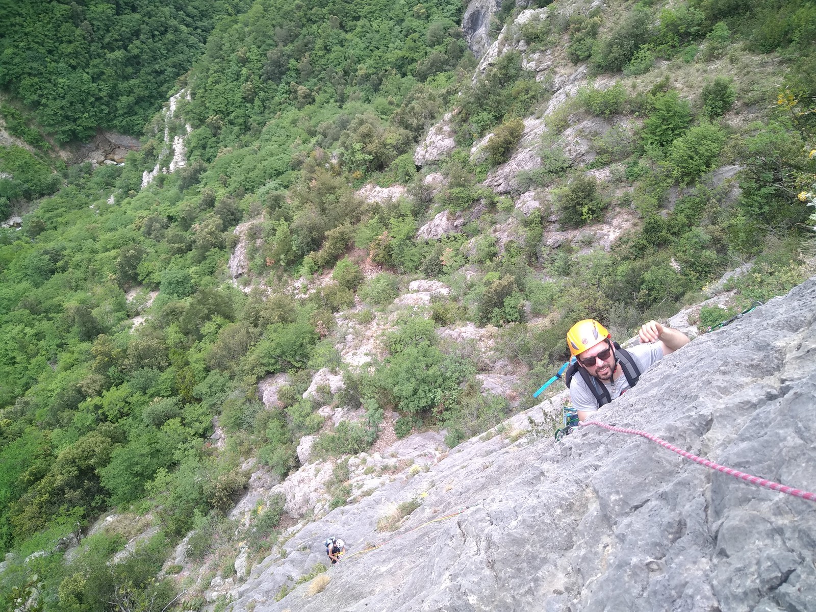 Un court trajet en voiture et une petite marche d’approche plus loin, nous voilà au pied du secteur, pas encore complètement à l’ombre mais pas loin. Les cordées s’organisent, le matériel aussi et c’est parti pour des voies de 2 ou 3 longueurs avec descente en rappel. Tout le monde y met du sien et se concentre sur la gestion du relais et des cordes. L’escalade est vraiment facile, et on se promène avec Sébastien sur les différents relais pour surveiller et donner quelques explications supplémentaires.