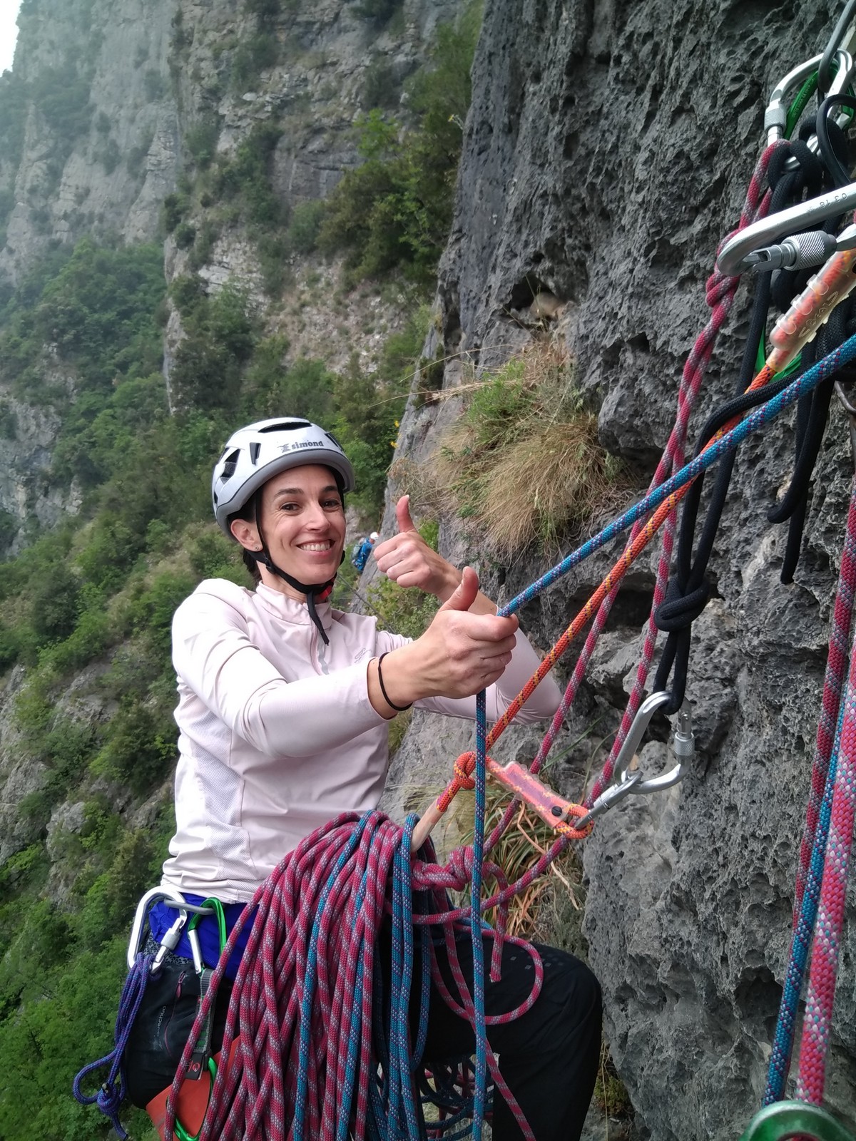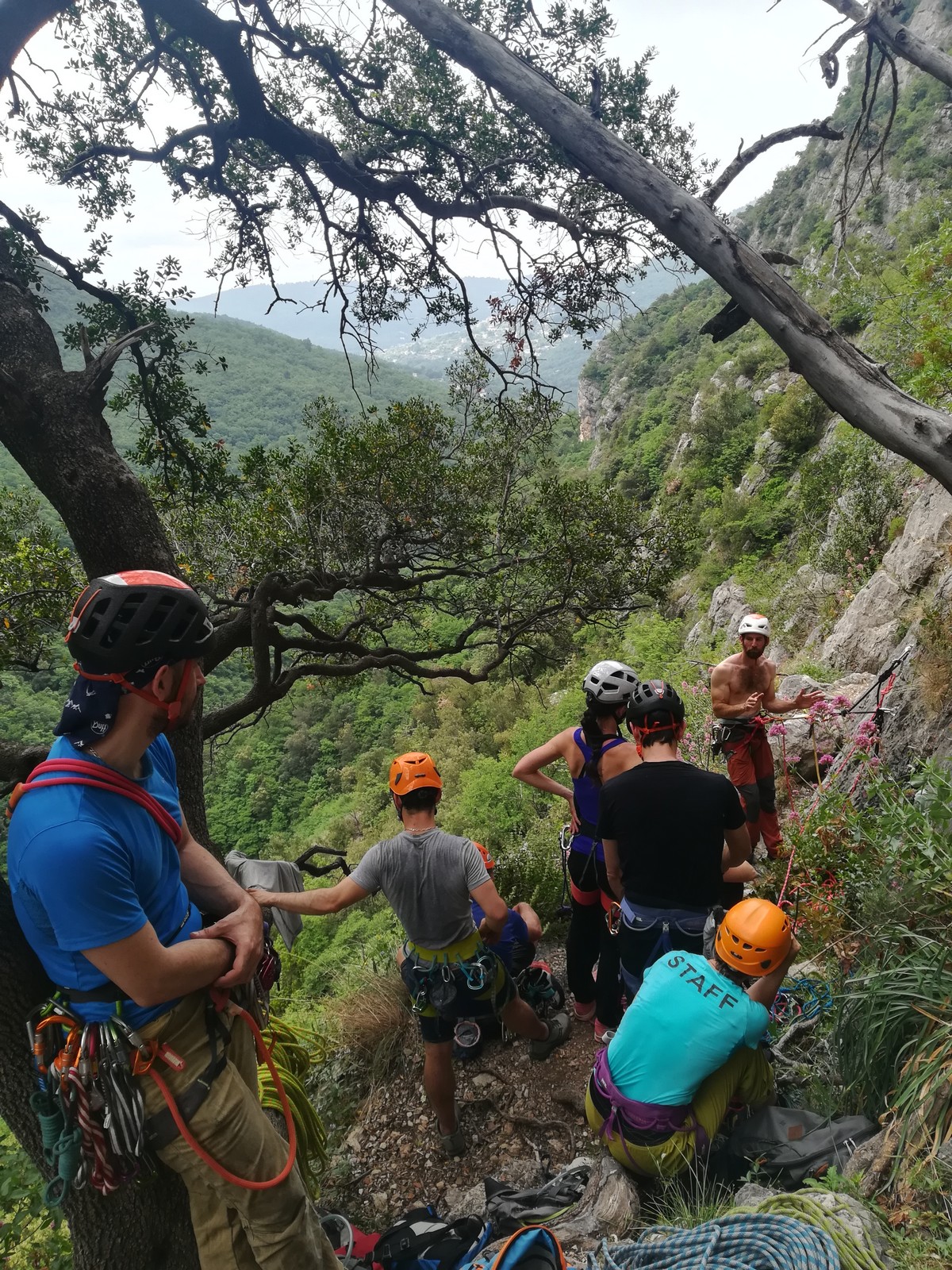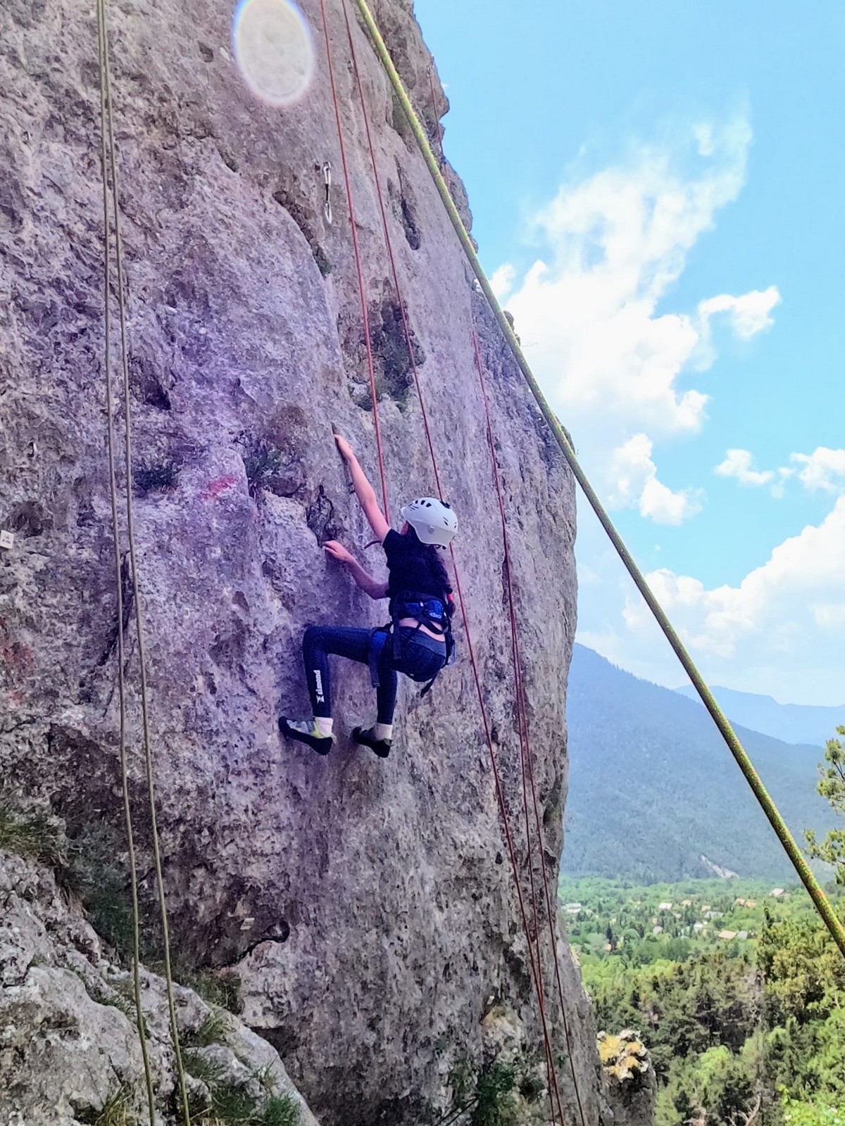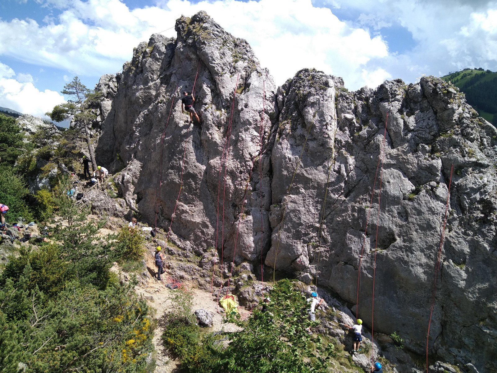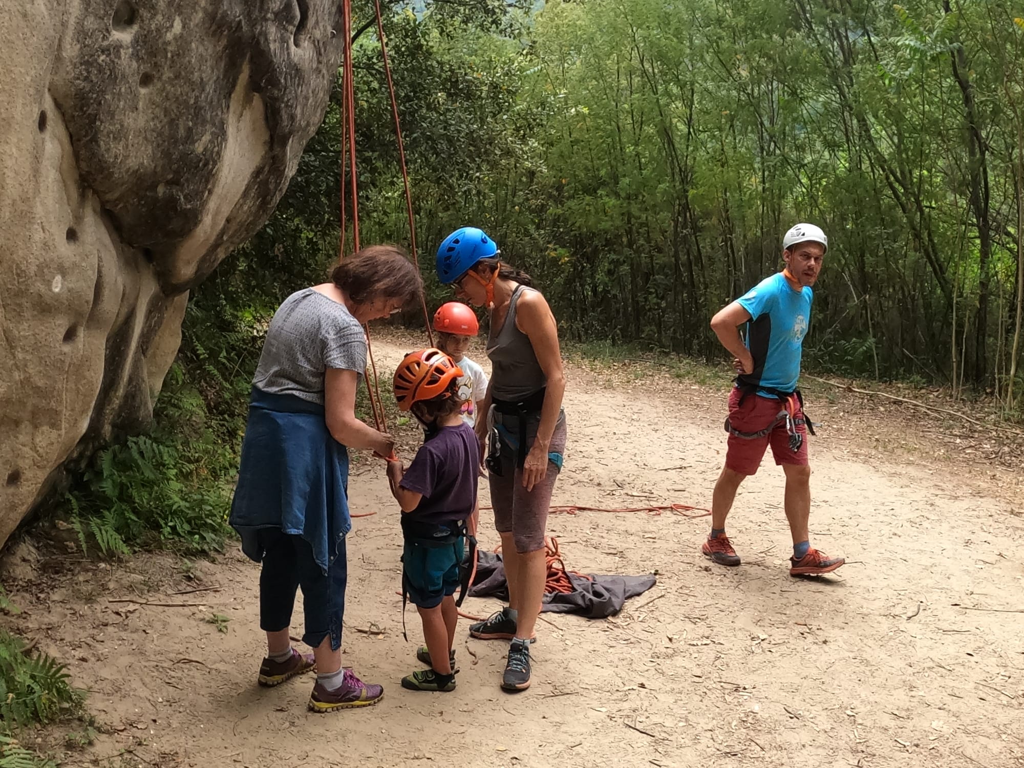 Un court trajet en voiture et une petite marche d’approche plus loin, nous voilà au pied du secteur, pas encore complètement à l’ombre mais pas loin. Les cordées s’organisent, le matériel aussi et c’est parti pour des voies de 2 ou 3 longueurs avec descente en rappel. Tout le monde y met du sien et se concentre sur la gestion du relais et des cordes. L’escalade est vraiment facile, et on se promène avec Sébastien sur les différents relais pour surveiller et donner quelques explications supplémentaires.