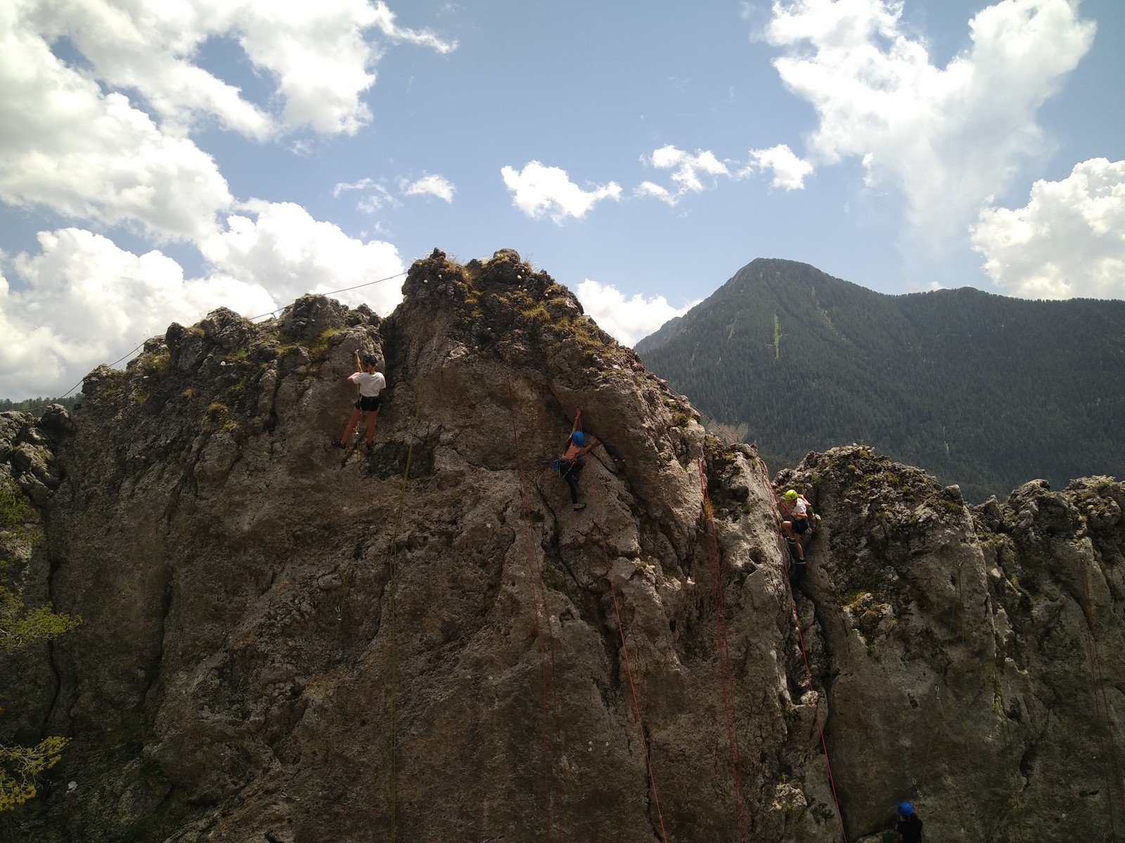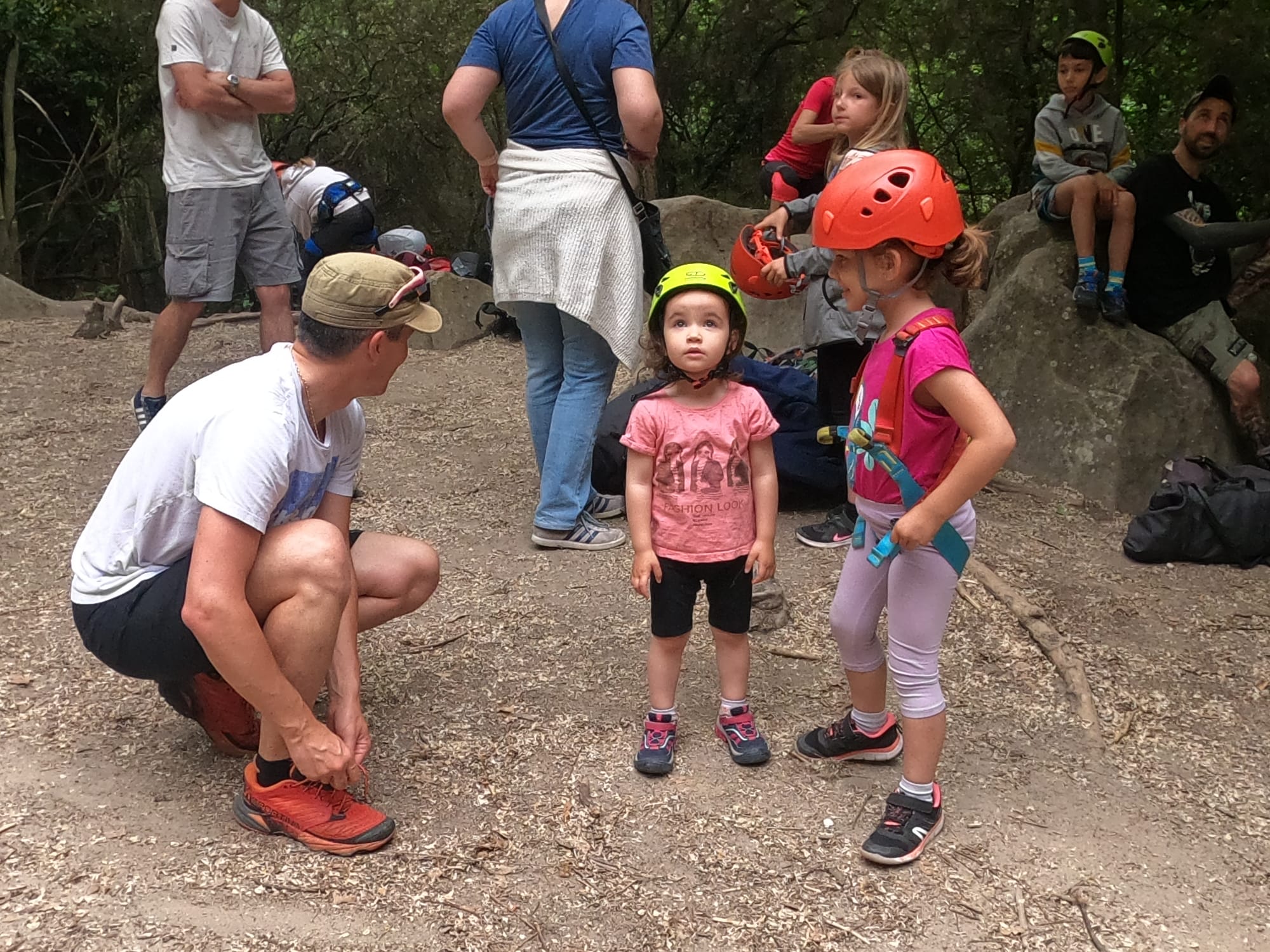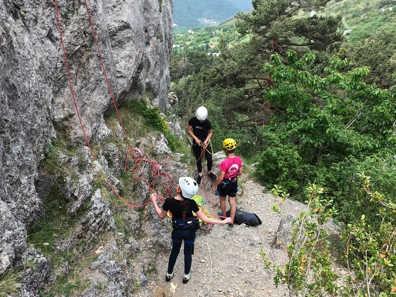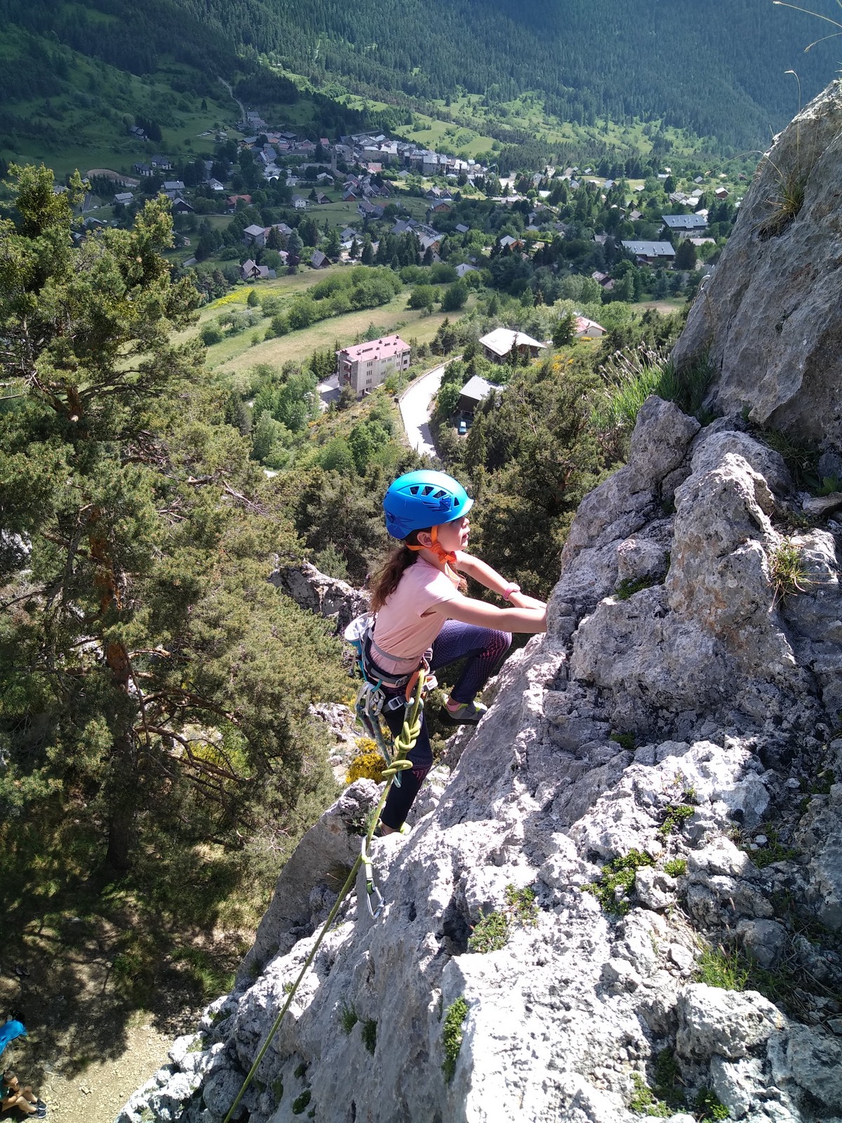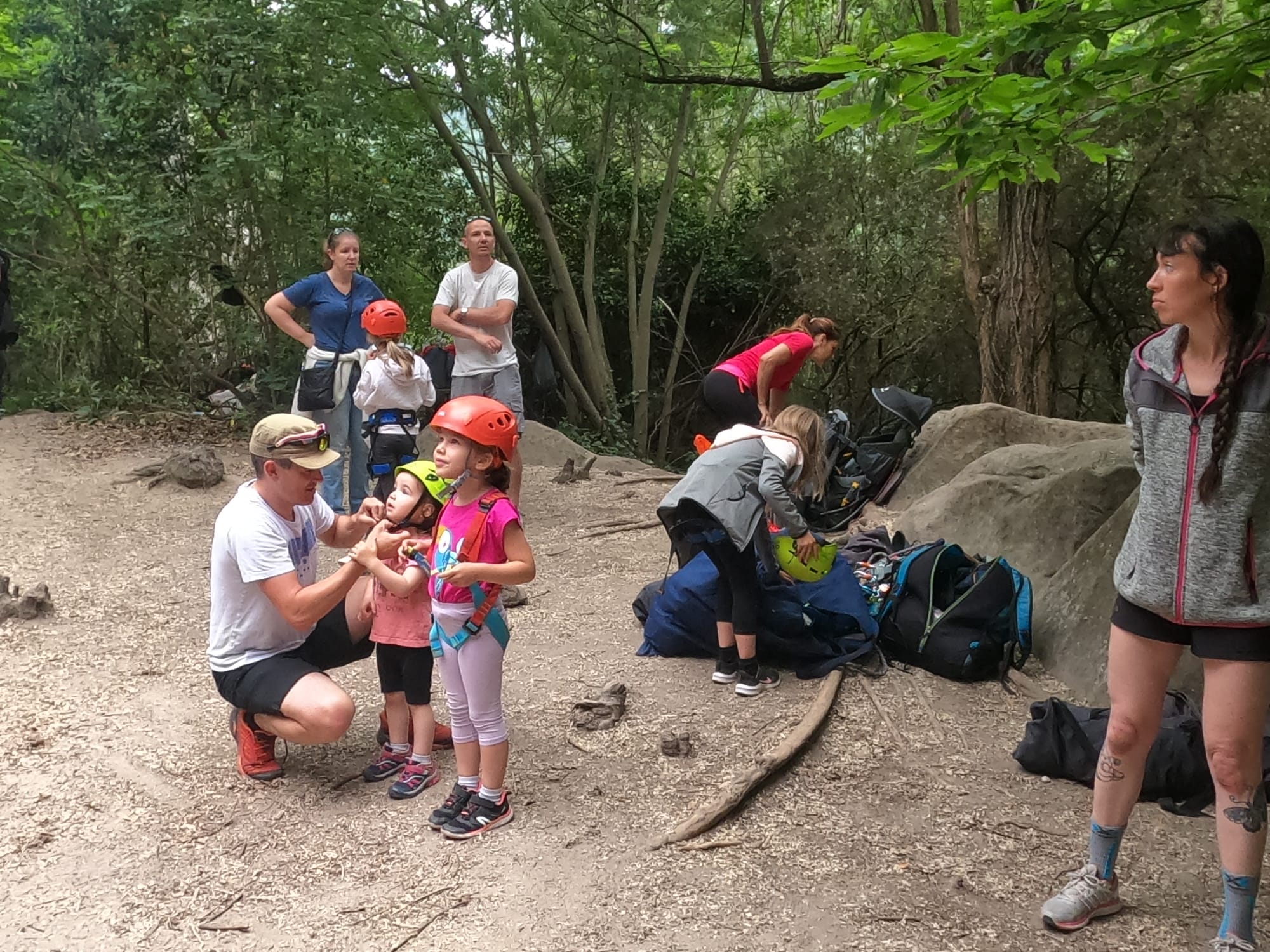 Un court trajet en voiture et une petite marche d’approche plus loin, nous voilà au pied du secteur, pas encore complètement à l’ombre mais pas loin. Les cordées s’organisent, le matériel aussi et c’est parti pour des voies de 2 ou 3 longueurs avec descente en rappel. Tout le monde y met du sien et se concentre sur la gestion du relais et des cordes. L’escalade est vraiment facile, et on se promène avec Sébastien sur les différents relais pour surveiller et donner quelques explications supplémentaires.