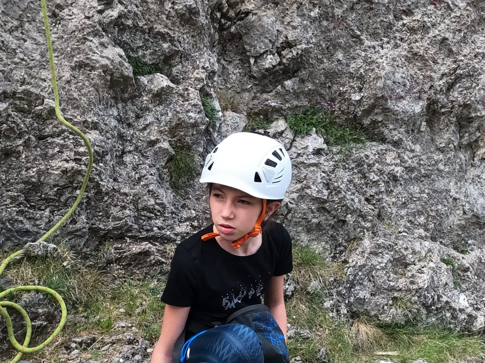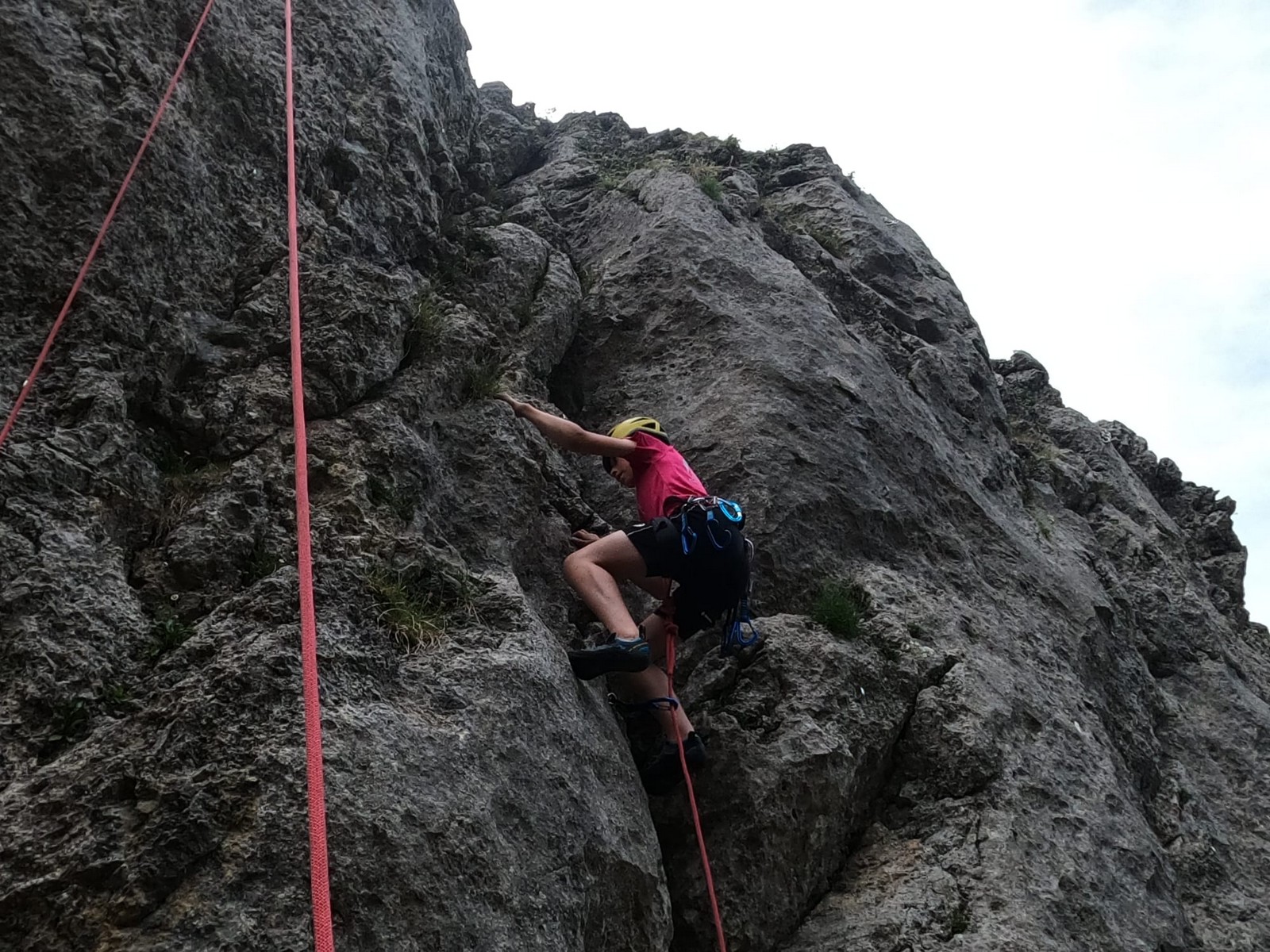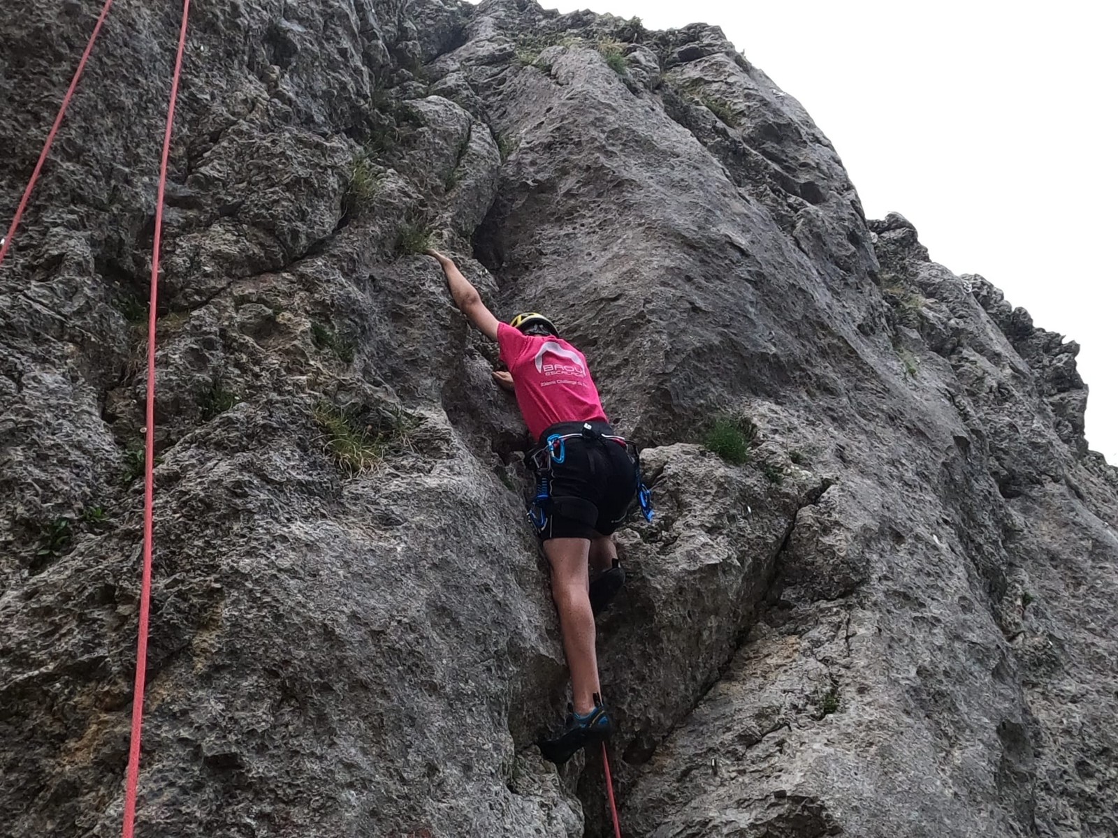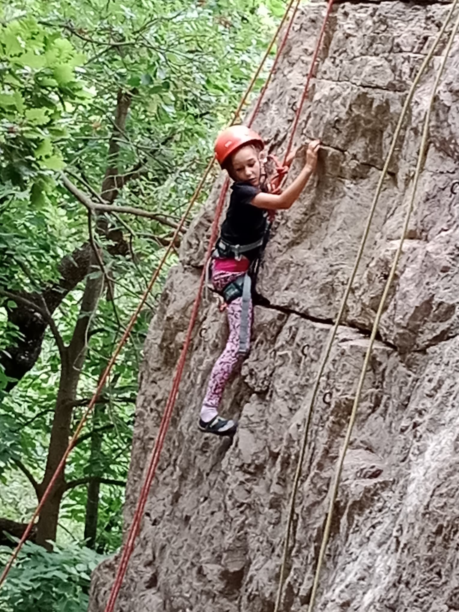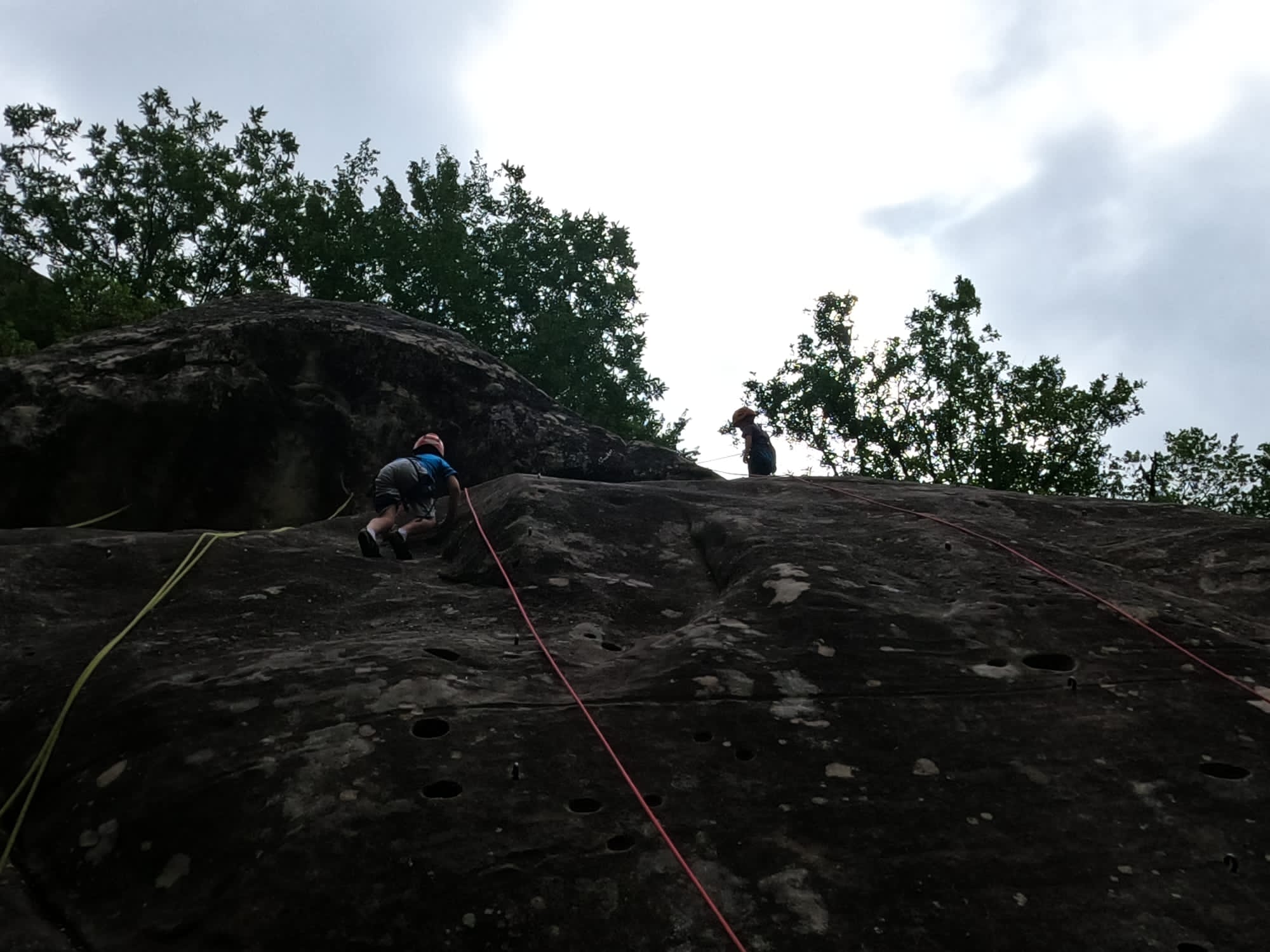 Un court trajet en voiture et une petite marche d’approche plus loin, nous voilà au pied du secteur, pas encore complètement à l’ombre mais pas loin. Les cordées s’organisent, le matériel aussi et c’est parti pour des voies de 2 ou 3 longueurs avec descente en rappel. Tout le monde y met du sien et se concentre sur la gestion du relais et des cordes. L’escalade est vraiment facile, et on se promène avec Sébastien sur les différents relais pour surveiller et donner quelques explications supplémentaires.