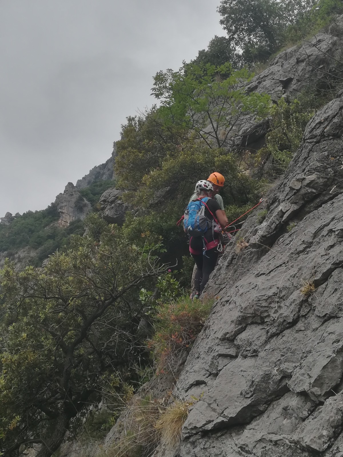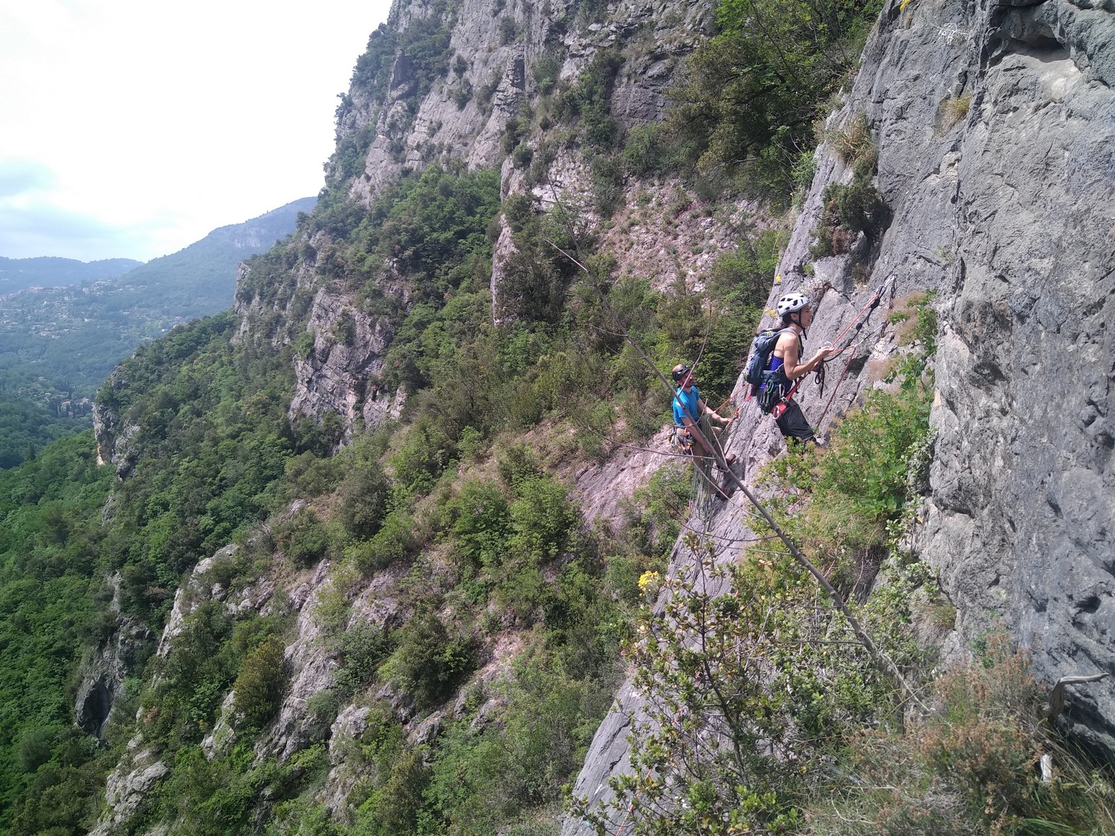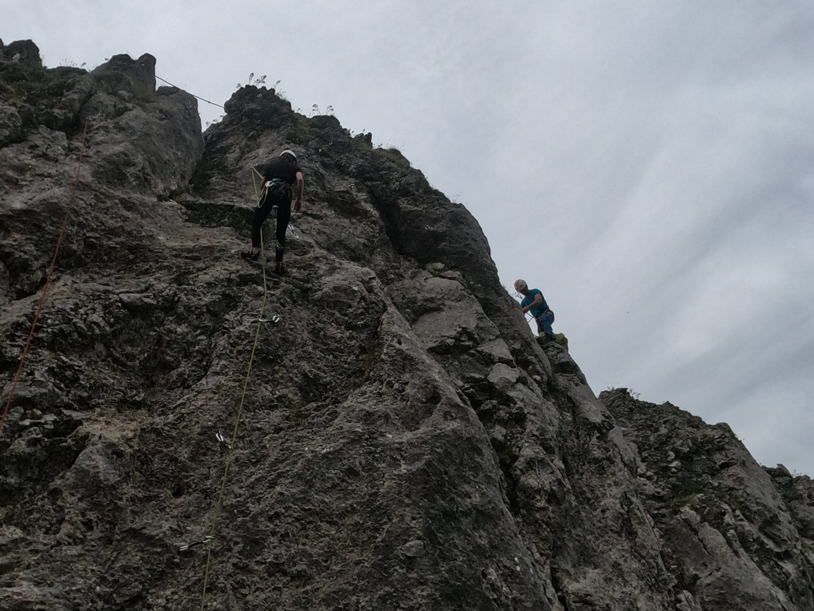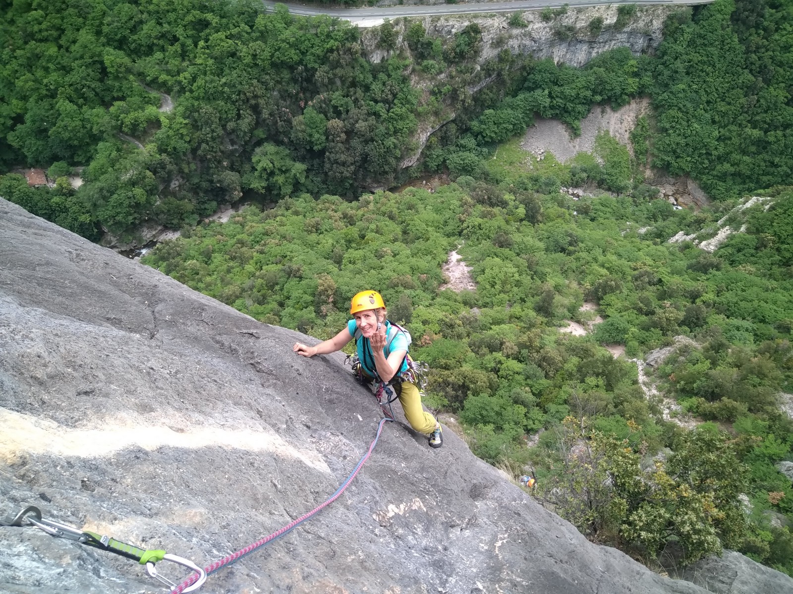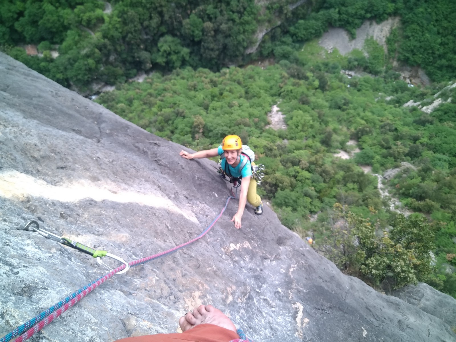 Cécile et Djé s’attaquent au « Pèlerin de Compostelle », 90m, 6a max, suivis par Phil et Hélène.