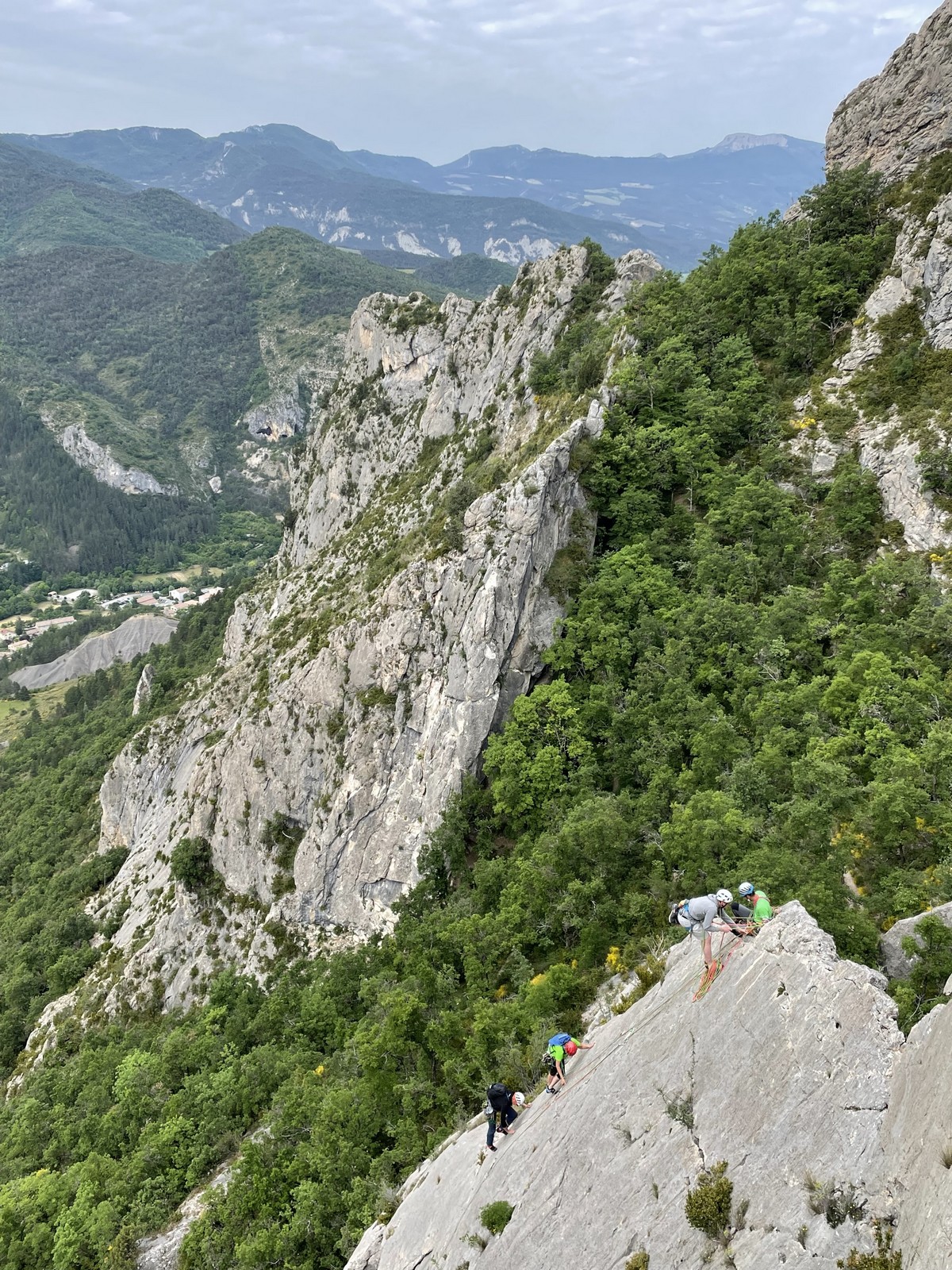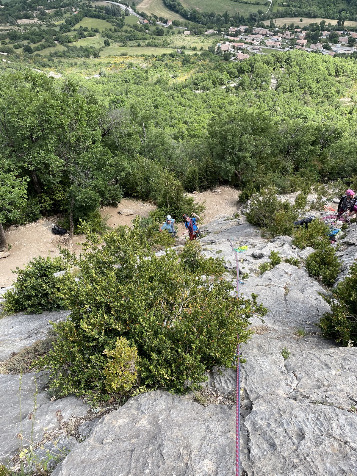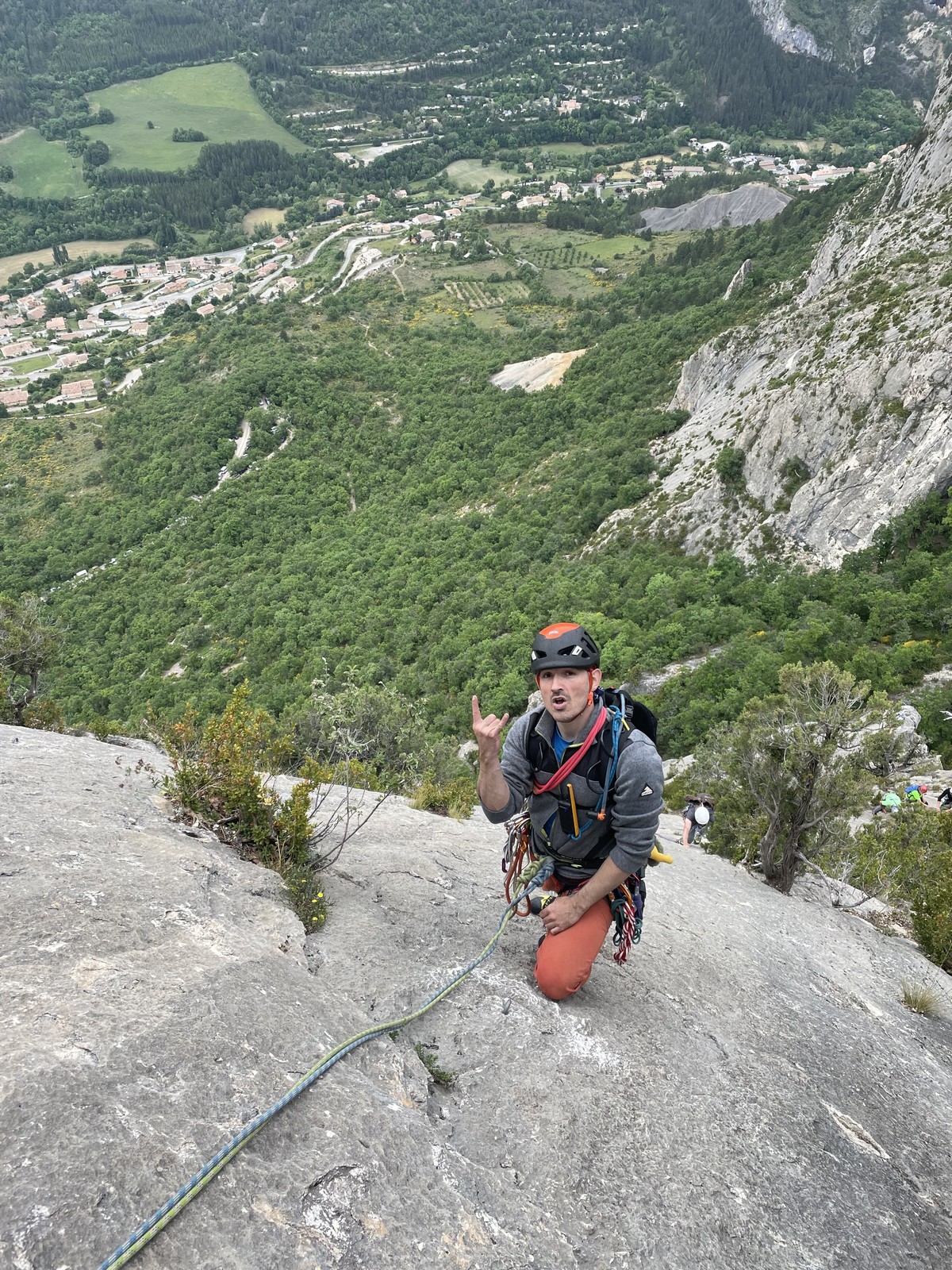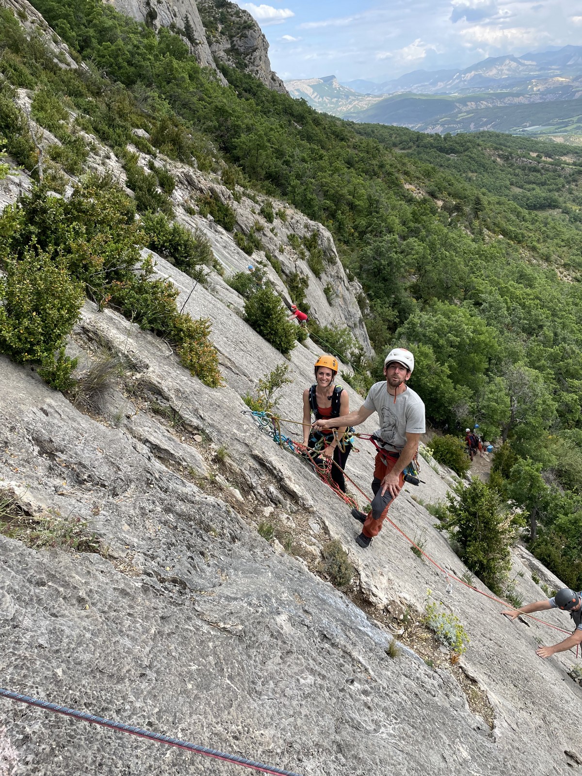 Les stagiaires sont fatigués et ce sont souvent les plus expérimentés qui gardent la tête dans les cordées. Ça nous permet aussi d’avancer assez vite et comme j’étais dans le coin la veille, j’ai pu repérer un peu les relais et les itinéraires un peu paumatoires parfois. Comme on est tous proches, c’est assez fun. On s’entraide, on se guide, ça fonctionne bien. Nous sortons tous plus ou moins en même temps au sommet peu après midi. Les visages sont épuisés, mais les sourires radieux. Nous avons grimpé de très belles voies et la réputation d’Orpierre n’est pas usurpée. Nous retournons au camping pour rejoindre Sandra qui, en fée du logis, a travaillé fort. Reste à plier le barnum et organiser le matos dans les voitures. Il est 14h quand nous décollons pour un retour à la vraie vie !