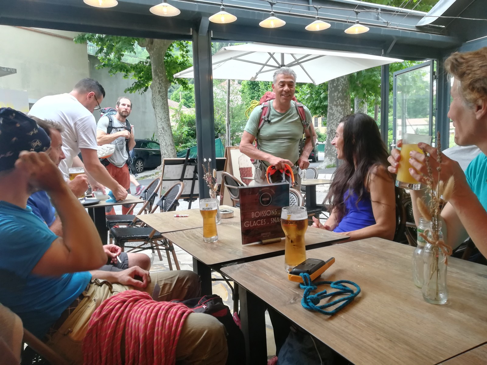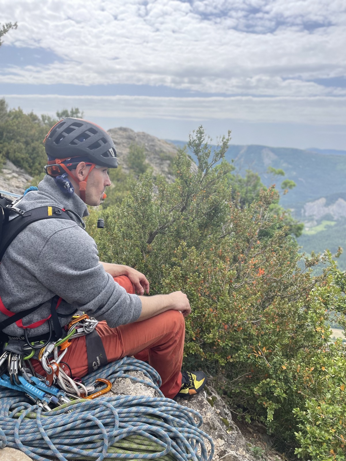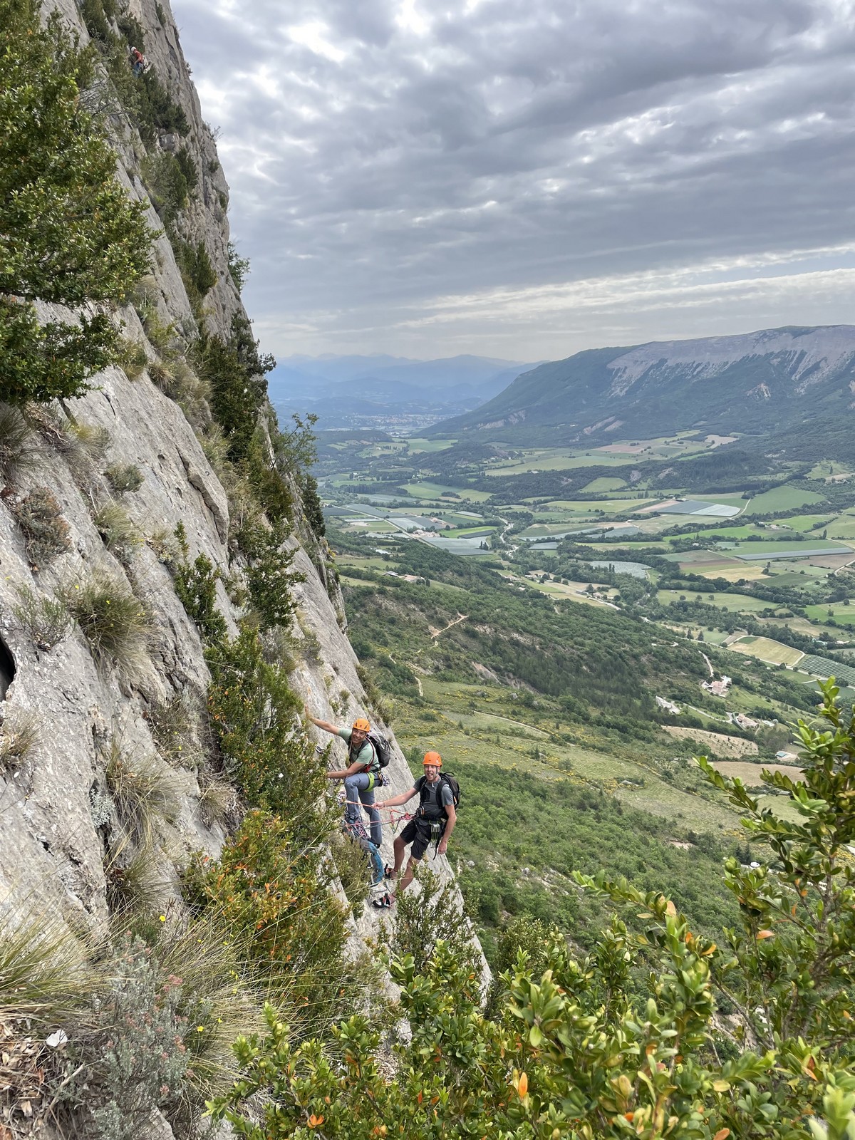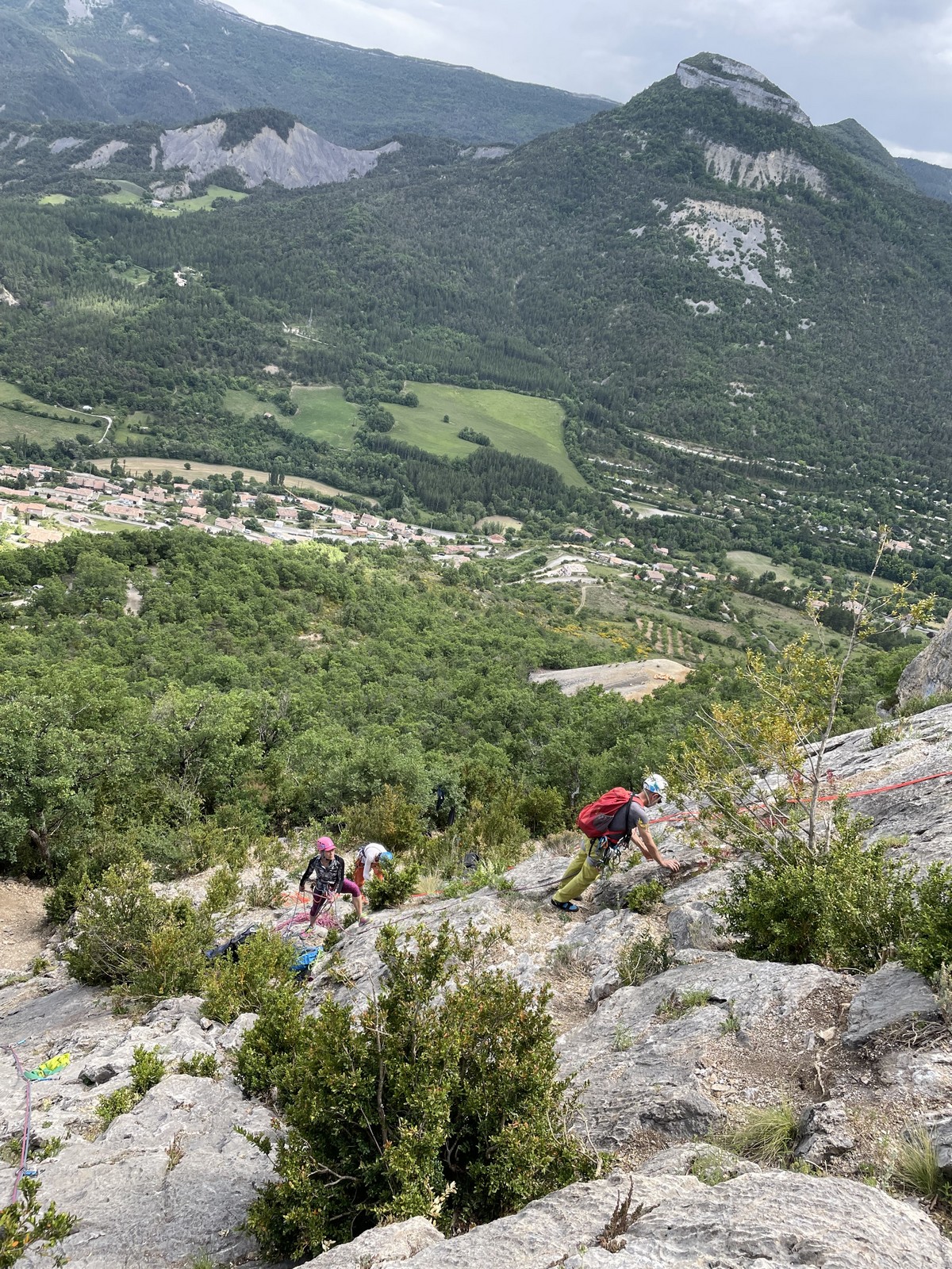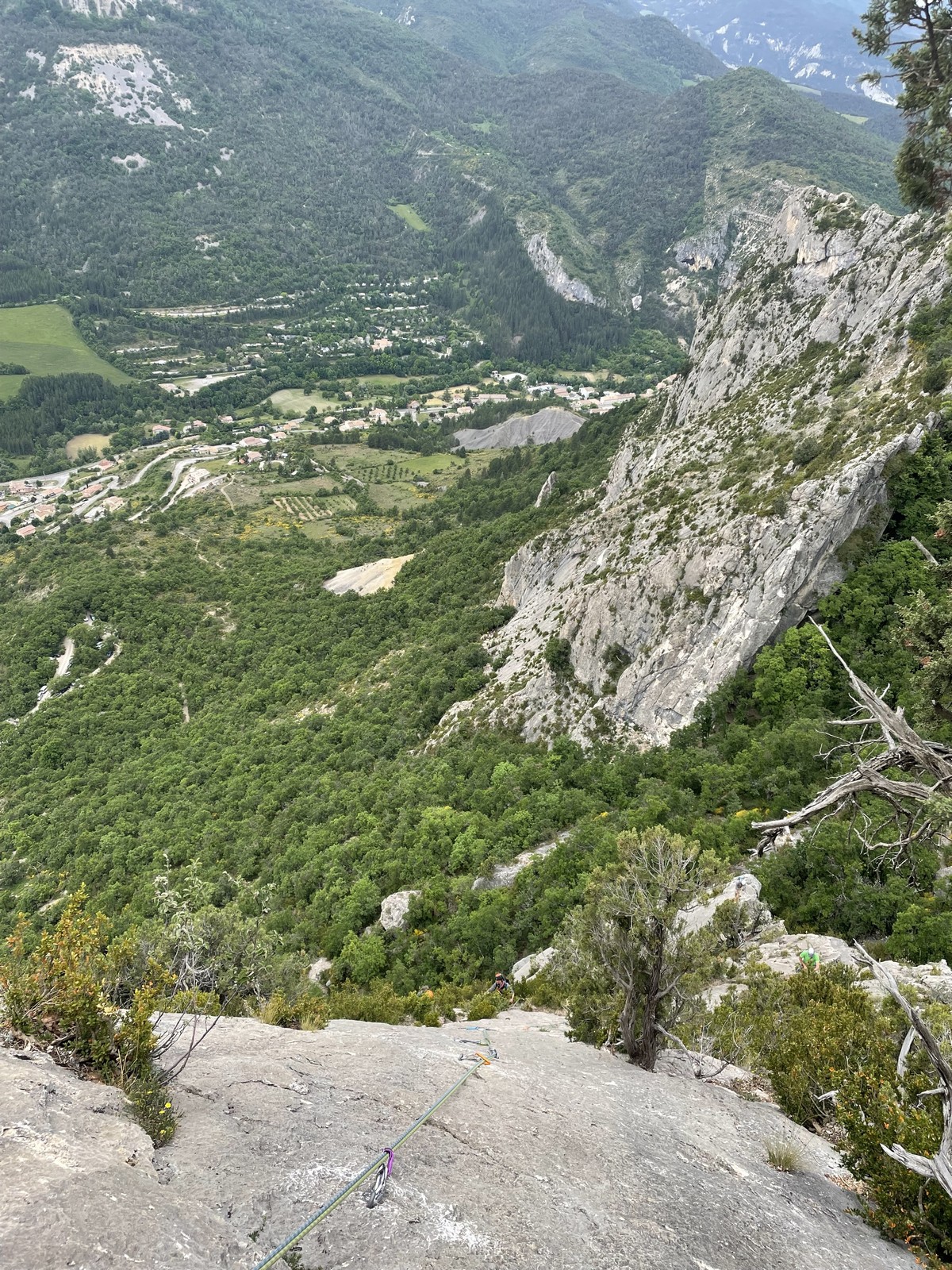 Les stagiaires sont fatigués et ce sont souvent les plus expérimentés qui gardent la tête dans les cordées. Ça nous permet aussi d’avancer assez vite et comme j’étais dans le coin la veille, j’ai pu repérer un peu les relais et les itinéraires un peu paumatoires parfois. Comme on est tous proches, c’est assez fun. On s’entraide, on se guide, ça fonctionne bien. Nous sortons tous plus ou moins en même temps au sommet peu après midi. Les visages sont épuisés, mais les sourires radieux. Nous avons grimpé de très belles voies et la réputation d’Orpierre n’est pas usurpée. Nous retournons au camping pour rejoindre Sandra qui, en fée du logis, a travaillé fort. Reste à plier le barnum et organiser le matos dans les voitures. Il est 14h quand nous décollons pour un retour à la vraie vie !