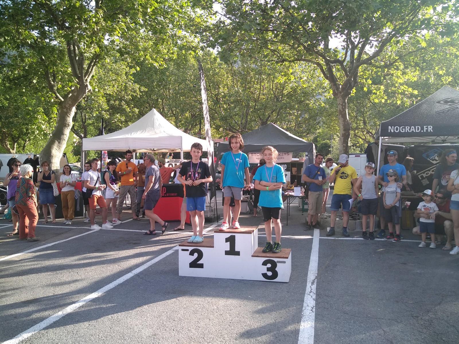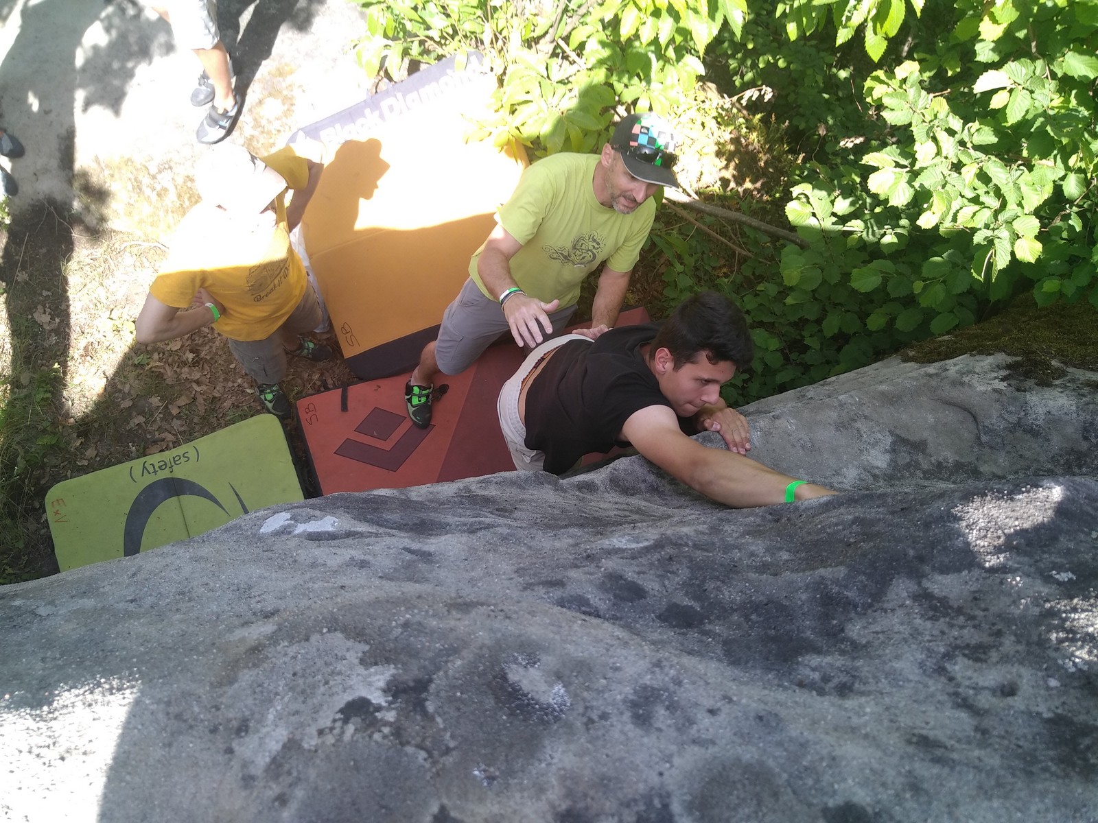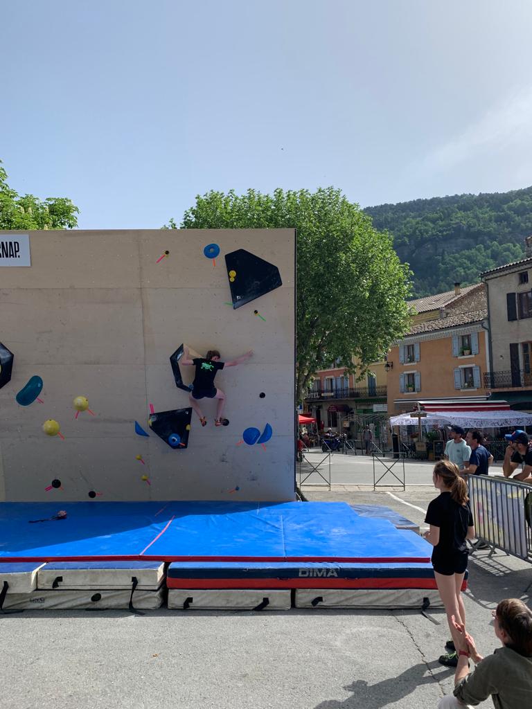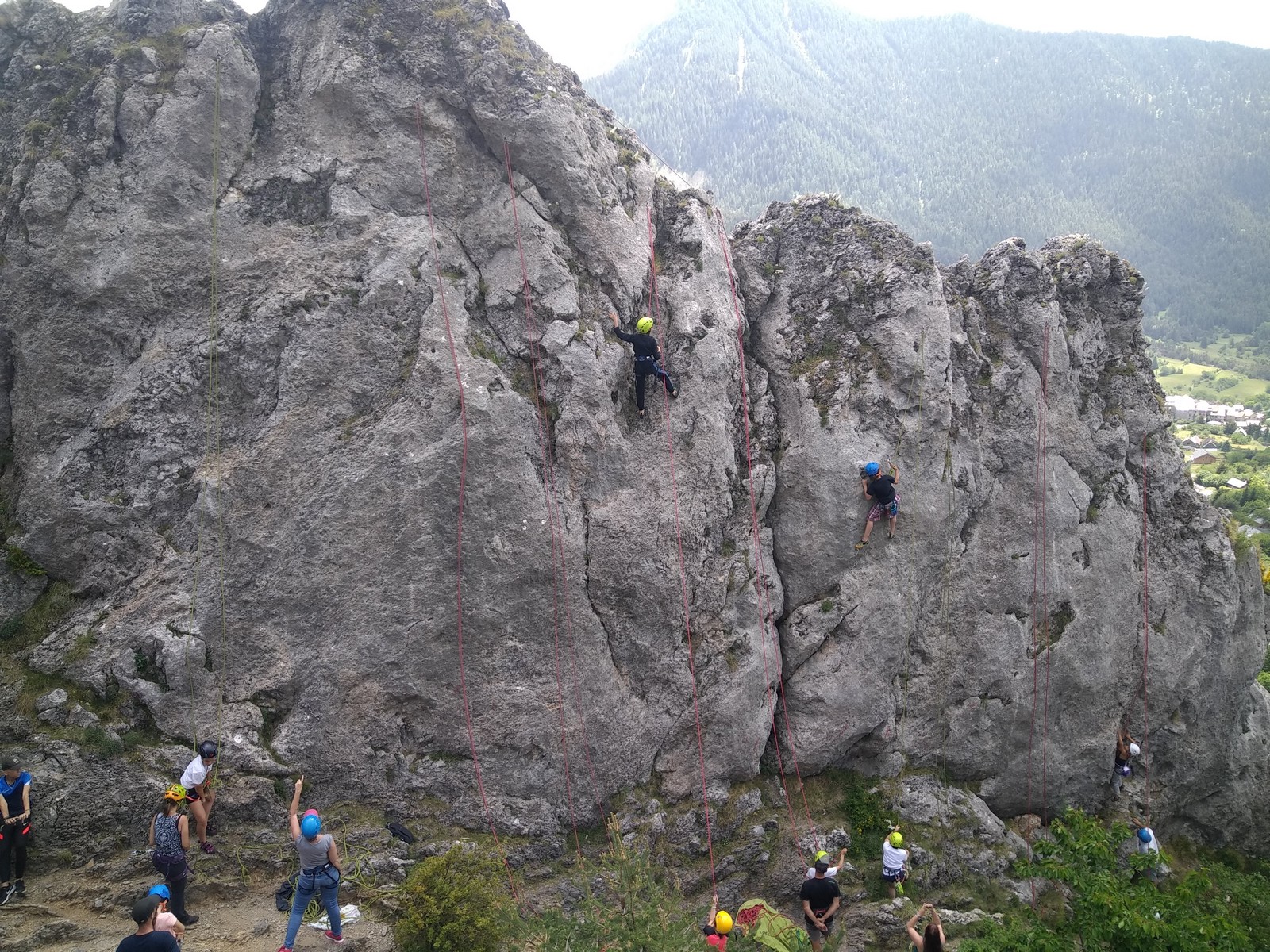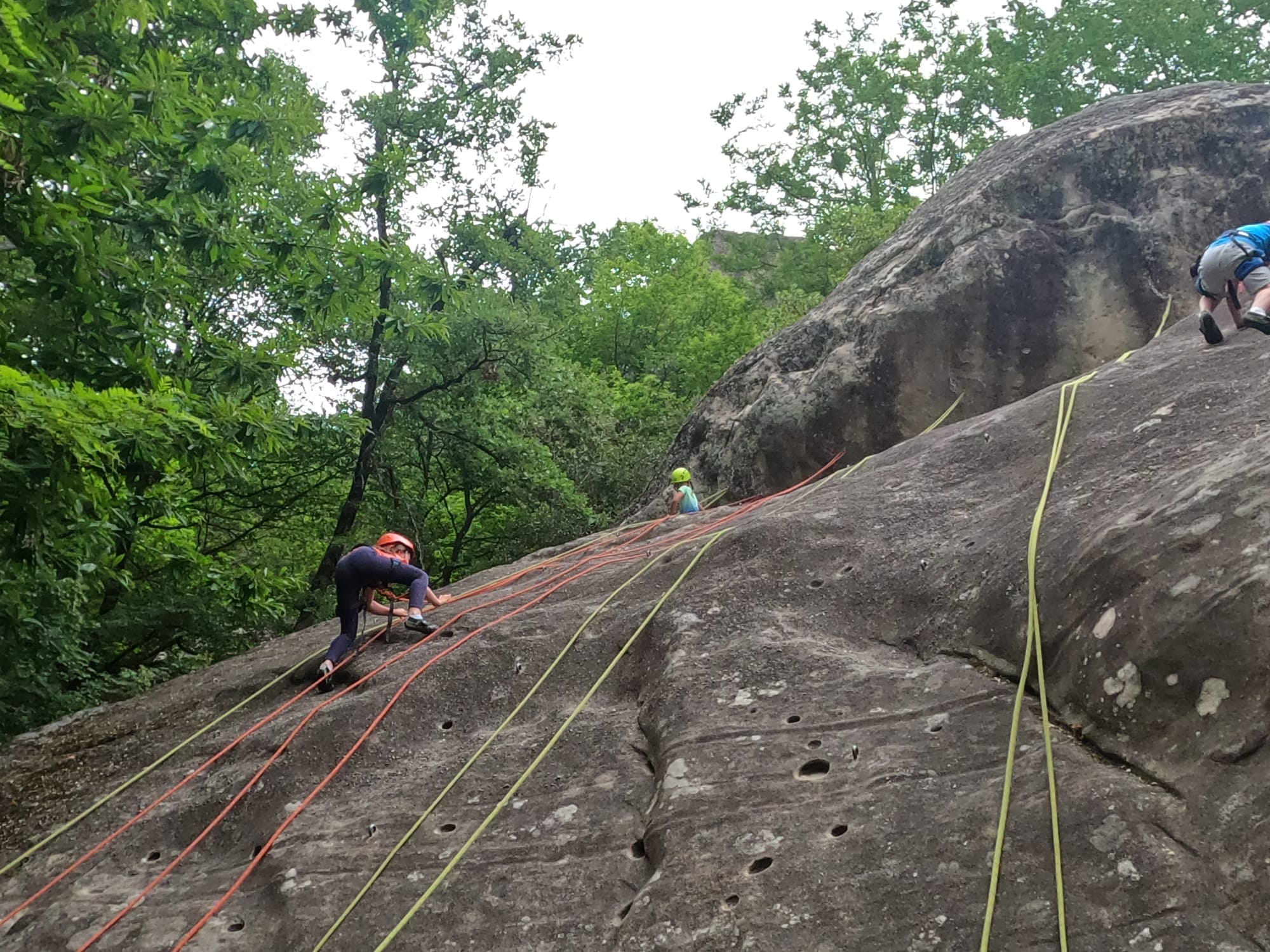 C’est avec 11 adultes du club que nous sommes donc partis jeudi matin pour notre classique stage grandes voies de l’Ascension. Nous débarquons au camping vers 12h et commençons à monter le camp. Il y a du monde en masse et c’est non sans difficulté que nous parvenons à nous installer sur un espace convenable. Quelques histoires de rallonge et d’électricité plus tard, les tentes et le barnum sont montés, nous avalons notre repas de midi et décidons d’aller grimper au secteur de 4 heures, là où il y a quelques petites grandes voies d’initiation dans un niveau très facile histoire que tout le monde se recale sur les manips.