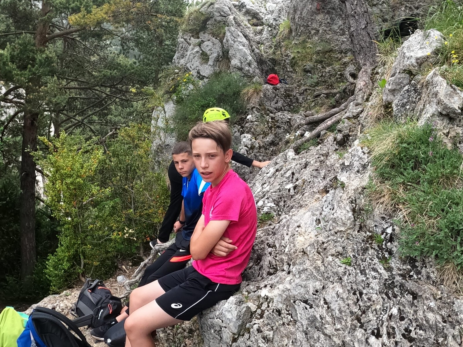 De mon côté, ça se passe très bien. On zigzague entre les autres cordées sans jamais que ça nous gêne. Jean galère un peu avec l’itinéraire lorsqu’il passe devant mais s’en sort honorablement. Je m’enquille le fameux 6b déversant et aide tout le monde à passer avant que Jean termine la voie en tête. Nous sommes les premiers à sortir et si nous n’avons pas eu froid, la chaleur n’était pas insurmontable. Je laisse mes trois camarades de cordée aller chercher un coin à l’ombre pour le pique-nique pendant que je me déplace vers la sortie des voies des autres cordées. Cécile et Djé arrivent justement, après un bon combat visiblement. Les autres ne sont pas très loin dessous mais ça bouchonne dans la fin commune à 2 voies. Gautier sort en premier et je me place à l’assurage. Il a l’air épuisé, mais ce n’est rien comparé à tous les autres. Ça a été dur ! Mais tous ont le sourire. Finalement, Laura est la dernière à sortir et tout ce beau monde se rejoint sous un petit coin d’ombre sur la marche retour.