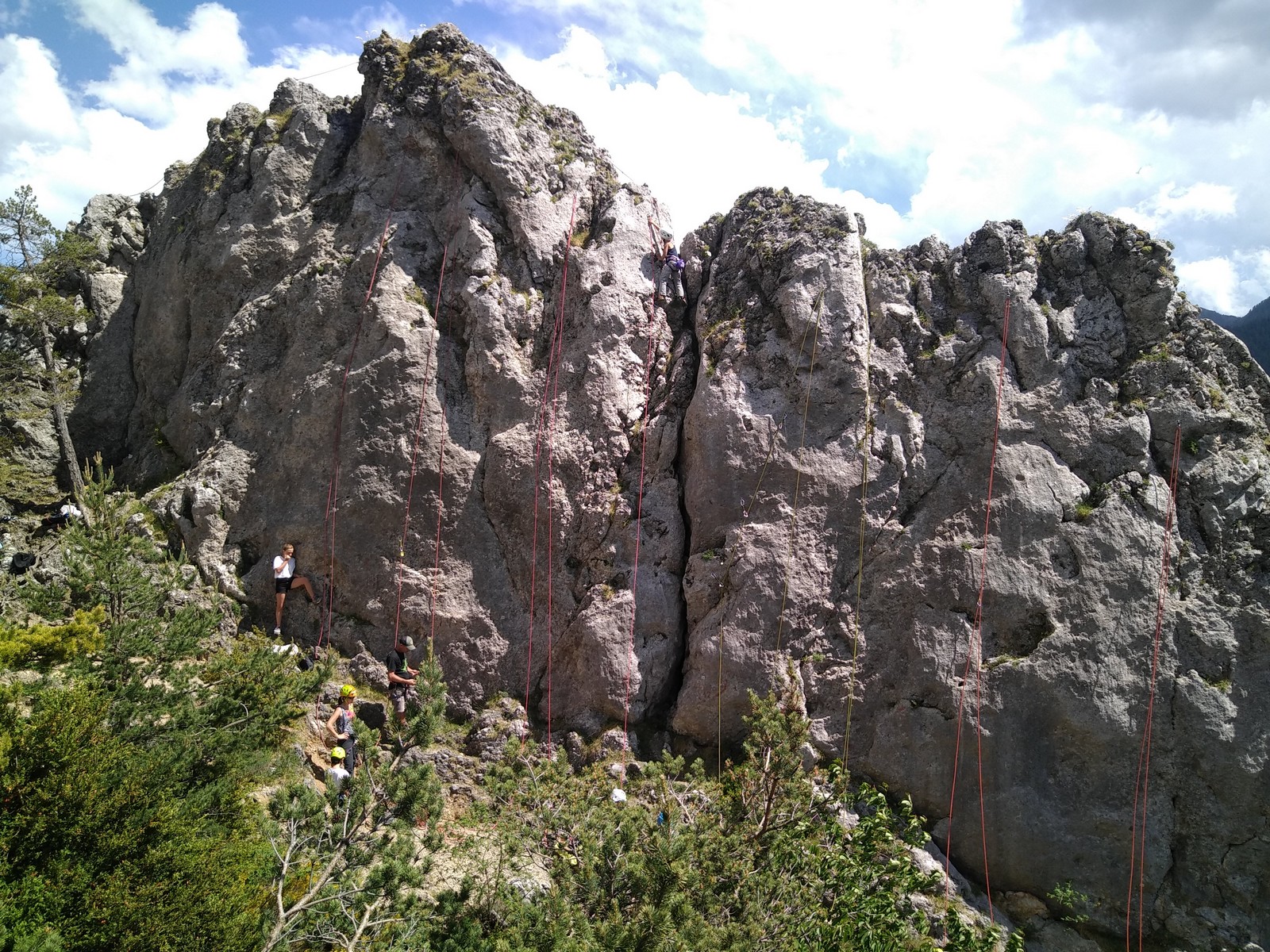 Dans le même temps, Seb qui devait partir avec pas mal de monde dans « le dièdre sud », voie isolée à l’extrême gauche du secteur, se voit contraint de changer également de voie et de se rabattre sur « Le voyage », 170m, 6a+ max, juste à côté de Cécile et Djé dans « la terreur du chien fou », 150m, 6b max.