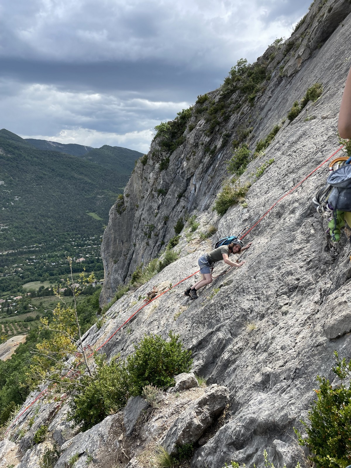Le troisième jour est le jour où on s’attaque au Quiquillon, falaise emblématique d’Orpierre, avec ses voies un peu plus longues et plus soutenues. Nous avions fait la répartition des cordées la veille et gardé le même horaire. Mais cette fois, lorsque nous arrivons au pied des voies, c’est très compliqué. J’avais choisi la classique Brazil avec Jean, Jean-Luc et Hélène mais il y a trop de monde dans la voie et celles avoisinantes du même niveau. Mais il reste de libre « la princesse des astres », 160m, 6b max alors nous décidons de nous y atteler. Je pars en tête dans les premières longueurs afin de gagner un peu de temps.