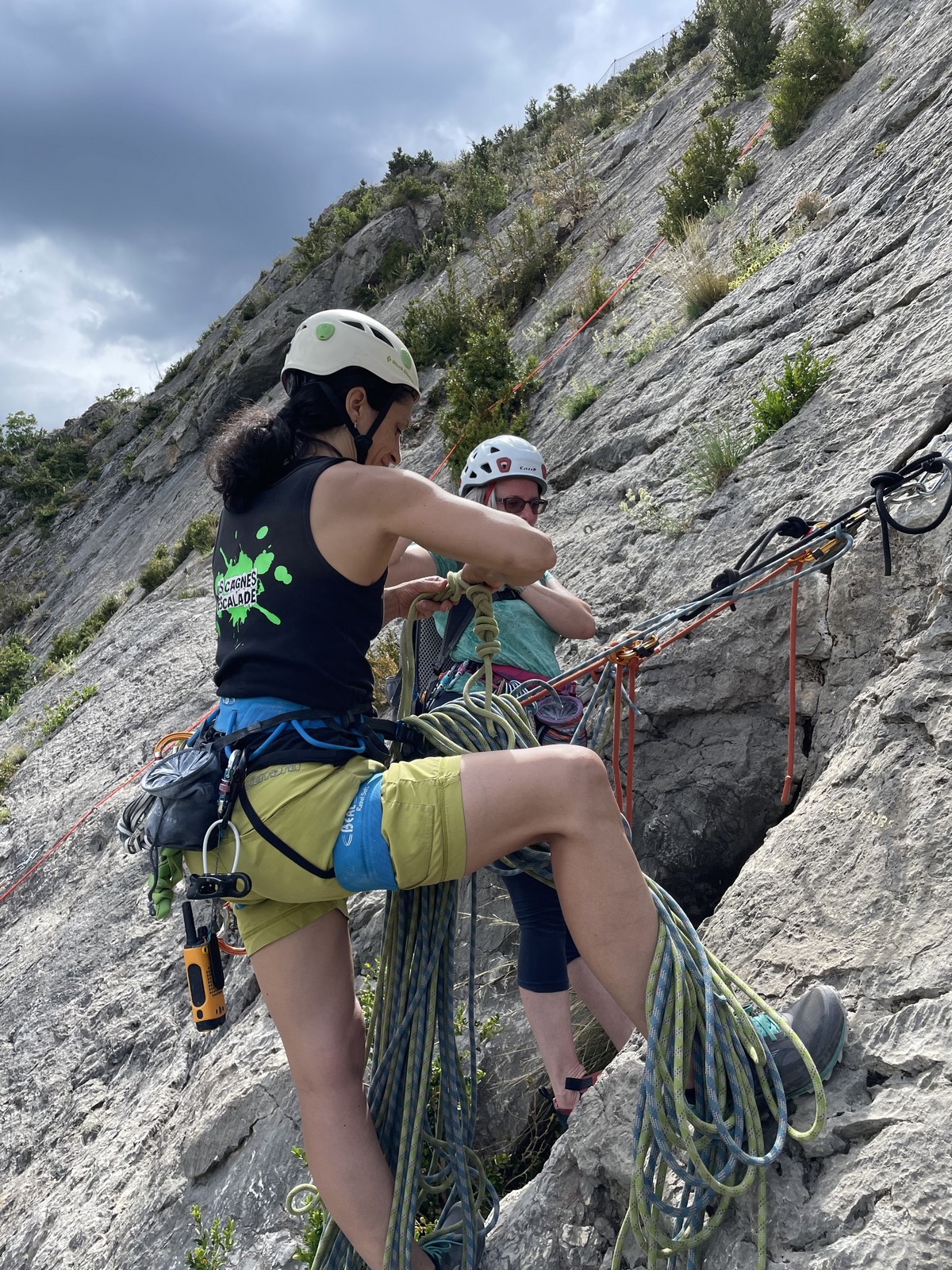 Sandrine et Djé s’équipent tranquillement à gauche de nous dans « Cartable exquis » où il feront la première longueur avant de bifurquer dans « Massacre à la débroussailleuse », le tout pour une voie de 110m en 5b+ max.