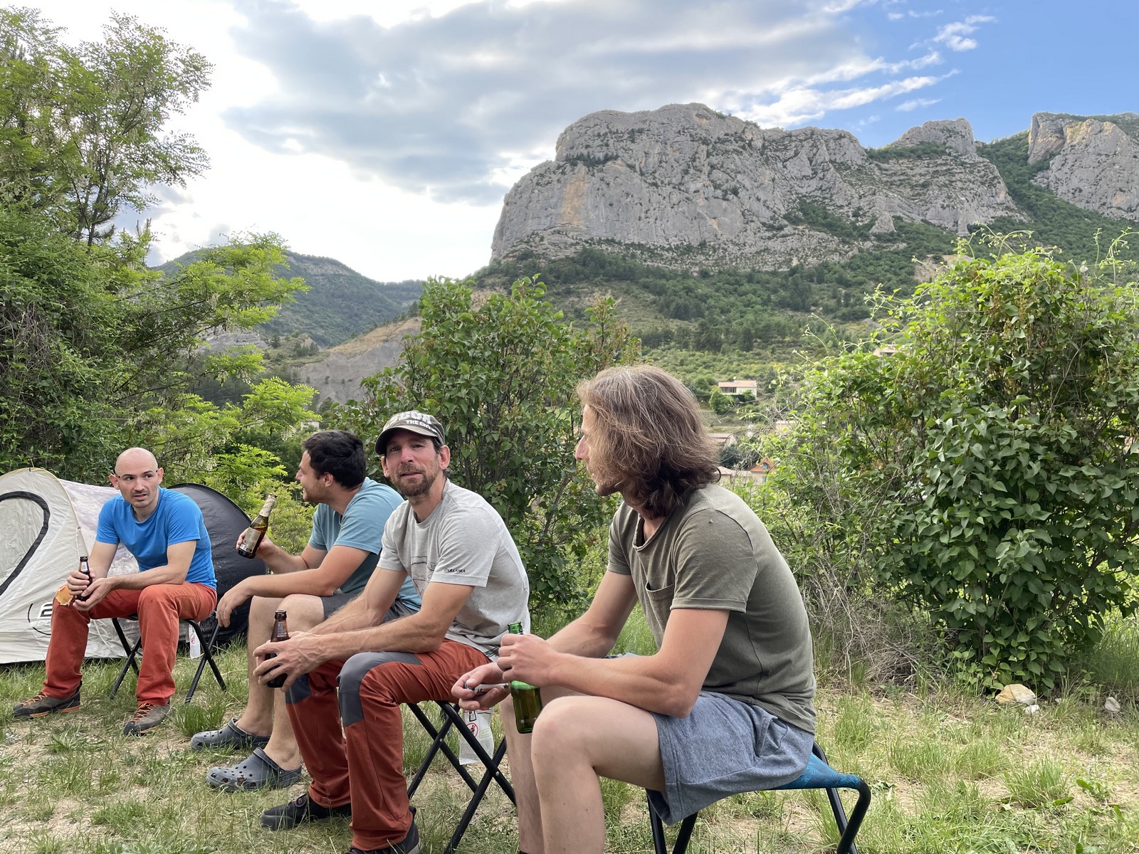 Retour au camp pour la première soirée pâtes et bolognaise. Nous commençons à organiser le lendemain. Nous savons qu’il va faire chaud alors nous choisissons un secteur de grandes voies pas trop longues (l’Adrech), légèrement orienté à l’ouest pour avoir un peu d’ombre le matin. Pour éviter le monde et le soleil, nous choisissons un départ assez tôt : réveil 7h pour un départ 8h. La soirée défile tranquillement et tout le monde rejoint son duvet pour une nuit qu’on espère reposante.