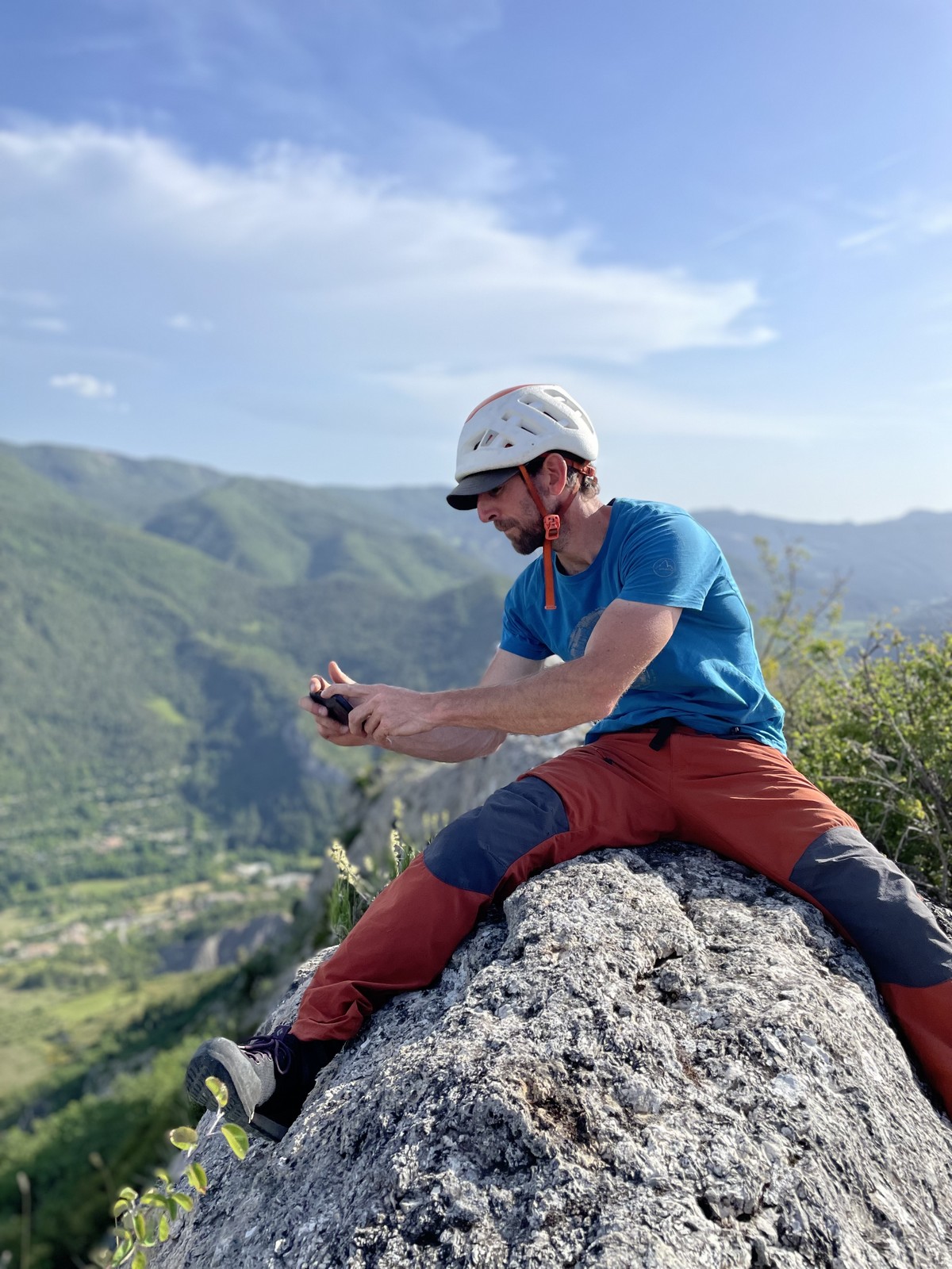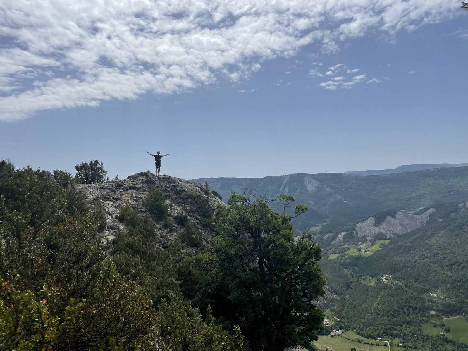 Djé et Sandrine, qui ont la voie la plus courte mais doivent tout de même gérer quelques embouteillages aux relais, sont les premiers à sortir au sommet. J’arrive quelques minutes derrière eux avec ma cordée et quelques suées épiques de Xav dans la dalle sommitale. Le soleil sort de derrière les nuages et commence à nous assommer. Chaque cordée sort à son rythme de ses voies et redescend dans le vallon voisin pour se mettre à l’ombre, à l’aide du rappel installé par la cordée Djé/Sandrine. Je reste au sommet histoire d’aider les derniers et rejoins le groupe où Cécile nous a choisi l’emplacement le moins confortable du monde pour manger.