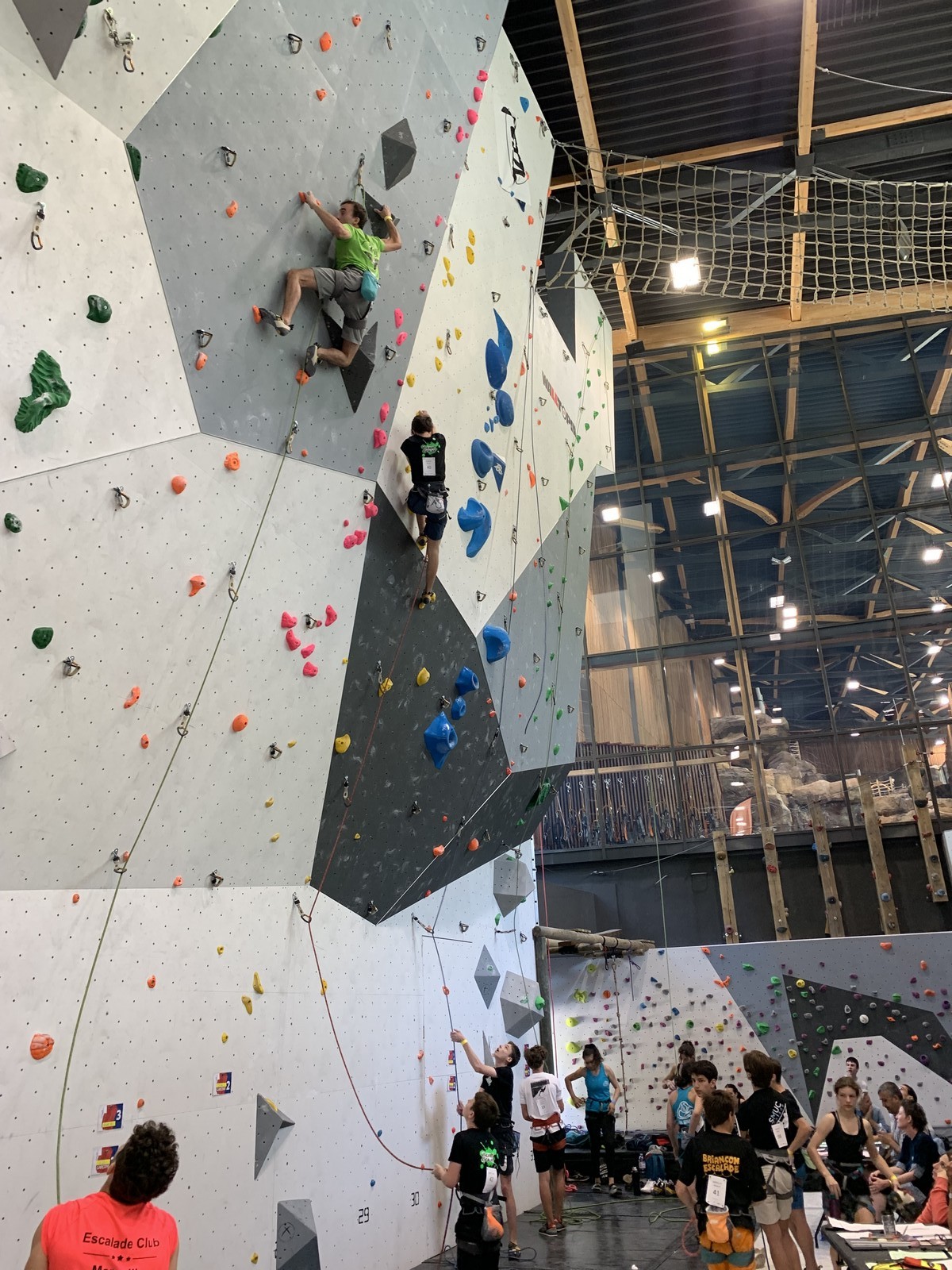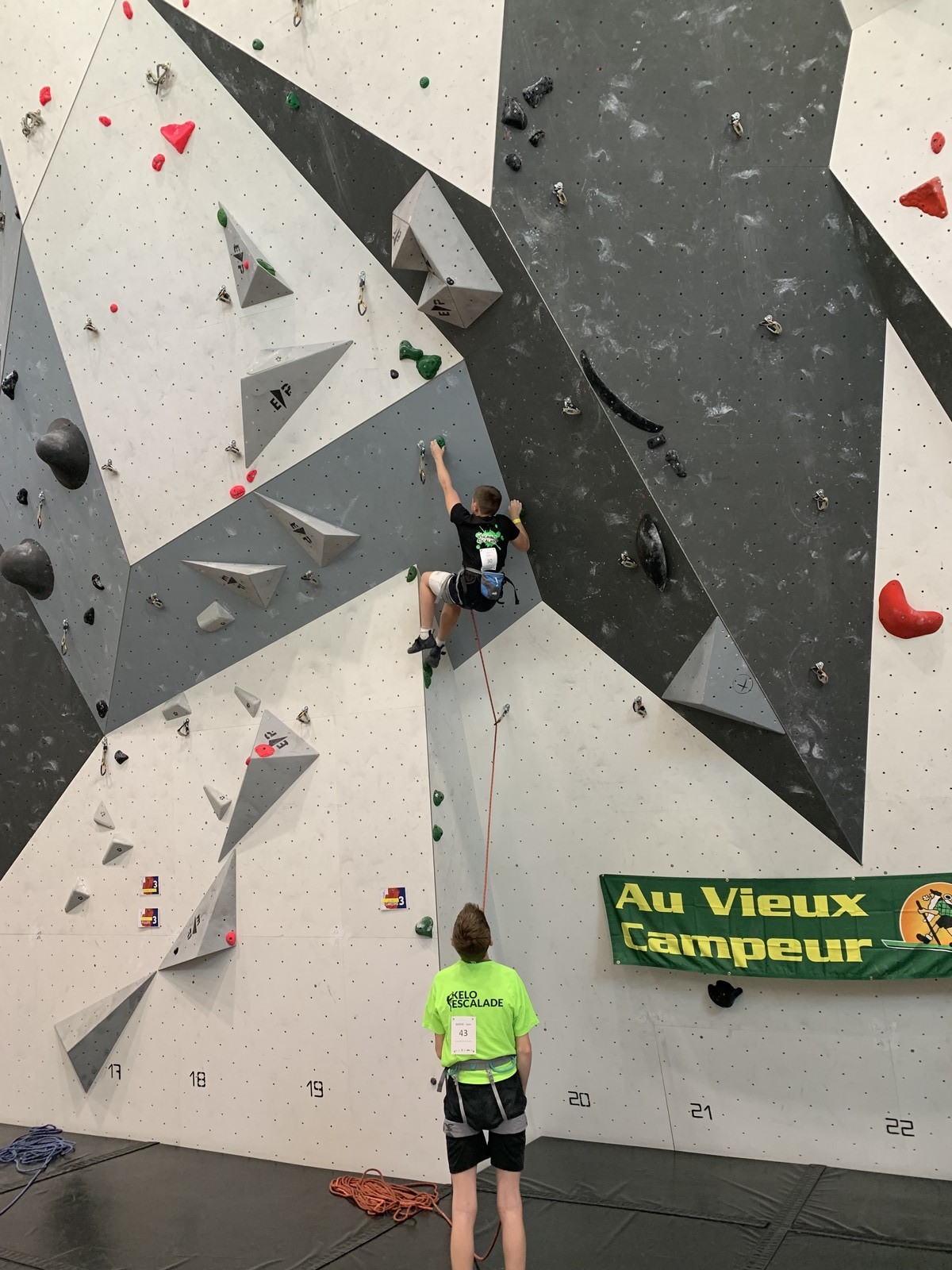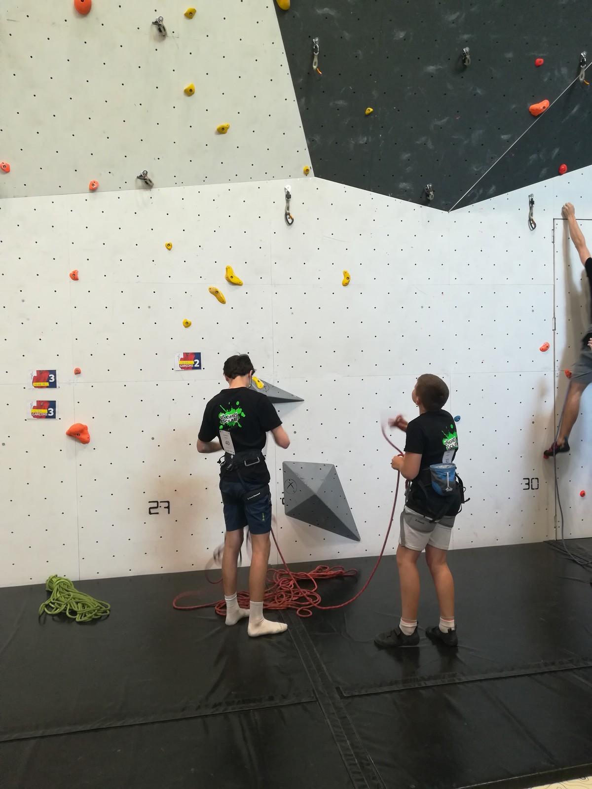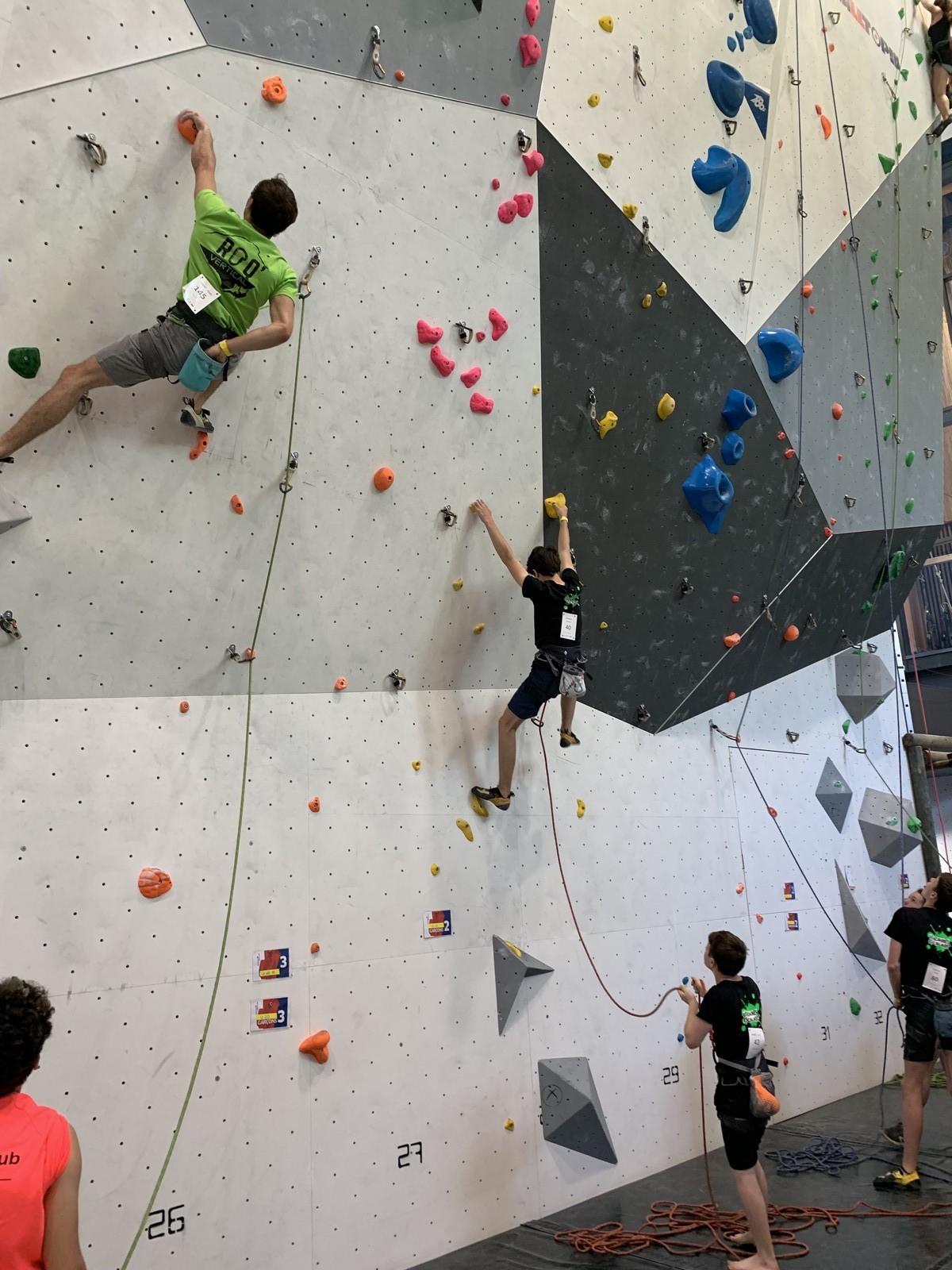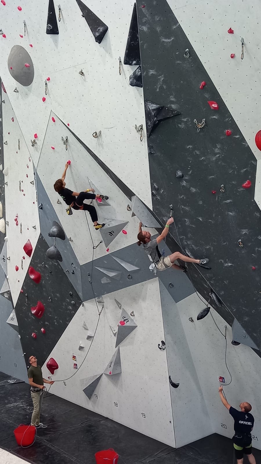 Le scénario est à peu près identique pour Mathis D. en U18. Il parvient sans encombre au sommet de ses 2 premières voies mais tombe un peu prématurément dans sa dernière voie de qualif. Lui aussi fait partie des derniers concurrents qualifiés, mais l’essentiel est que ça passe, et il pourra défendre ses chances lors de la finale.