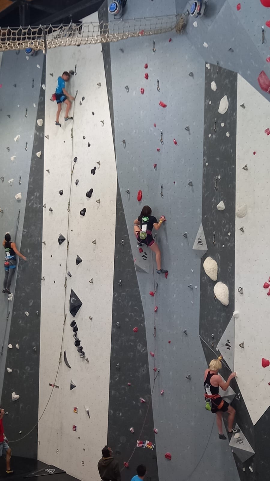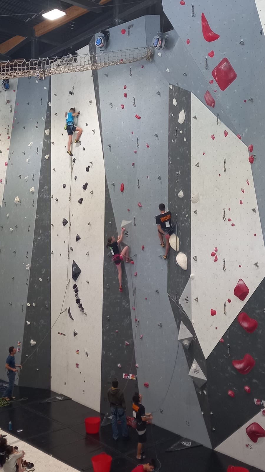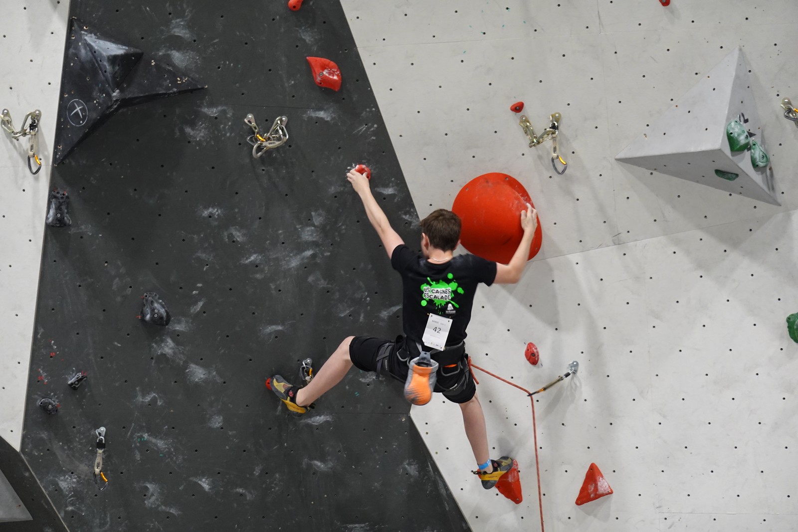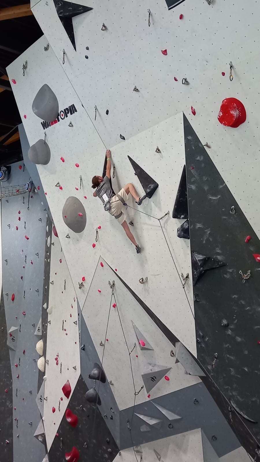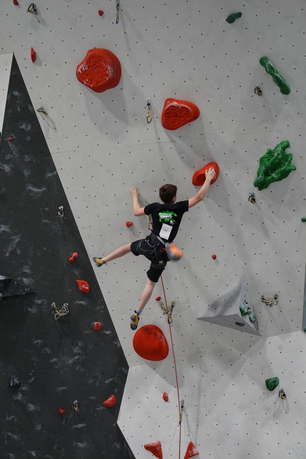 Lucas lui n’est pas venu pour jouer les figurants, et il espère bien confirmer sa bonne forme du moment. Il tope sans problème ses 2 premières voies de qualif et avance bien dans sa voie 3. Il y a du lourd chez les U16 dans la région, et les places en finale sont chères ! Il arrive toutefois à faire partie des 4 derniers grimpeurs ex-aequo qualifiés pour la finale.