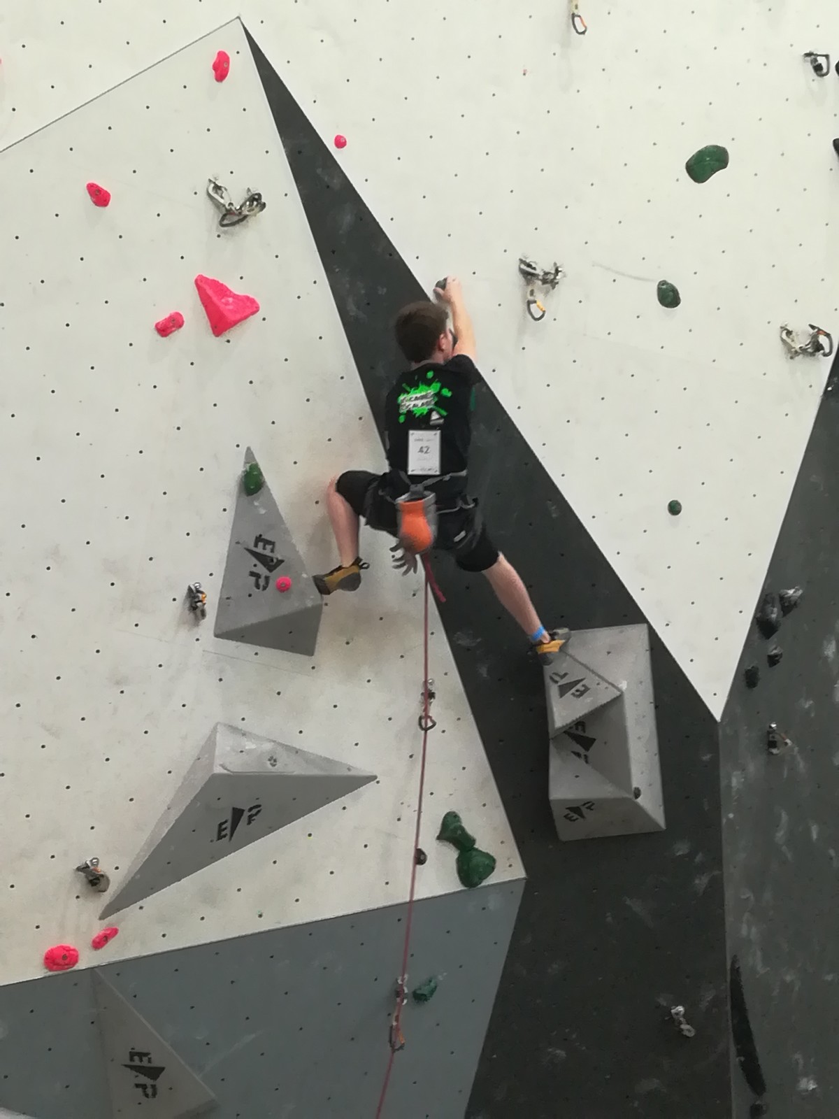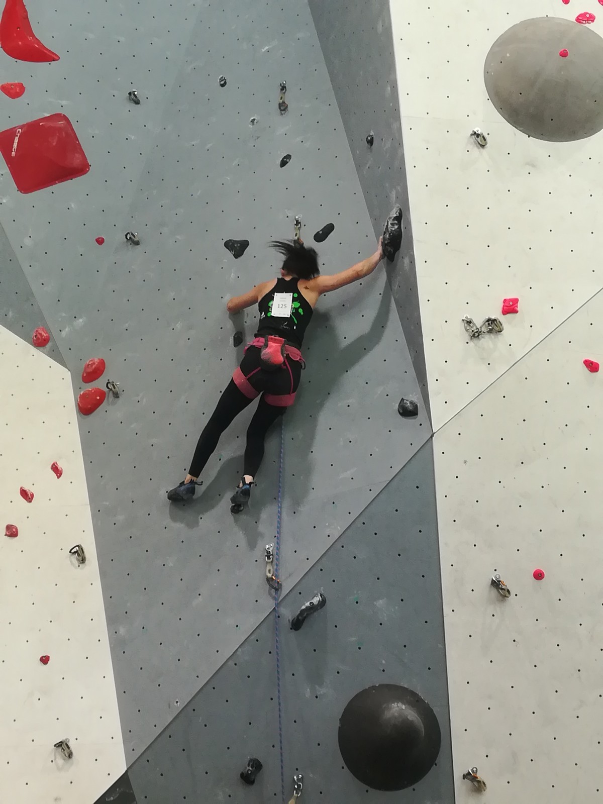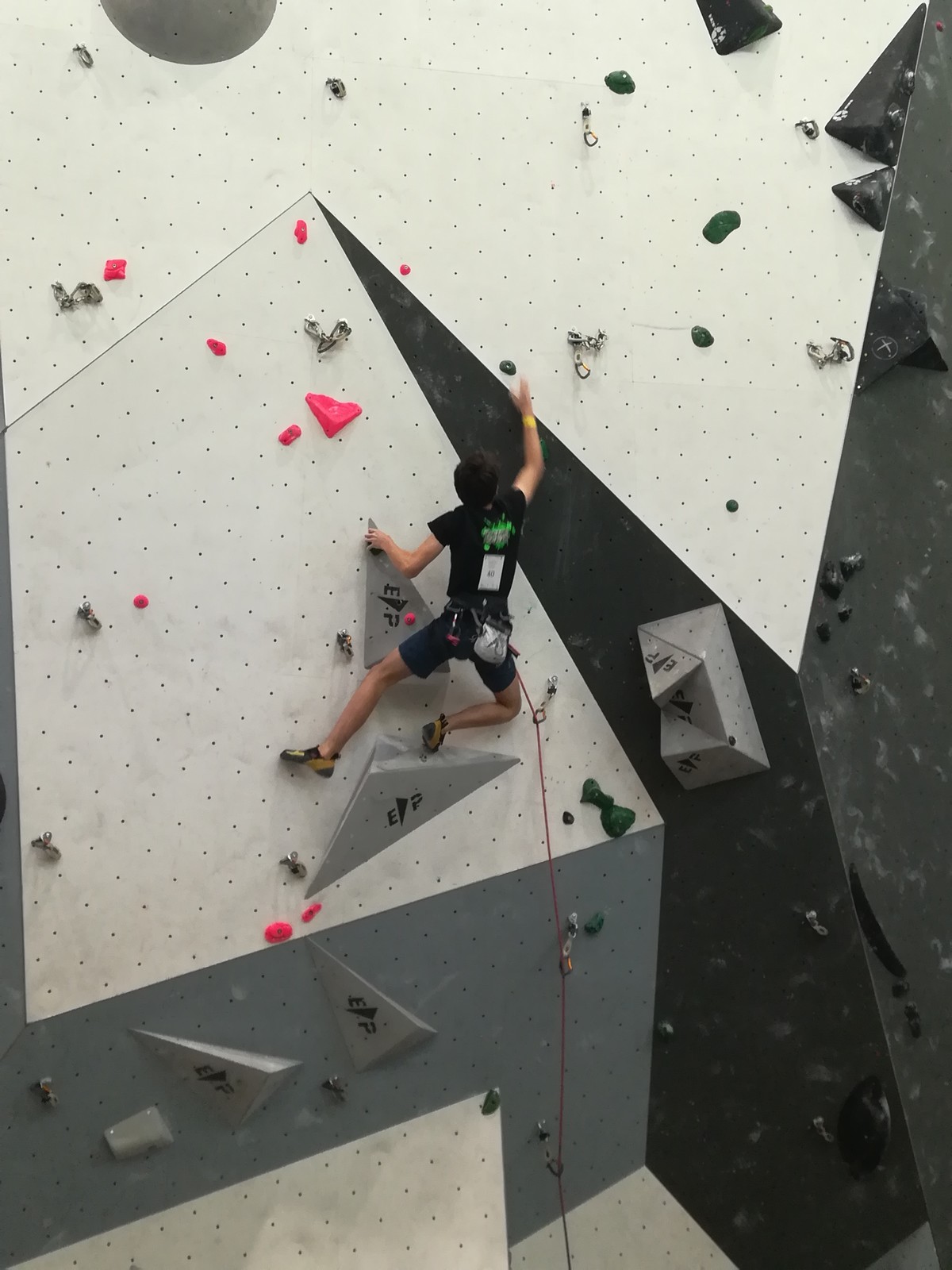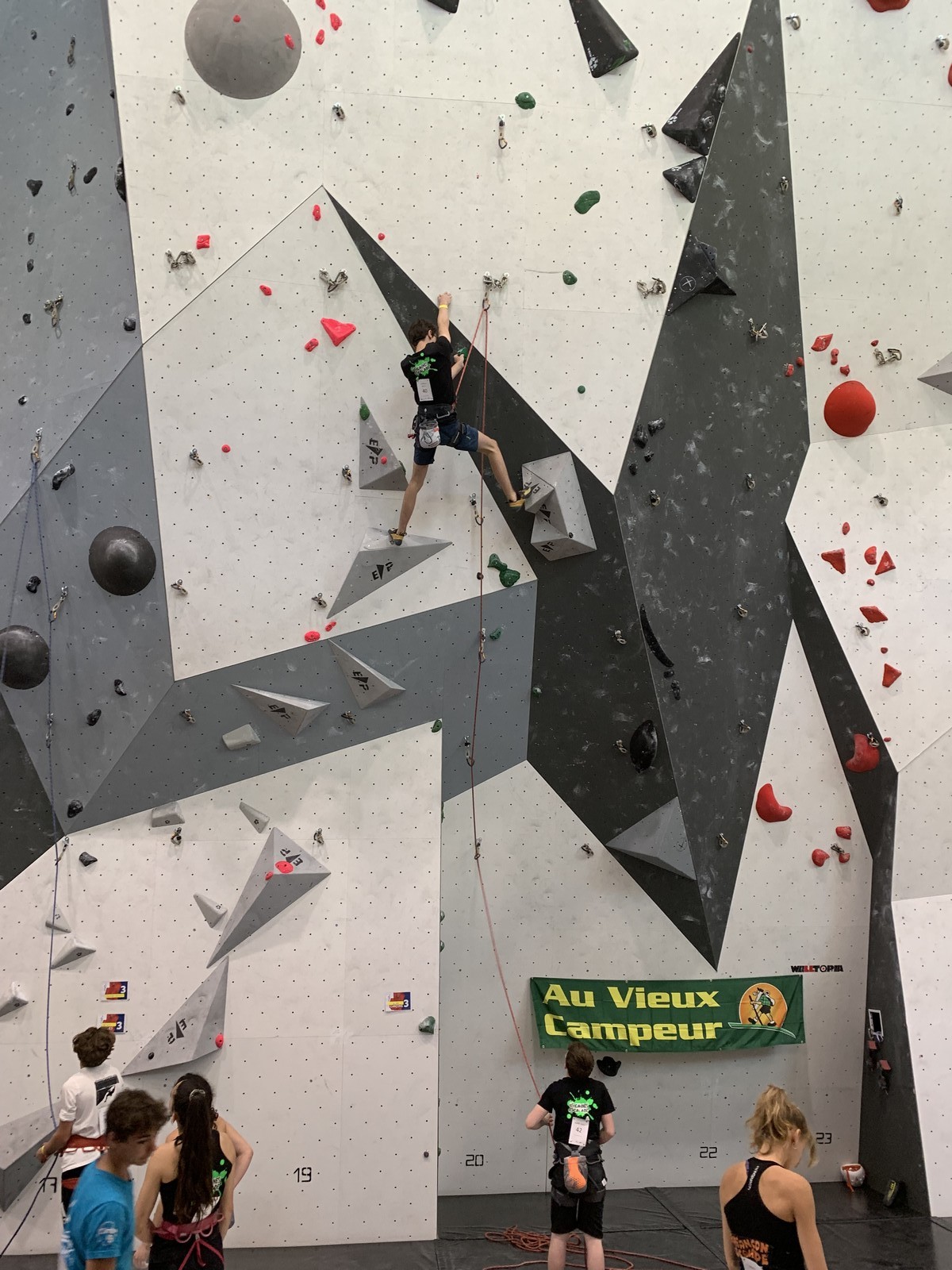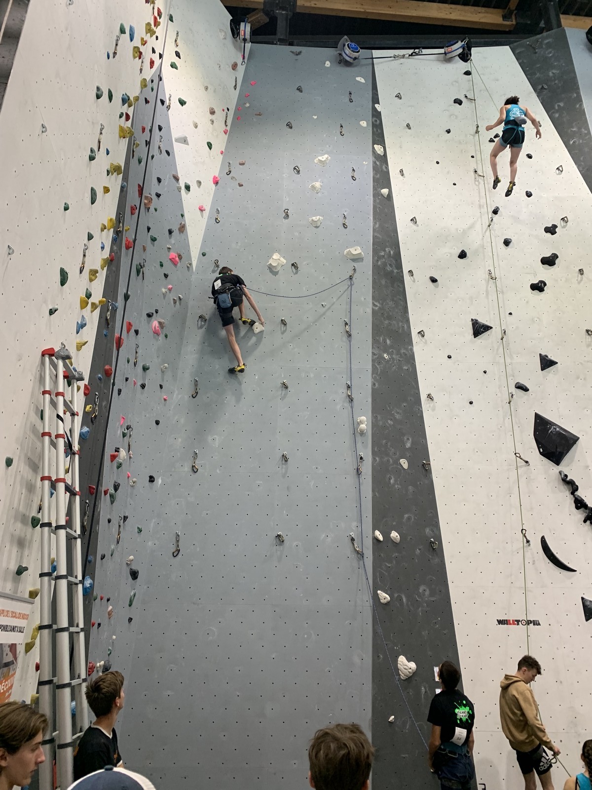 Lucas lui n’est pas venu pour jouer les figurants, et il espère bien confirmer sa bonne forme du moment. Il tope sans problème ses 2 premières voies de qualif et avance bien dans sa voie 3. Il y a du lourd chez les U16 dans la région, et les places en finale sont chères ! Il arrive toutefois à faire partie des 4 derniers grimpeurs ex-aequo qualifiés pour la finale.