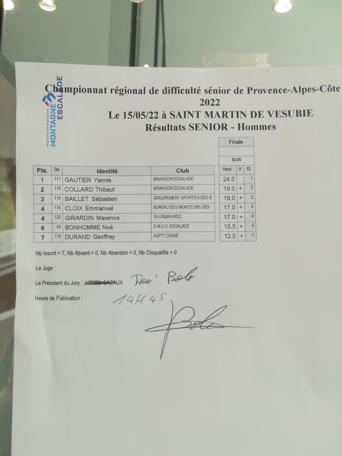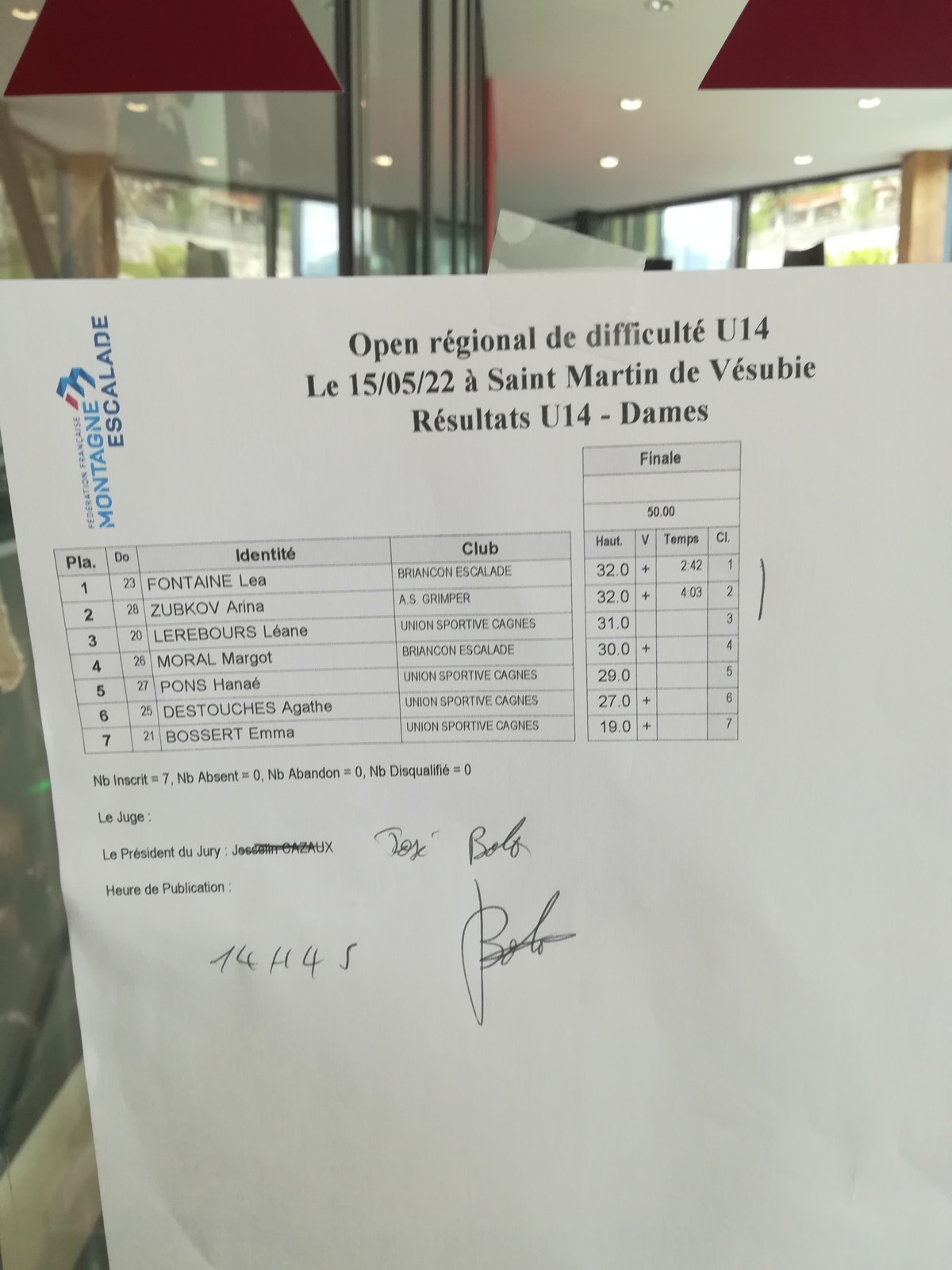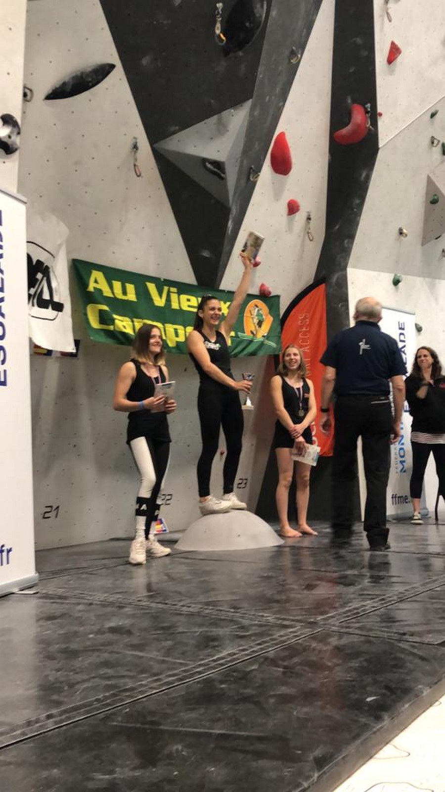 La voie des U18 filles est assez piégeuse, Juliette galère sur un clipage mais réussit à dépasser la difficulté sous les encouragements de son fan club, elle continue à avancer dans la voie avant de chuter. C’est elle qui sera montée le plus haut, et c’est donc le titre de championne régionale pour elle aussi. Elle gagne ainsi brillamment son ticket pour le championnat de France, rejoignant Ethan, Lenny et Lisa, déjà qualifiés via le classement général des coupes de France. Bravo les jeunes !