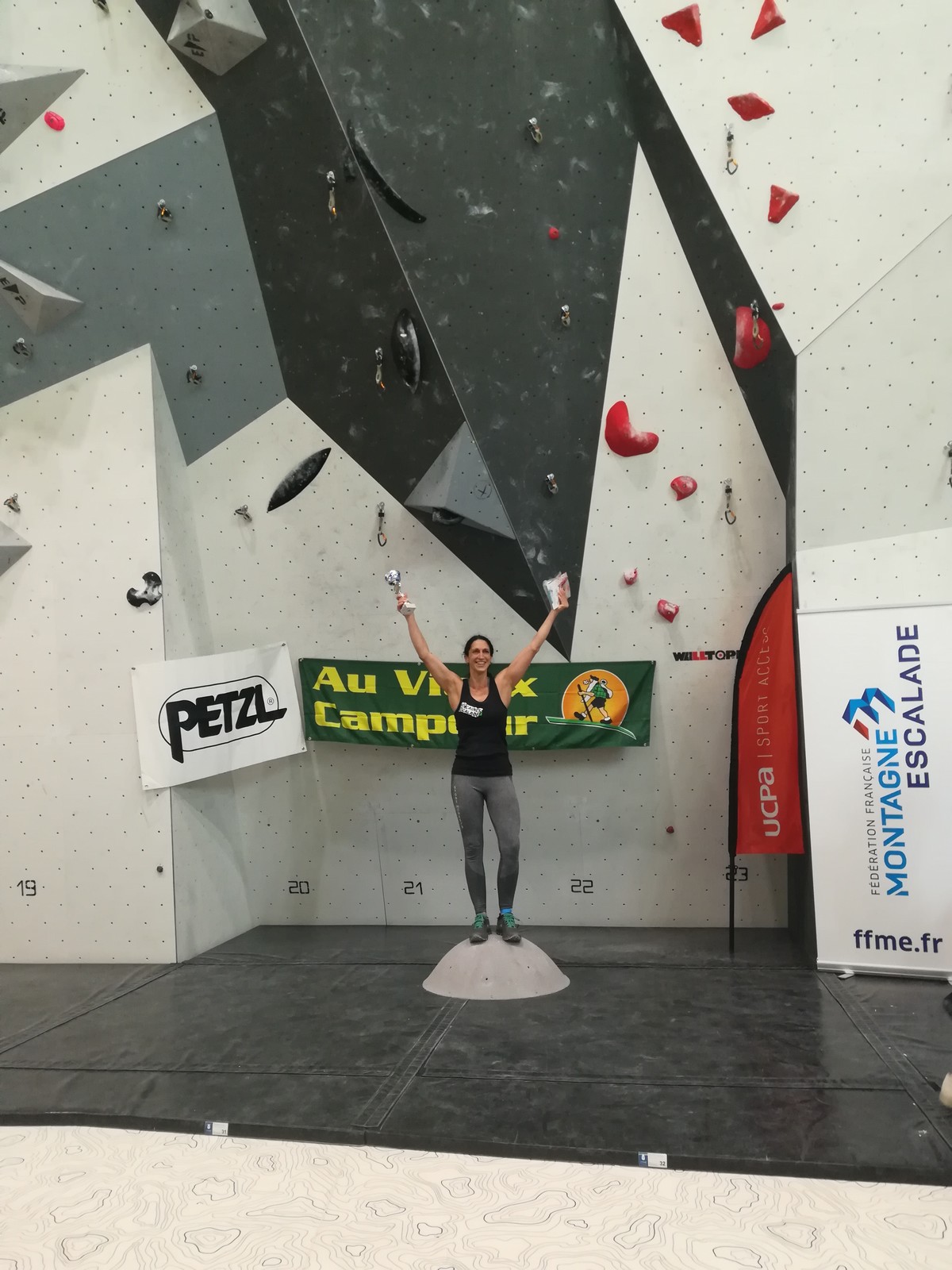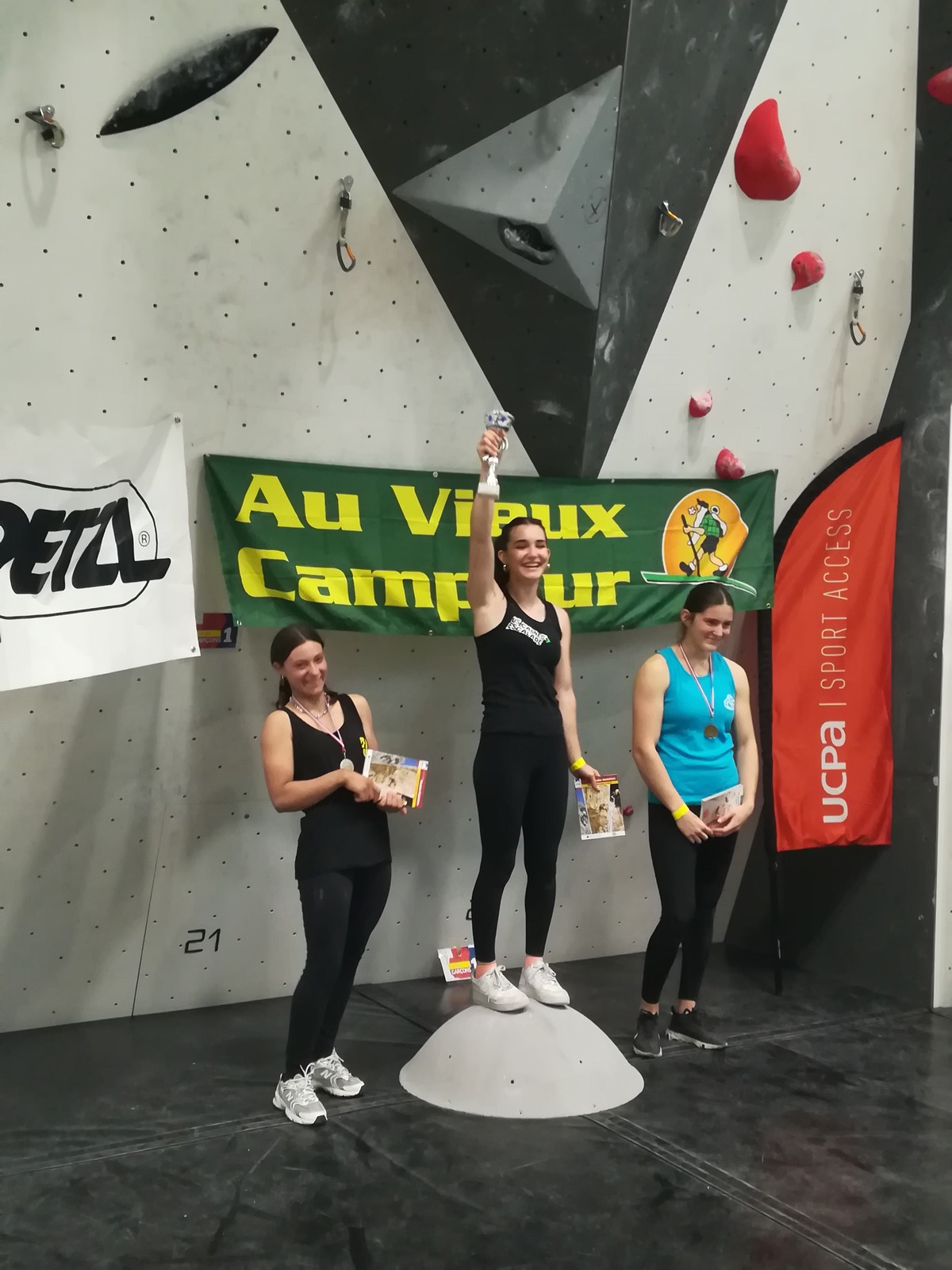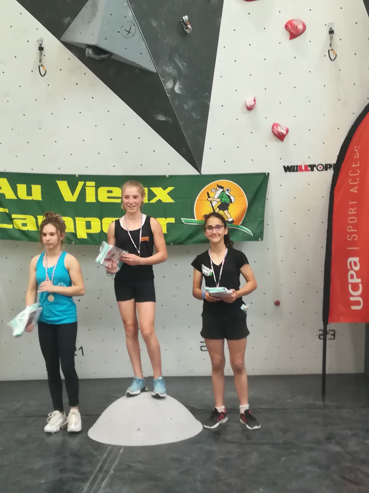 Deux concurrentes seulement chez les séniors femmes : Lisa surclassée et Ludivine également licenciée à l’USC, et moi toute seule chez les vétérans. On ne peut pas dire que le combat aura été acharné ! Lisa réussit son challenge personnel : décrocher le double titre en junior et en sénior, en ne tombant pas du week-end, et Ludivine, plus habituée aux falaises qu’à la résine obtient la médaille d’argent. Pas trop de suspense de mon côté donc, mais je me suis bien amusée avec les U14 !