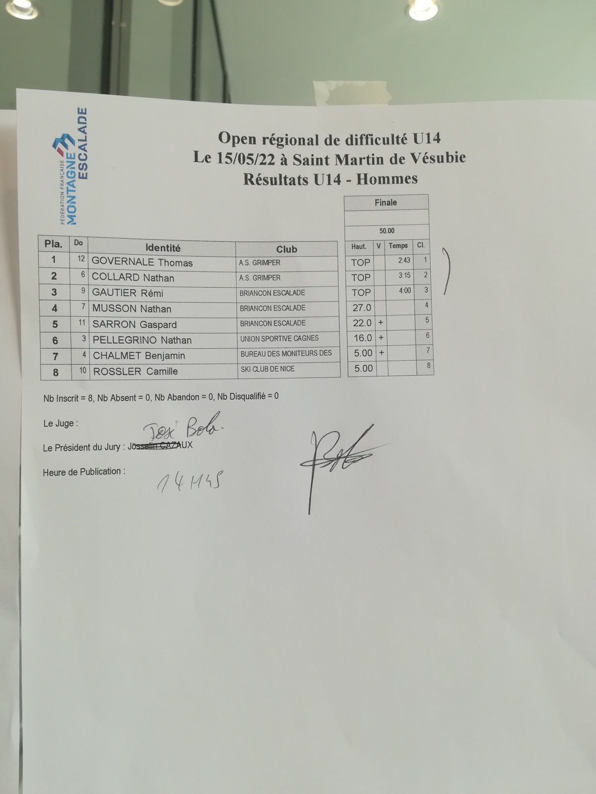 C’était en tout cas un très beau week-end de compétition, avec une ambiance conviviale comme on les aime. Chapeau à l’organisation, pour avoir assuré au pied levé malgré les divers rebondissements. Mention spéciale à l’équipe d’ouvreurs pour les voies qu’ils nous ont concoctées, et pour l’efficacité et le respect du timing (c’est toujours appréciable de pas passer 4 heures en isolement…). Merci au Vésubia Mountain Park pour l’accueil, un merci particulier aux parents (et enfants) qui ont joué les juges et assureurs bénévoles, et un merci tout spécial à Kaya pour ses encouragements, dans quelques années c’est toi qui seras sur le mur 🙂