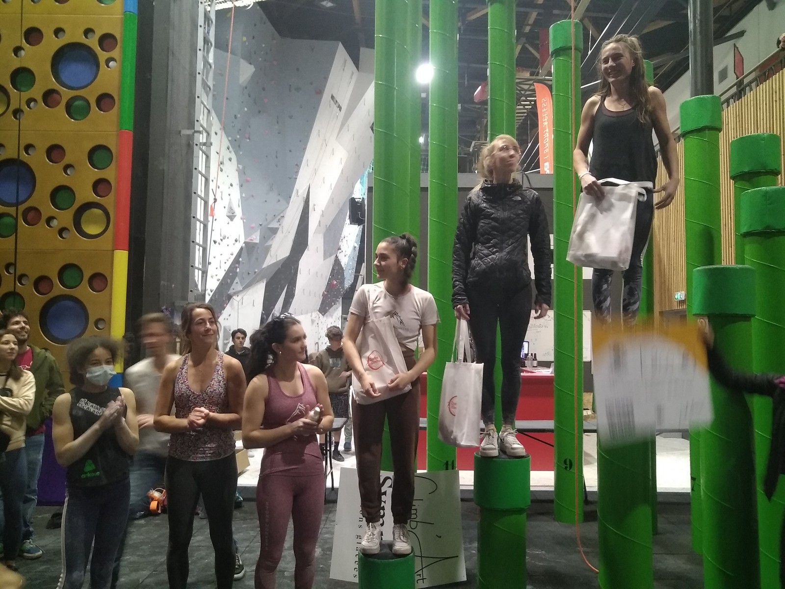 Emma ne parvient pas à s’exprimer pleinement et chute assez tôt dans la voie de finale, elle conserve donc sa 7ème place. Agathe est au combat et parvient à avancer pas mal, mais les autres concurrentes iront plus haut, elle termine 6ème. Hanaé avance bien, la tenue des petites prises ne lui pose pas de problème, et elle chute à quelques mouvs du top, finissant ainsi 5ème. Léane confirme sa bonne forme, la voie ne semble pas trop lui poser de problème jusqu’à ce qu’elle bute sur un clipage à 2 prises de la fin, ses vieux démons la reprennent et elle n’avancera plus. C’est suffisant quand même pour le podium, elle accroche la 3ème place.