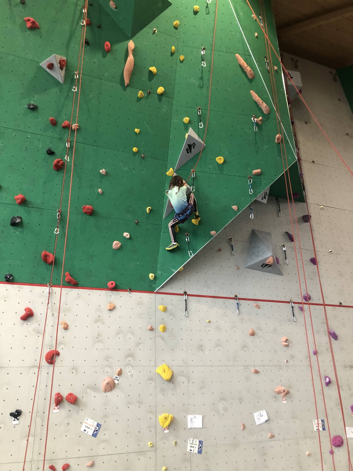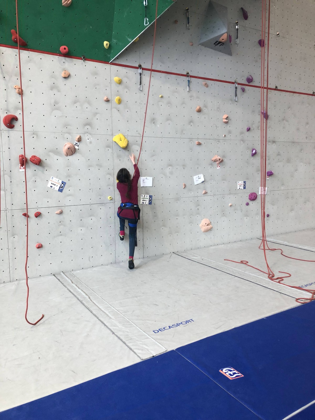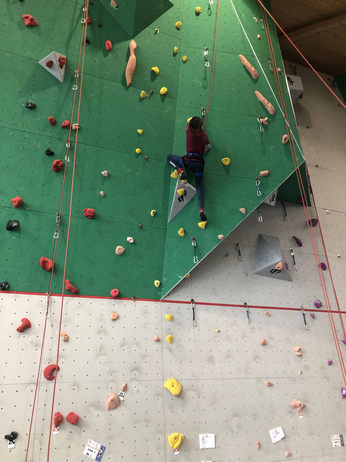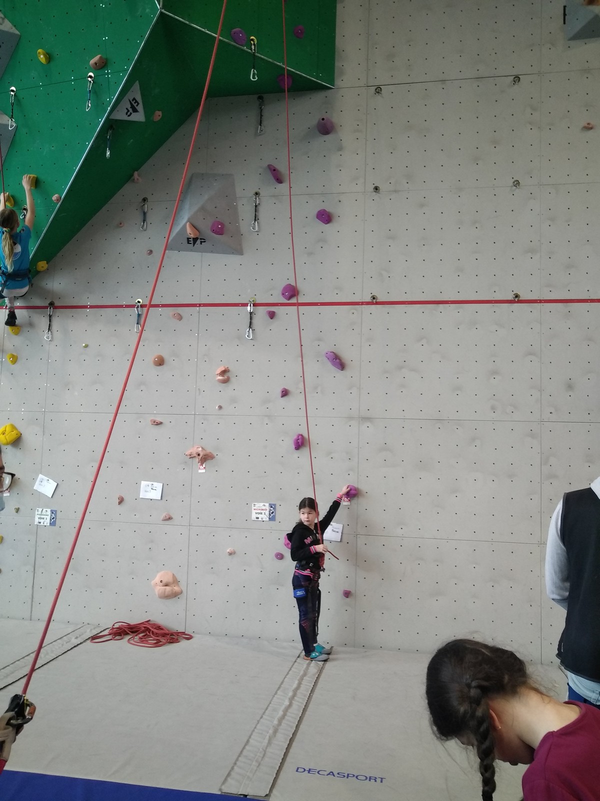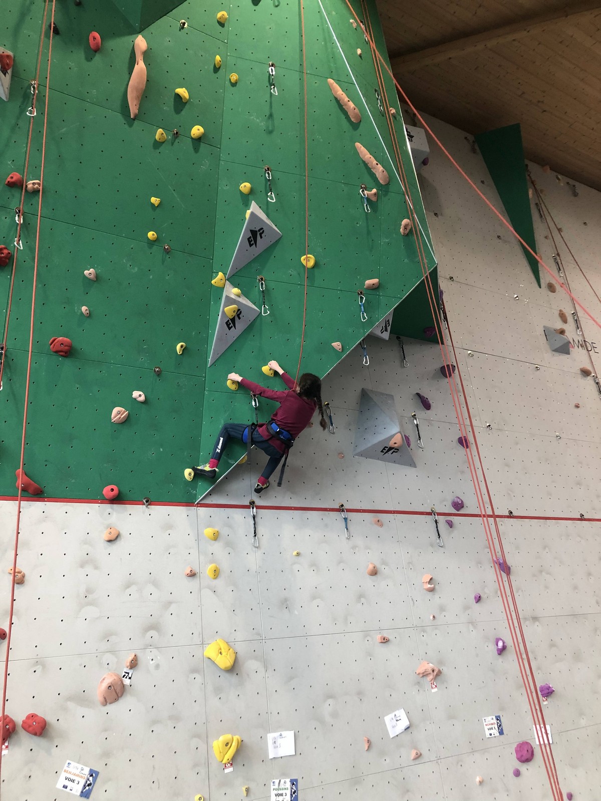 C’est la même voie pour les benjamins et Camille du Ski club part en premier. Ça monte bien mais tombe avant le jeté latéral.