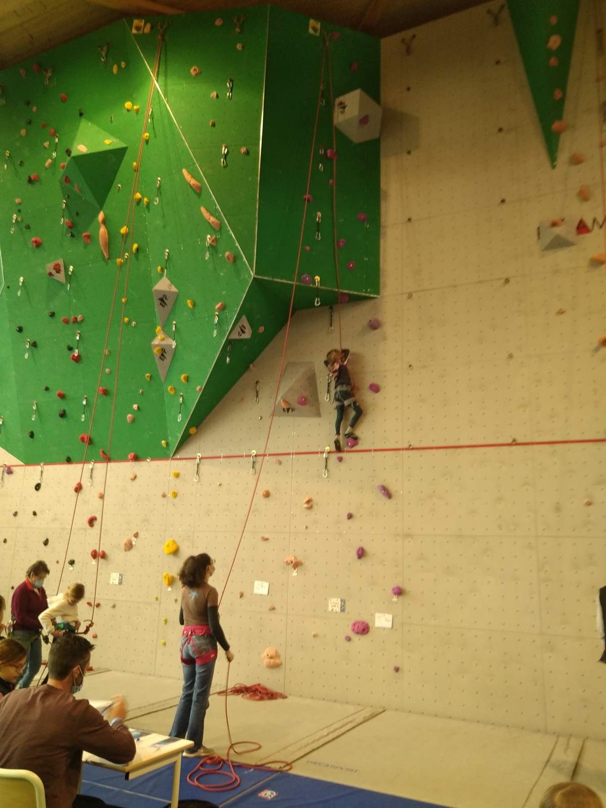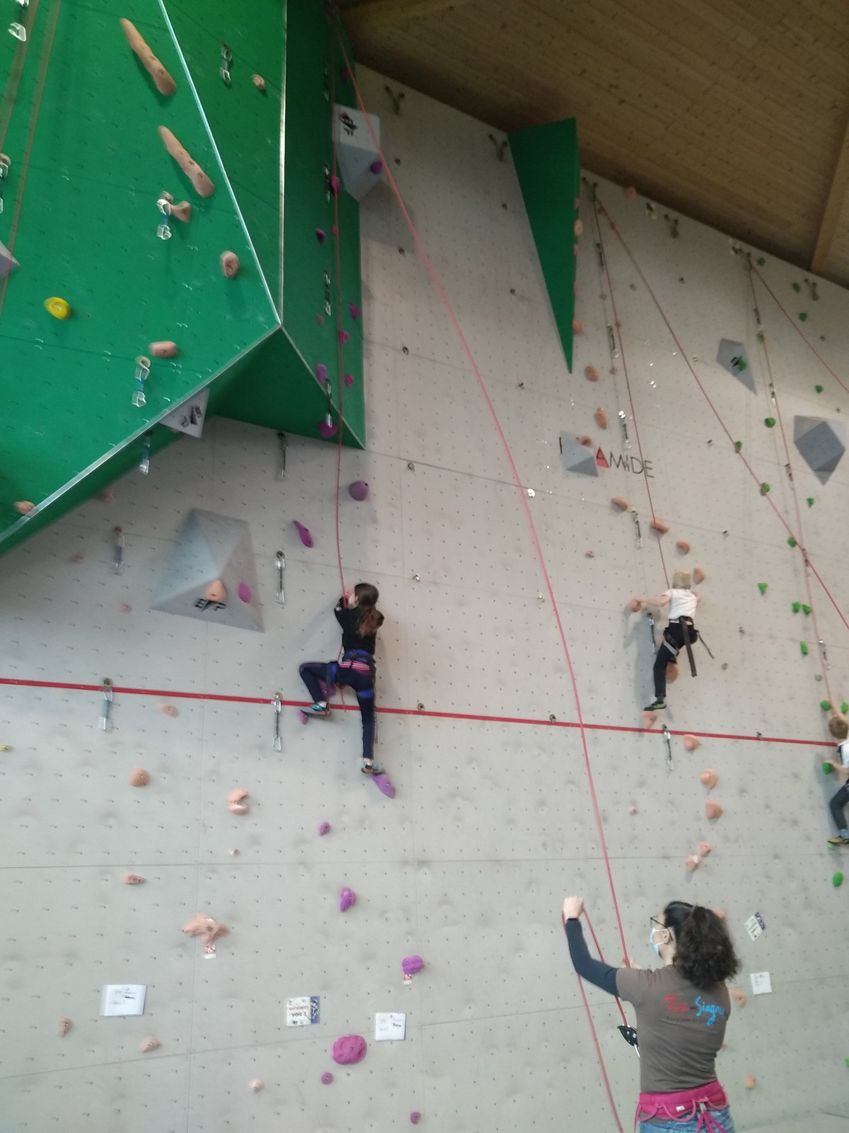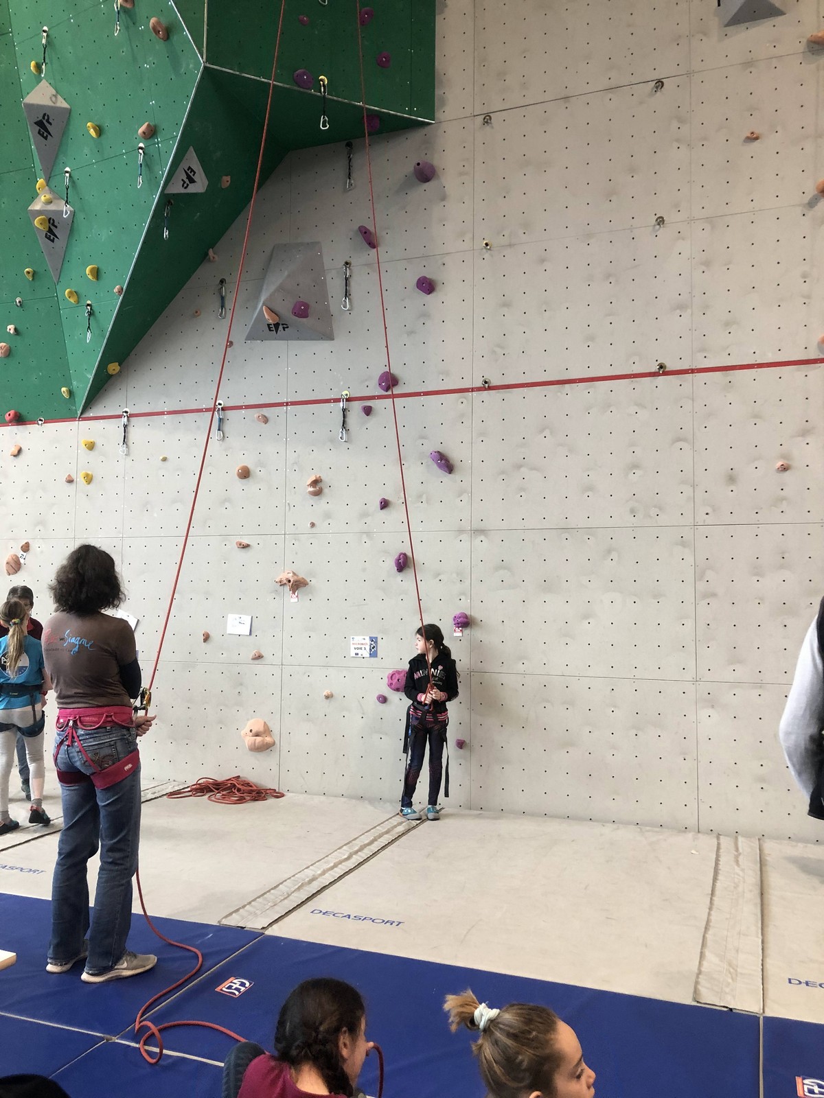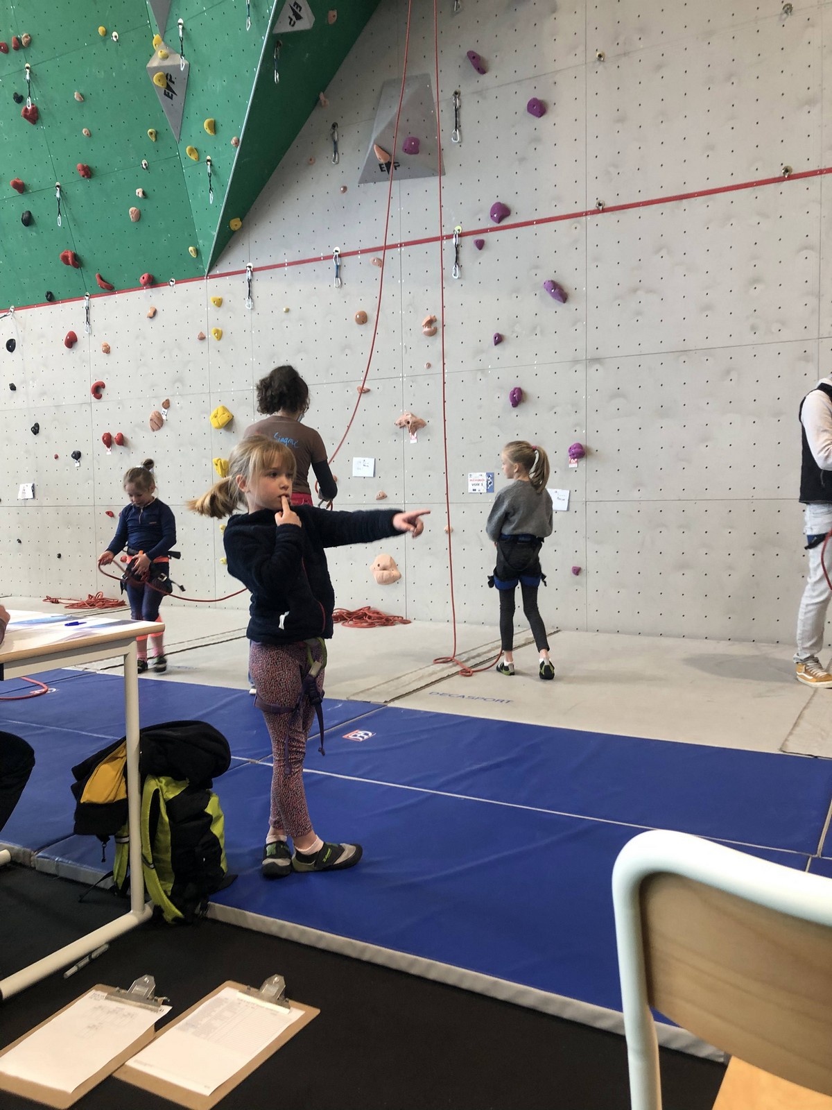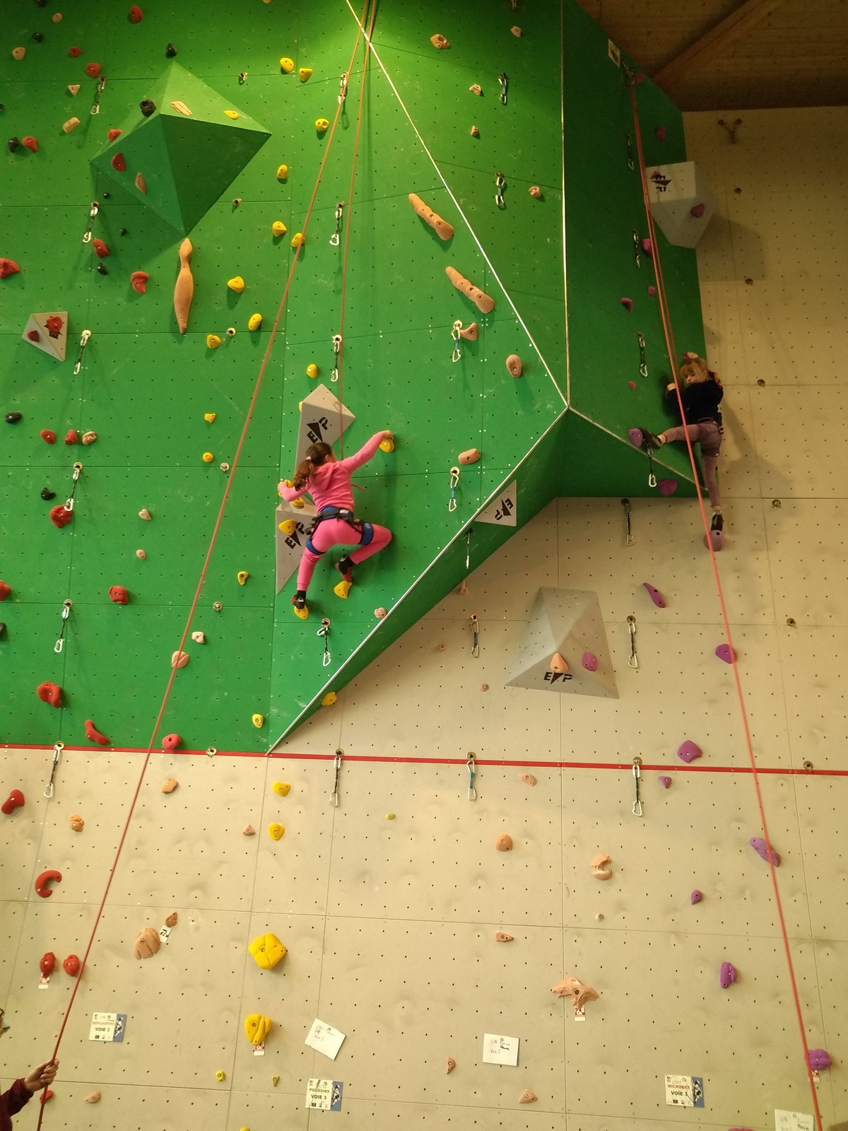 C’est la même voie pour les benjamins et Camille du Ski club part en premier. Ça monte bien mais tombe avant le jeté latéral.