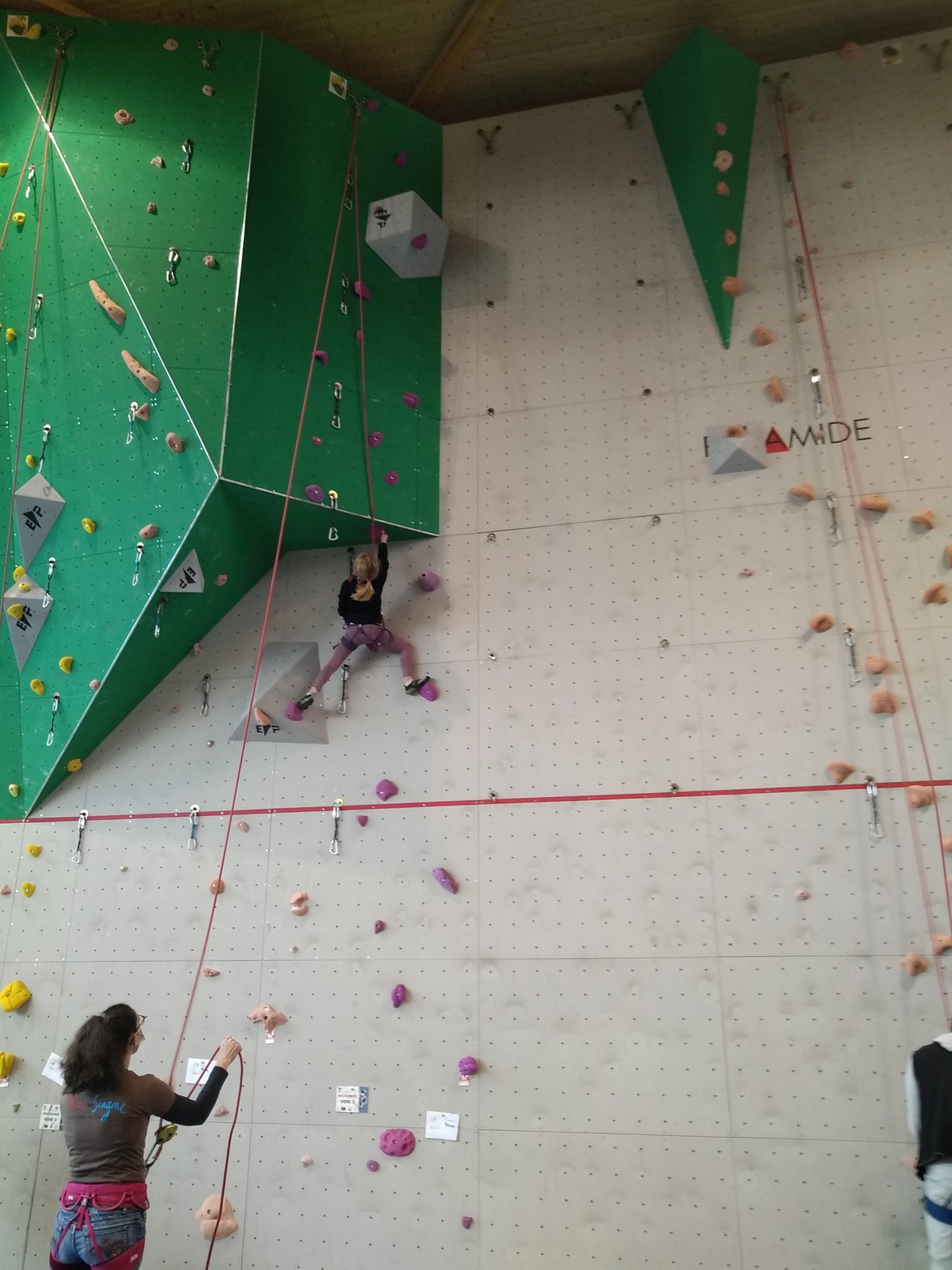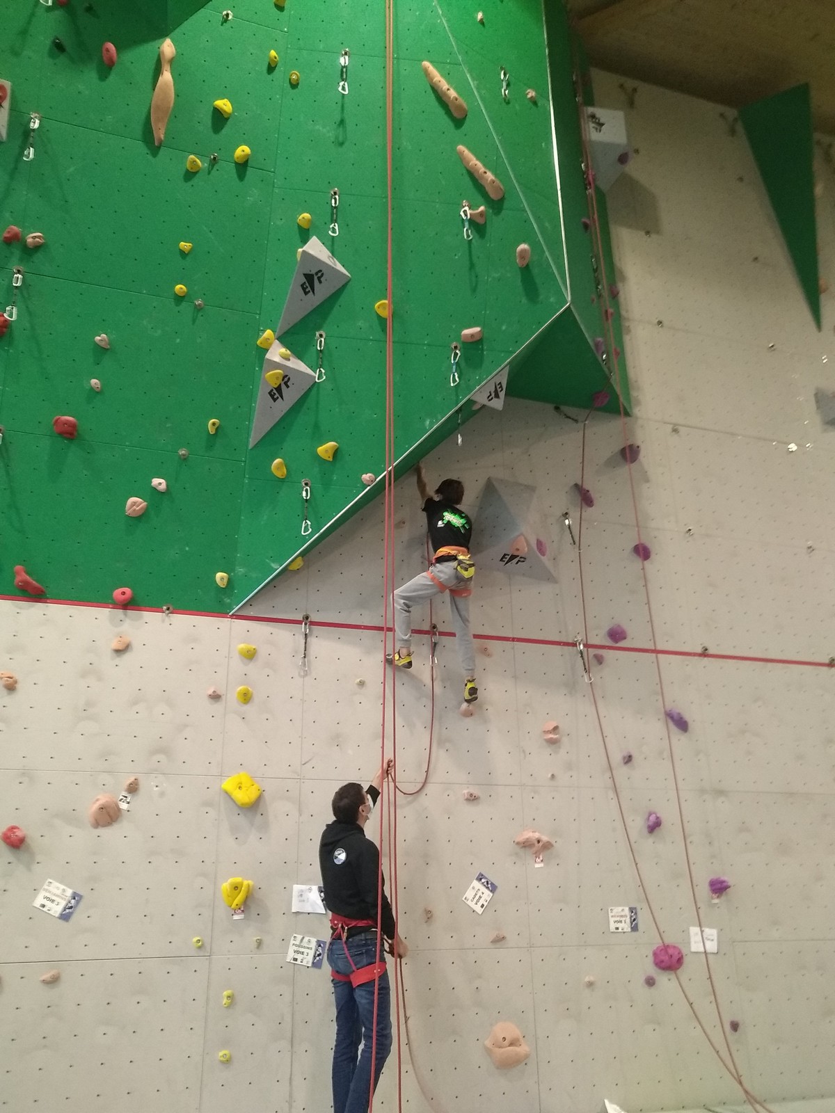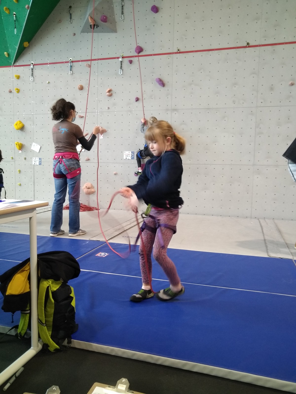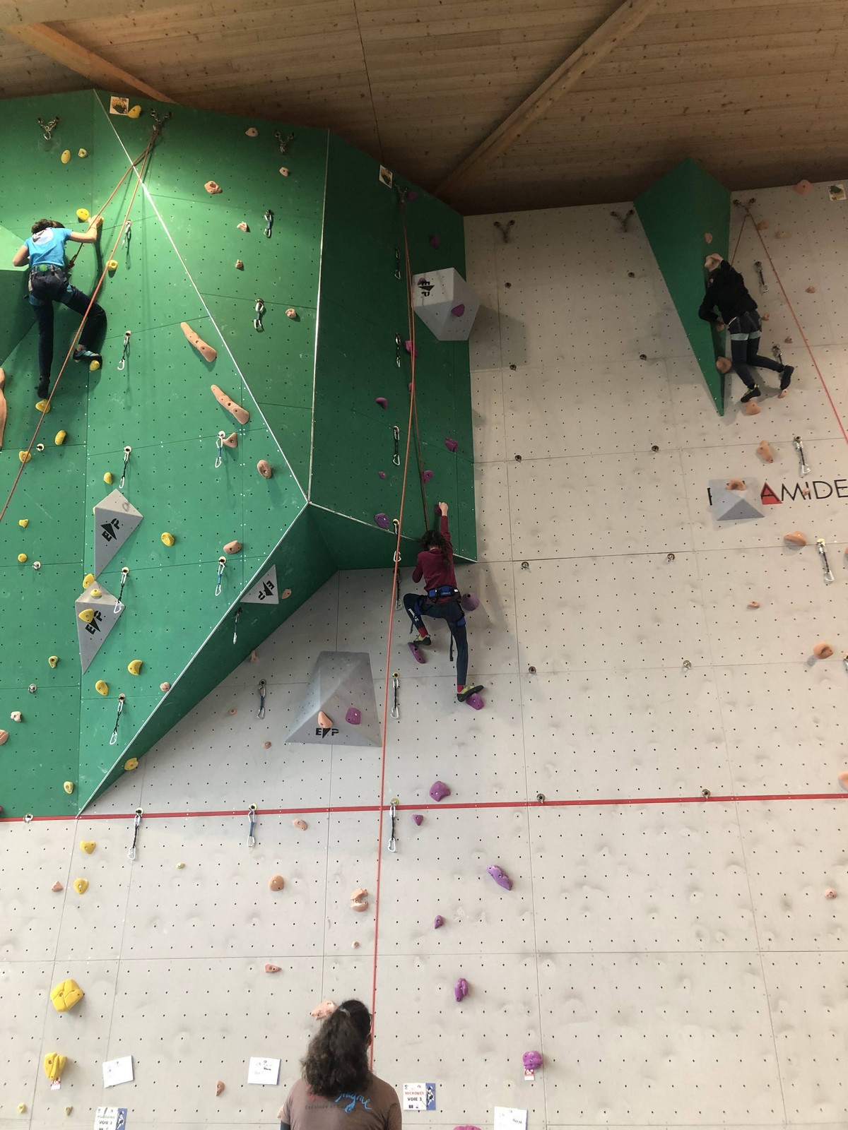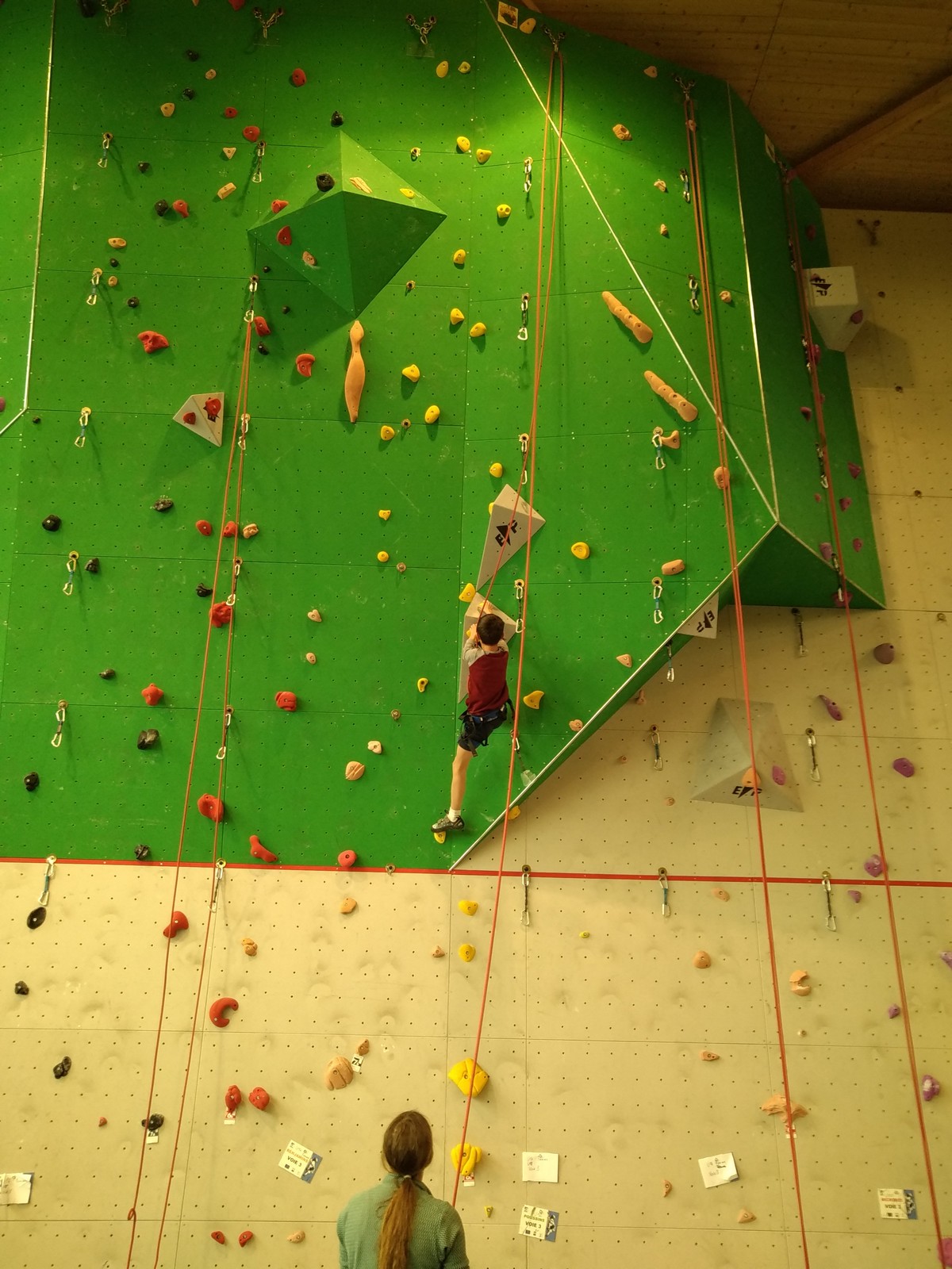C’est la même voie pour les benjamins et Camille du Ski club part en premier. Ça monte bien mais tombe avant le jeté latéral.