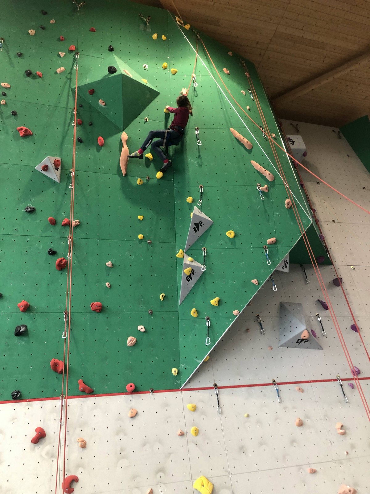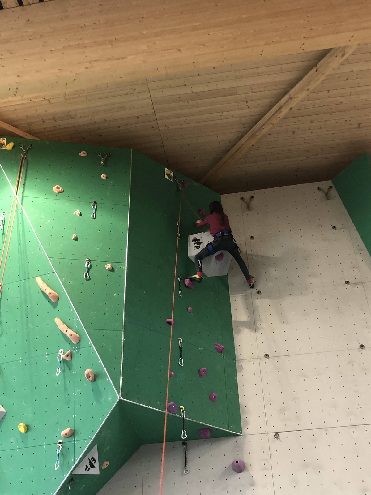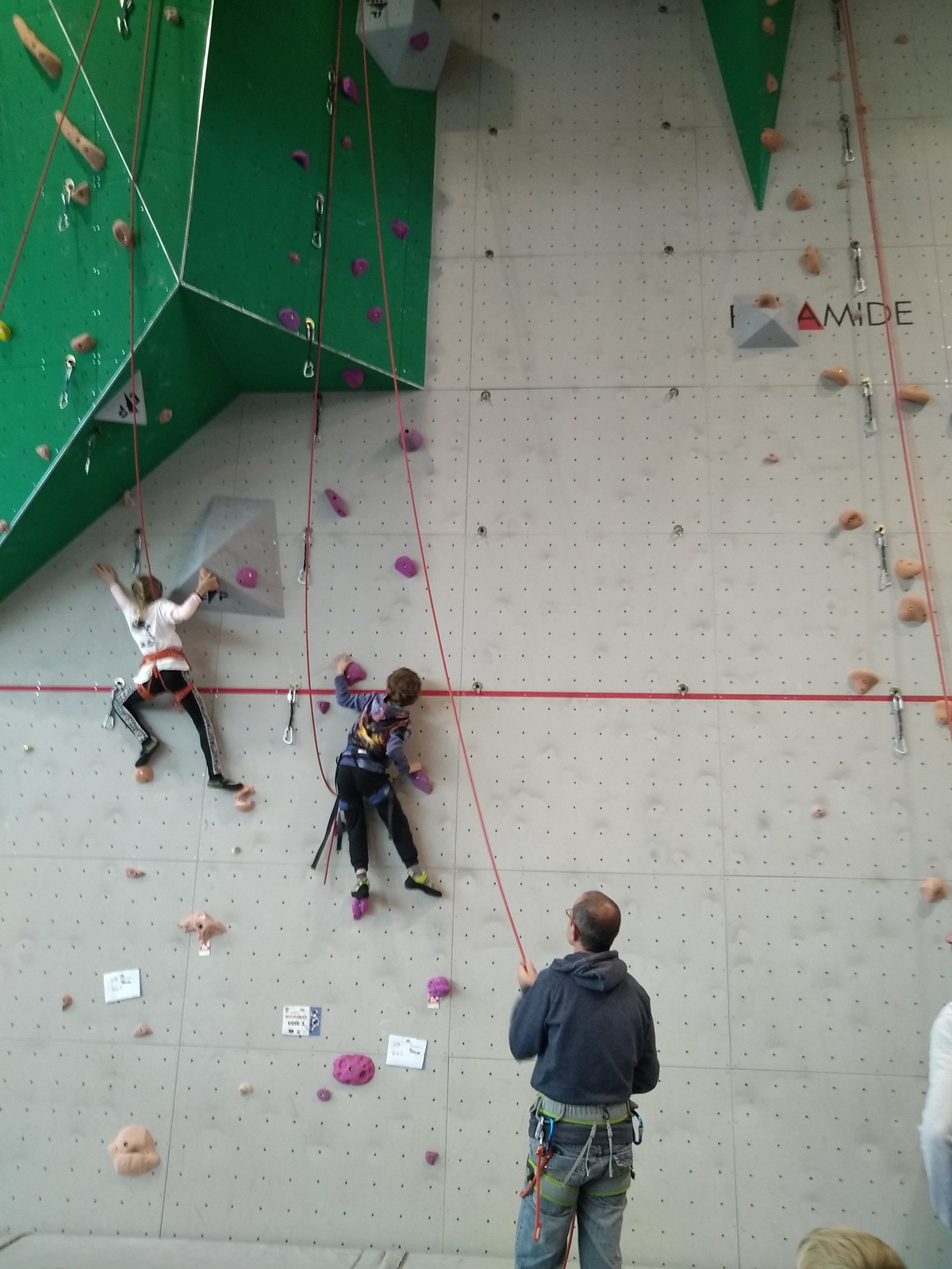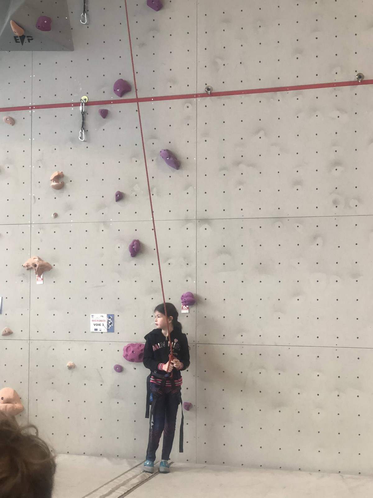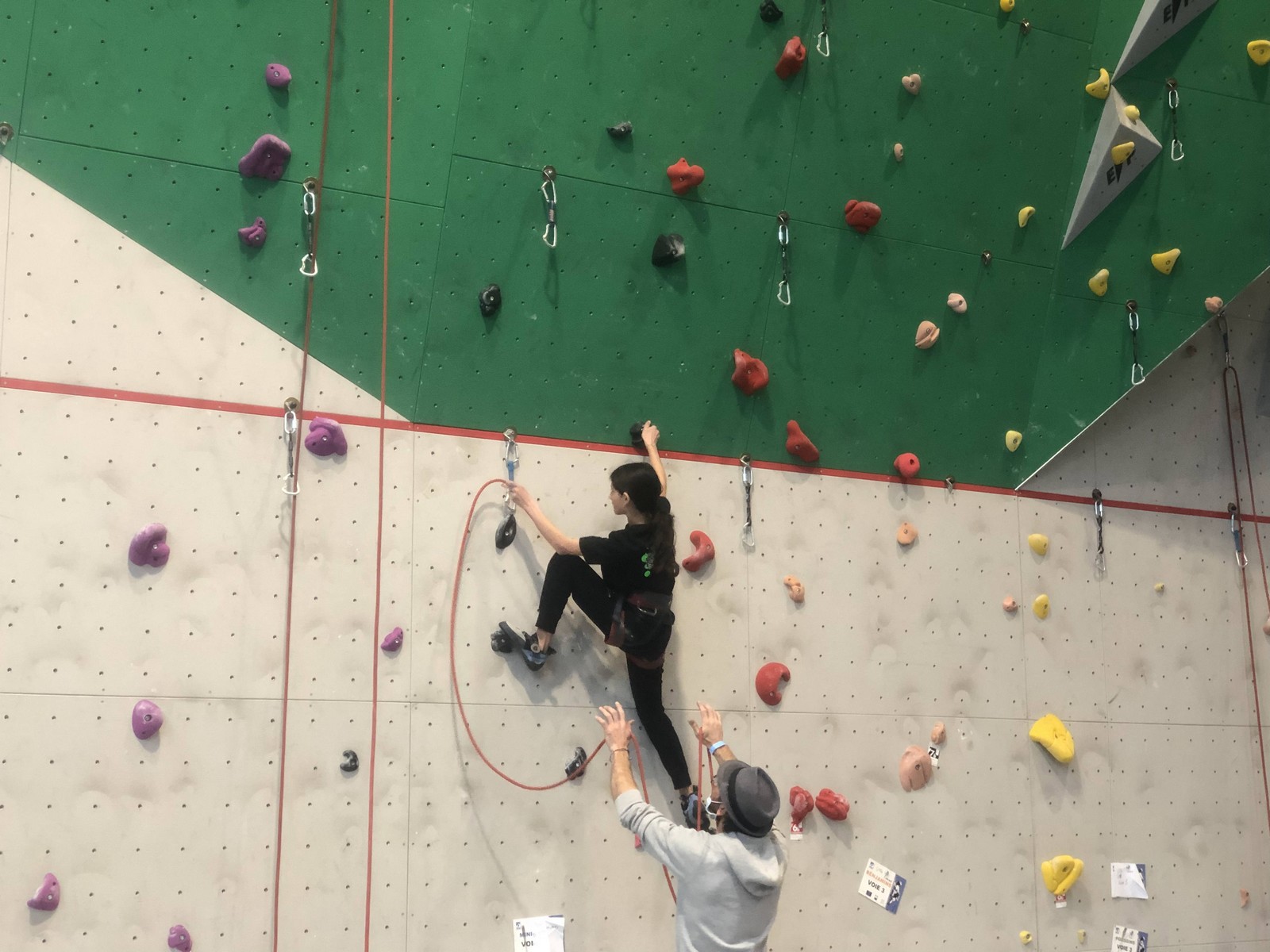 C’est la même voie pour les benjamins et Camille du Ski club part en premier. Ça monte bien mais tombe avant le jeté latéral.