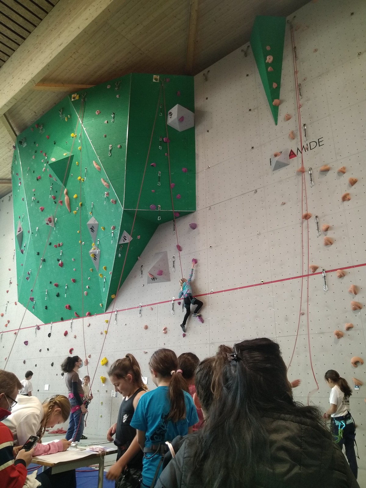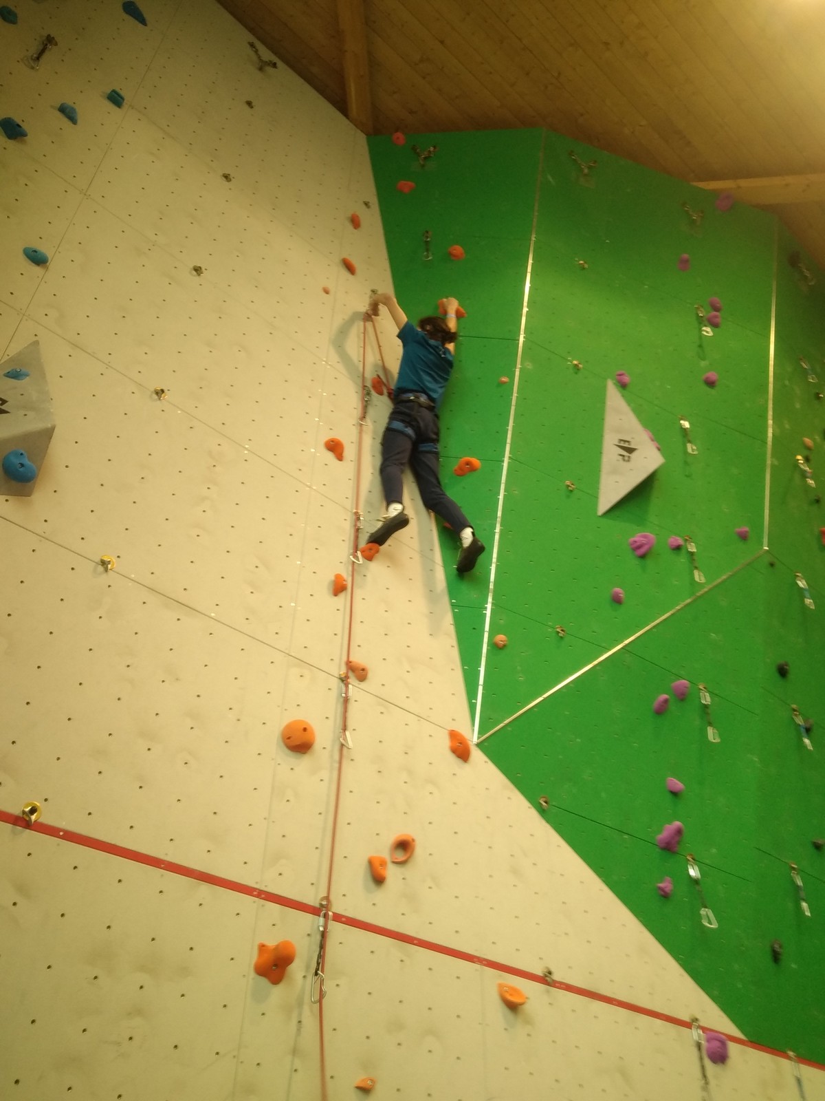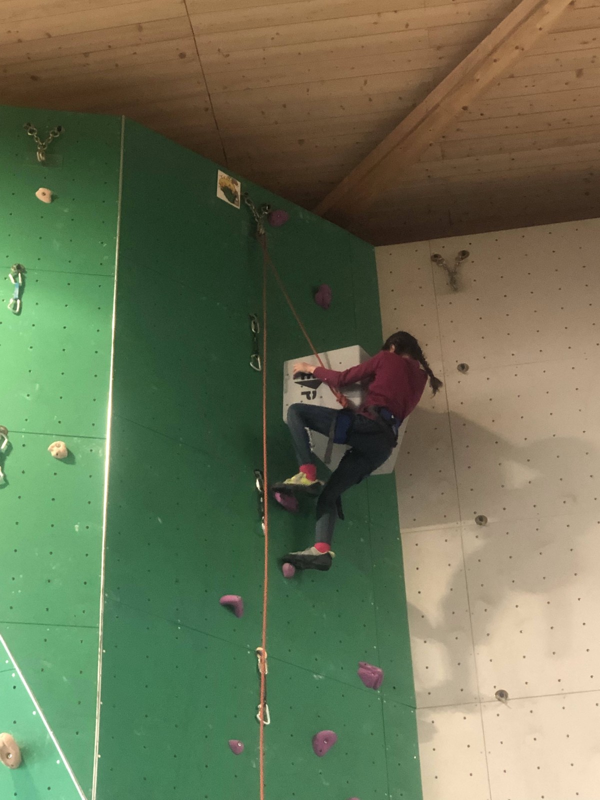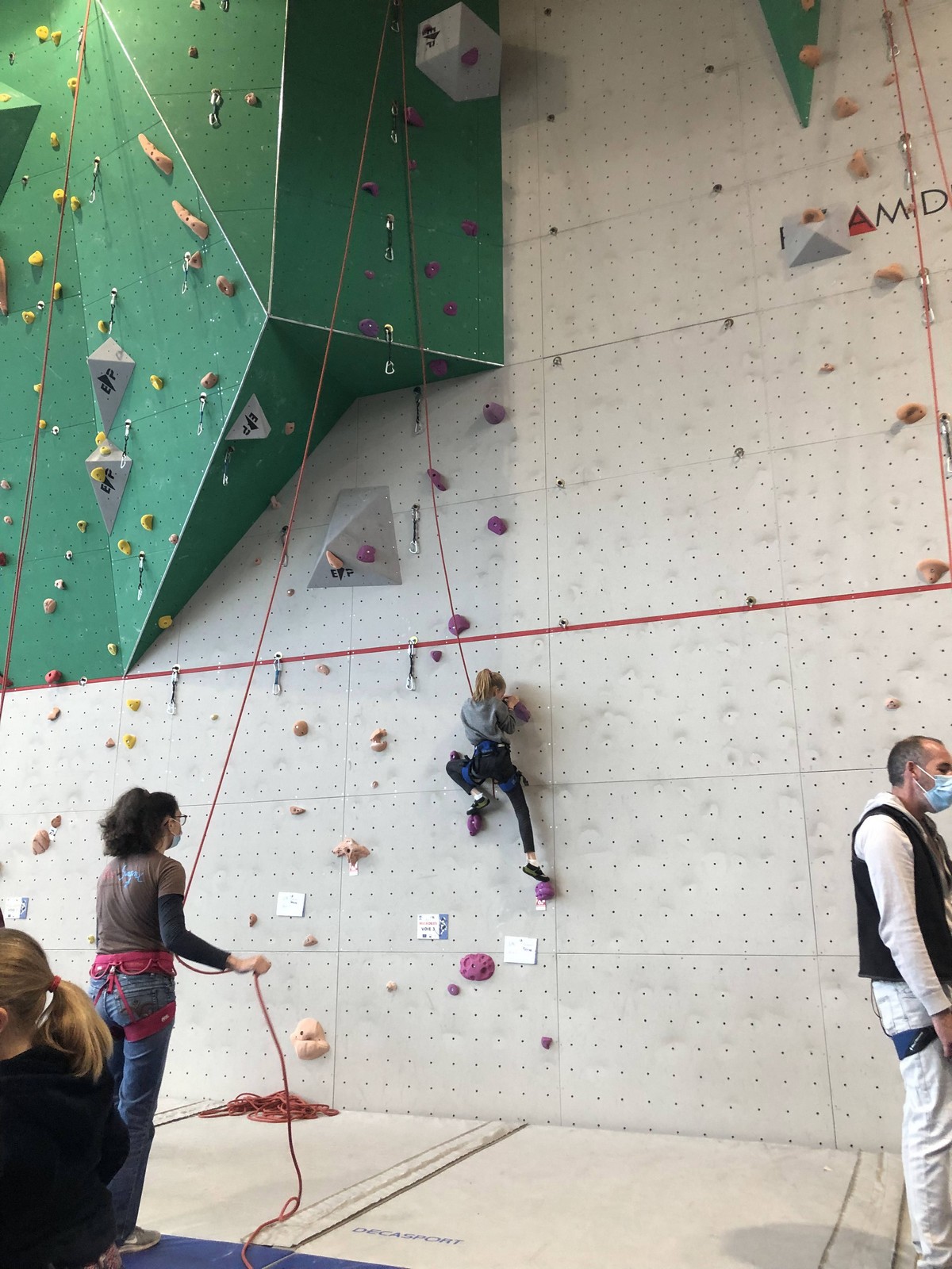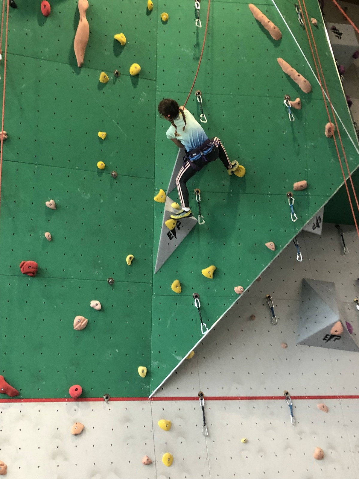 C’est la même voie pour les benjamins et Camille du Ski club part en premier. Ça monte bien mais tombe avant le jeté latéral.