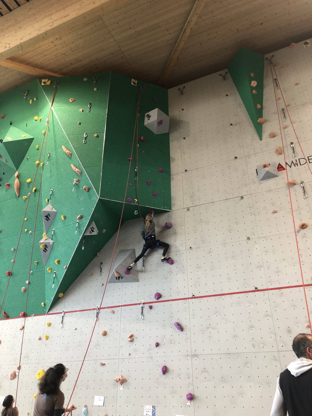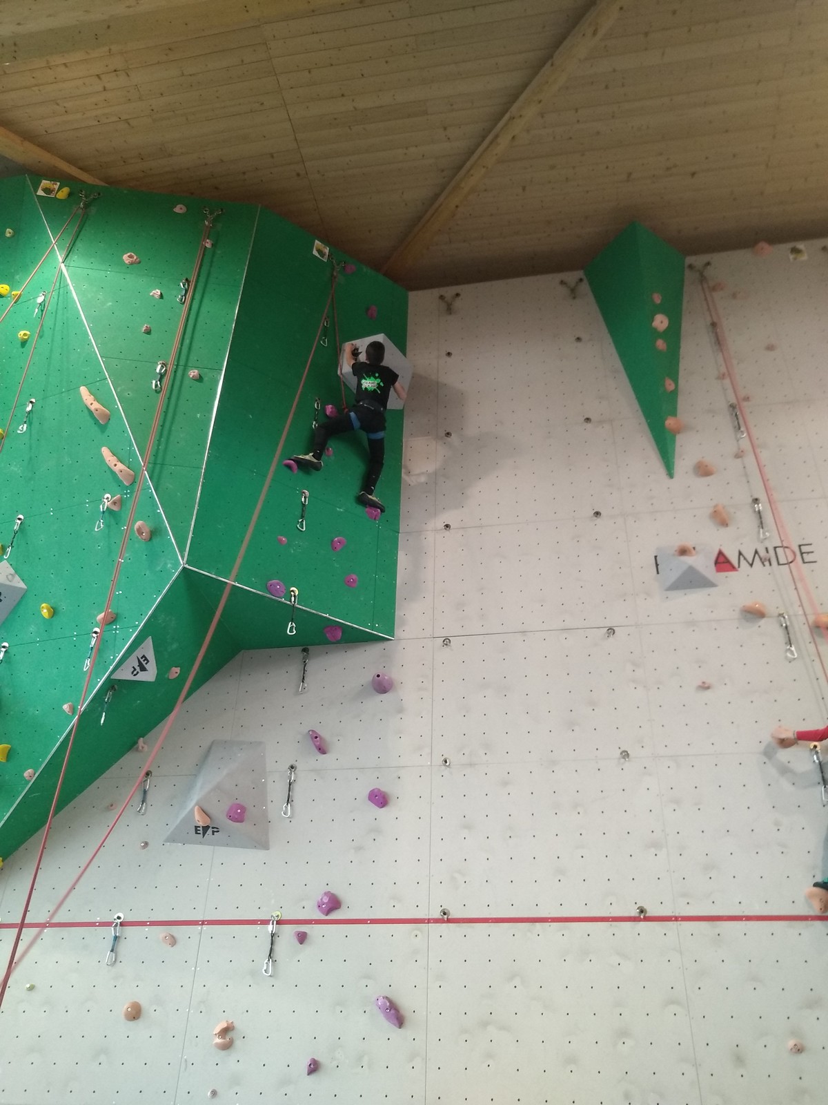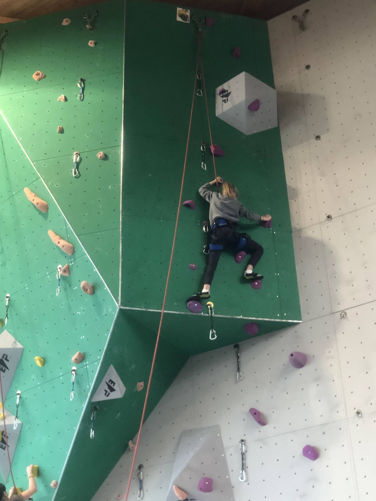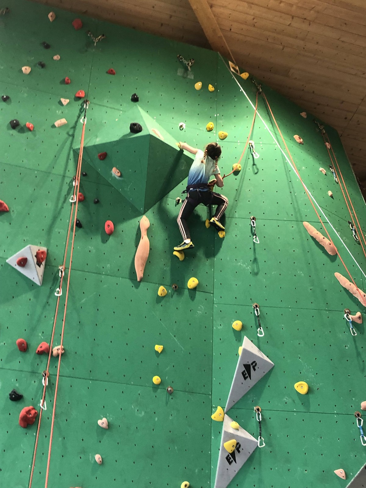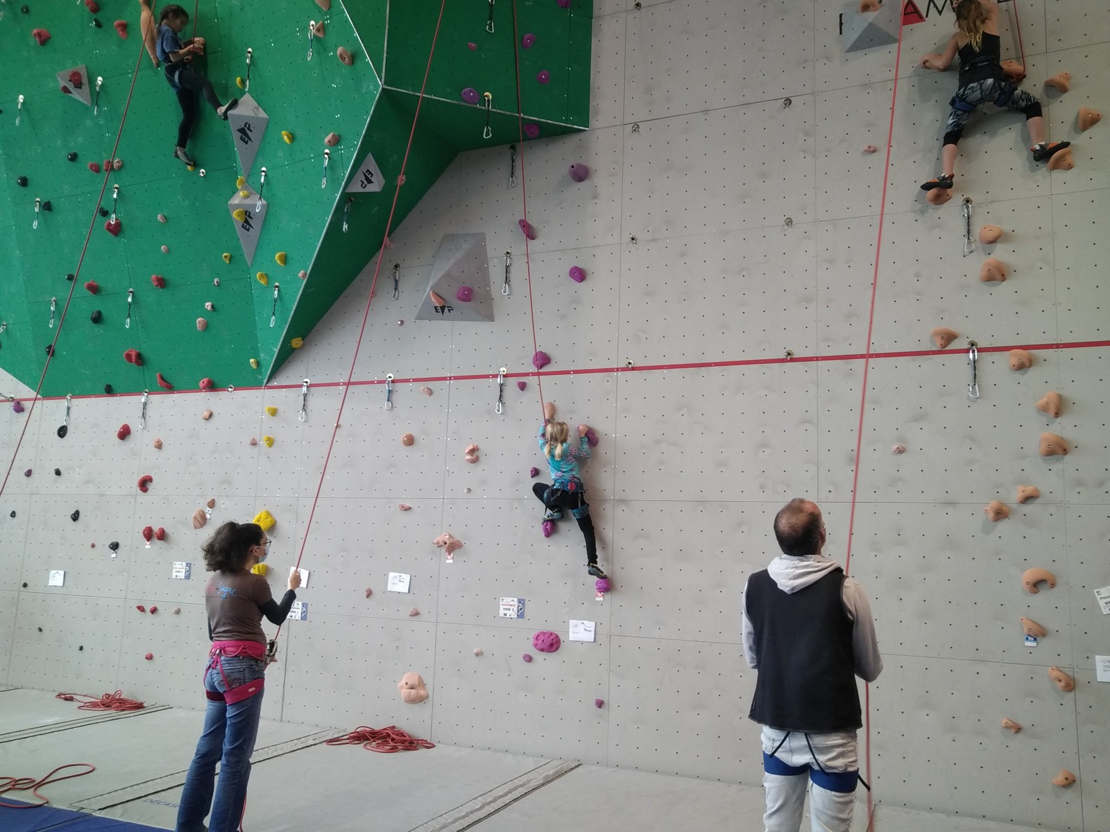 C’est la même voie pour les benjamins et Camille du Ski club part en premier. Ça monte bien mais tombe avant le jeté latéral.
