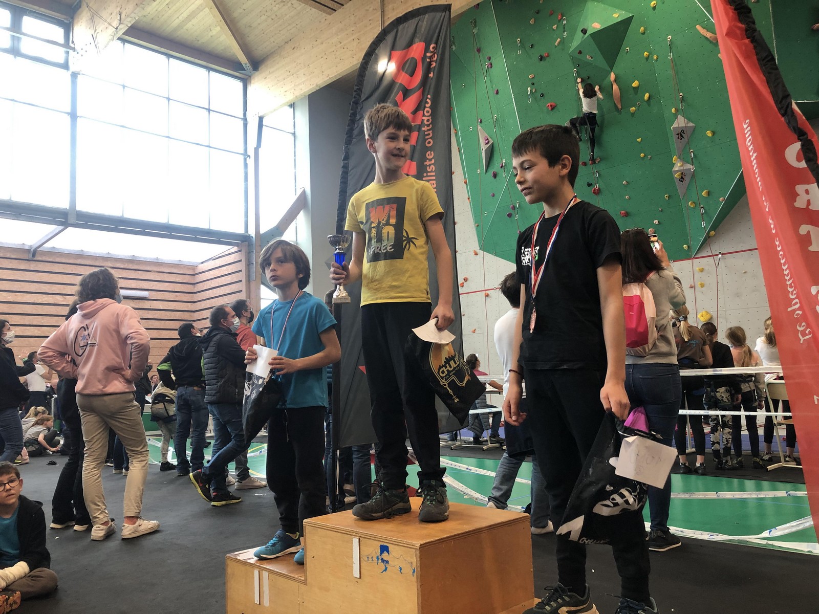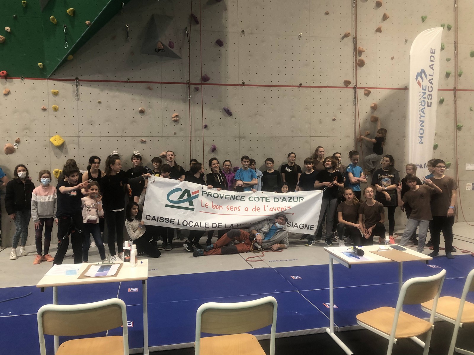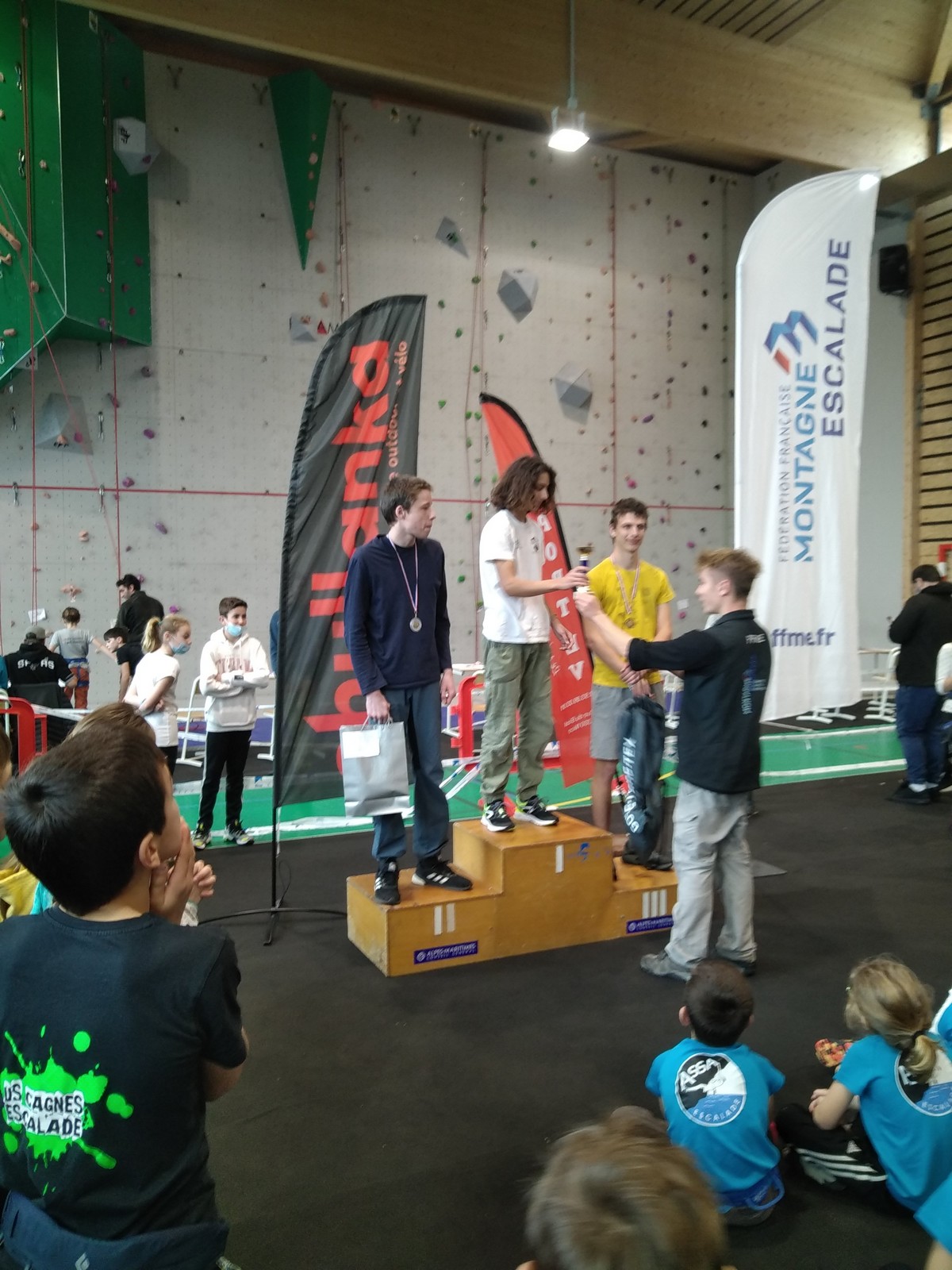 Pendant que Pierre Le Cerf disputait la demi-finale puis la finale du championnat de France de bloc où il termine 7ème après avoir fait une entrée en matière plutôt fracassante en flashant le premier bloc et tenant la tête du classement à la fin du deuxième bloc avant de subir la pression et perdre un peu ses moyens, nous étions avec Sébastien et 35 enfants du club à Pégomas pour la deuxième manche du challenge Berhault au collège Arnaud Beltrame.