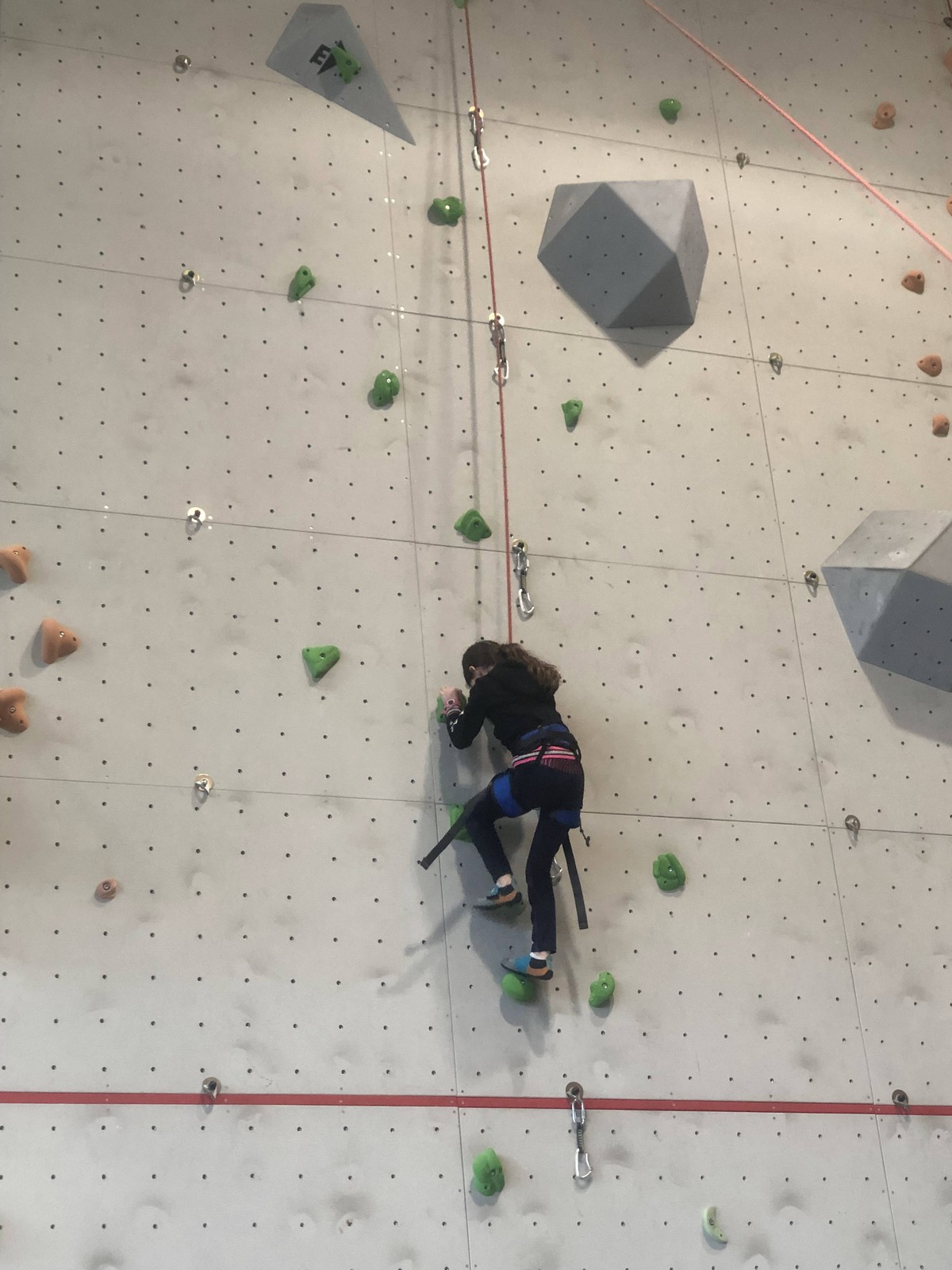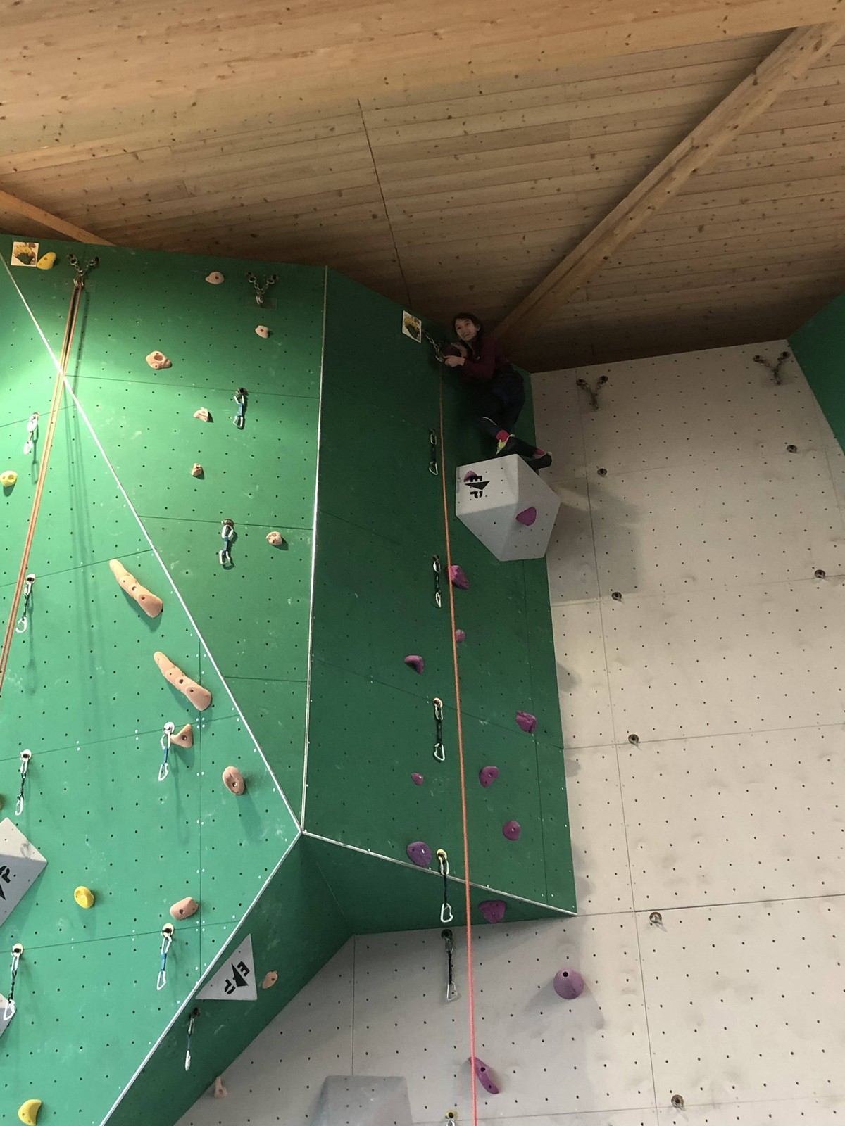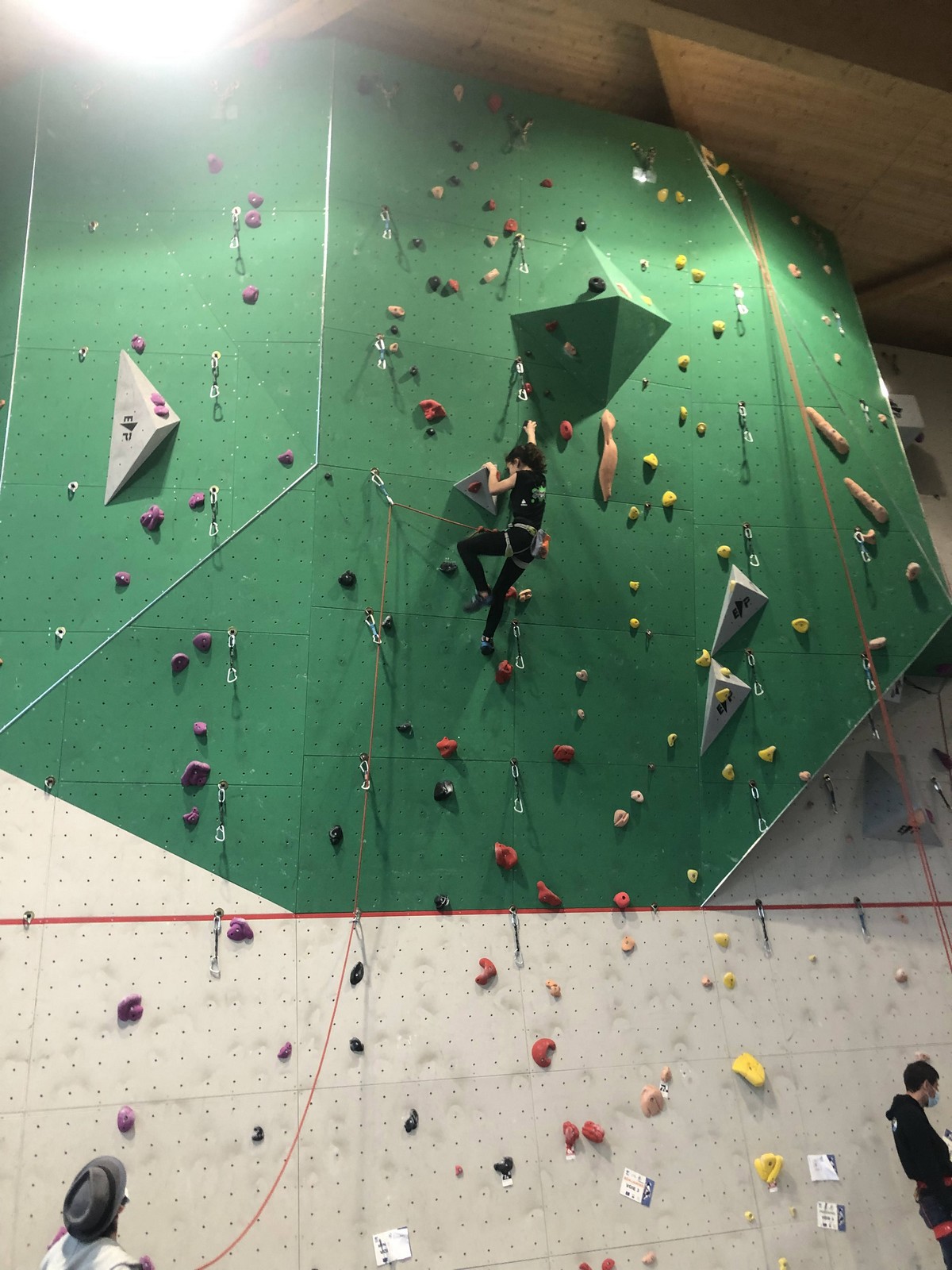 Hanaé est la première à s’engager. Elle grimpe comme elle sait faire : tout en dynamisme et précision, vite et bien. Aux trois quarts de la voie, un jeté latéral manqué l’envoie dans la corde. Pas mal !