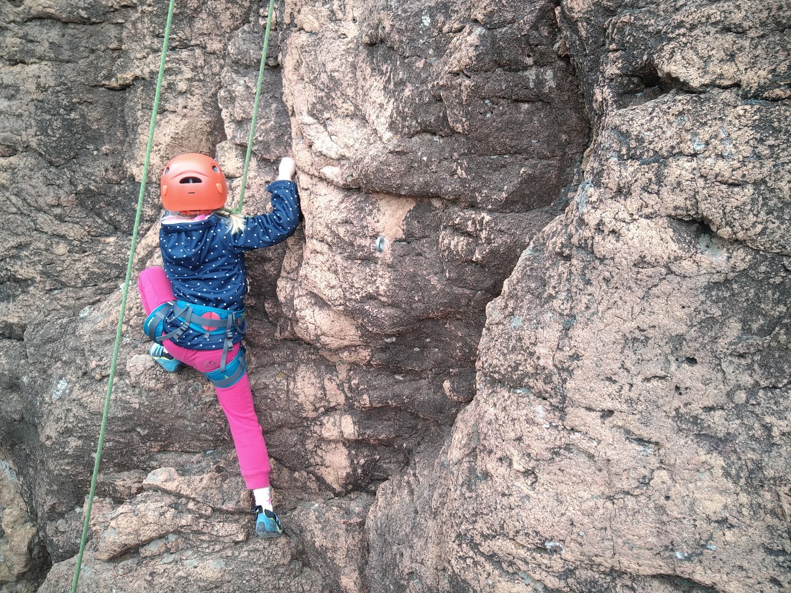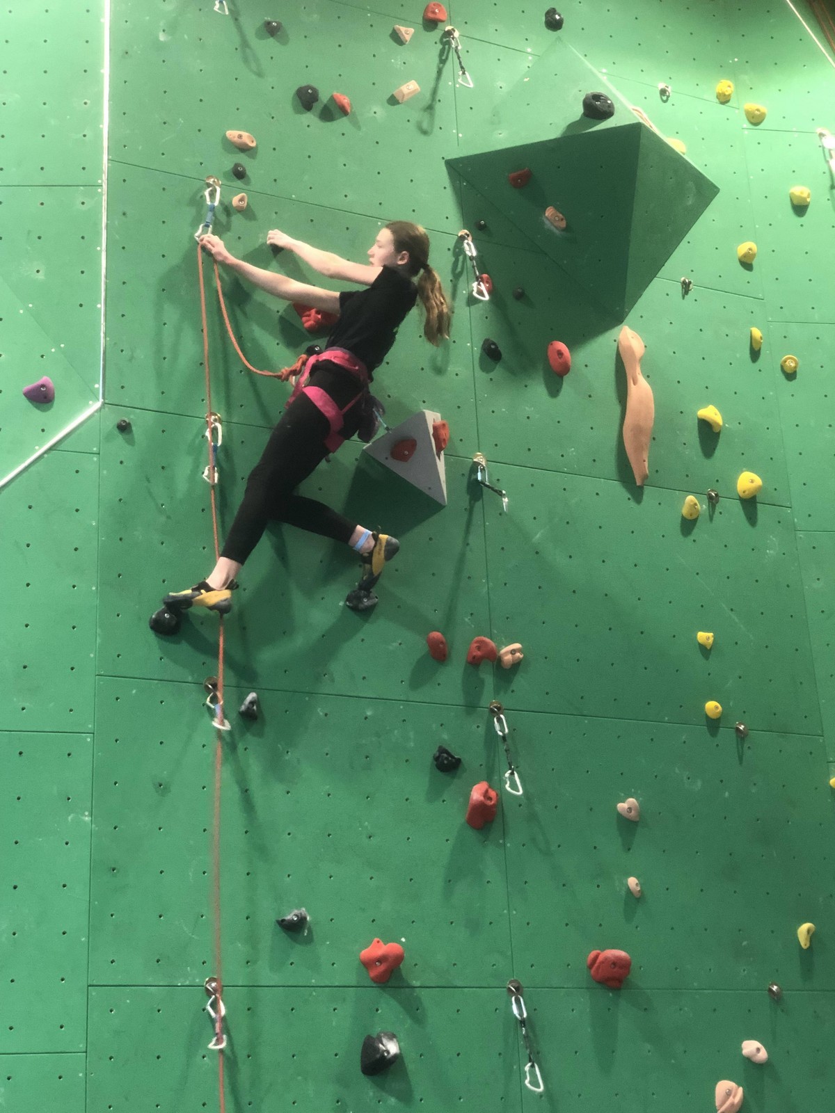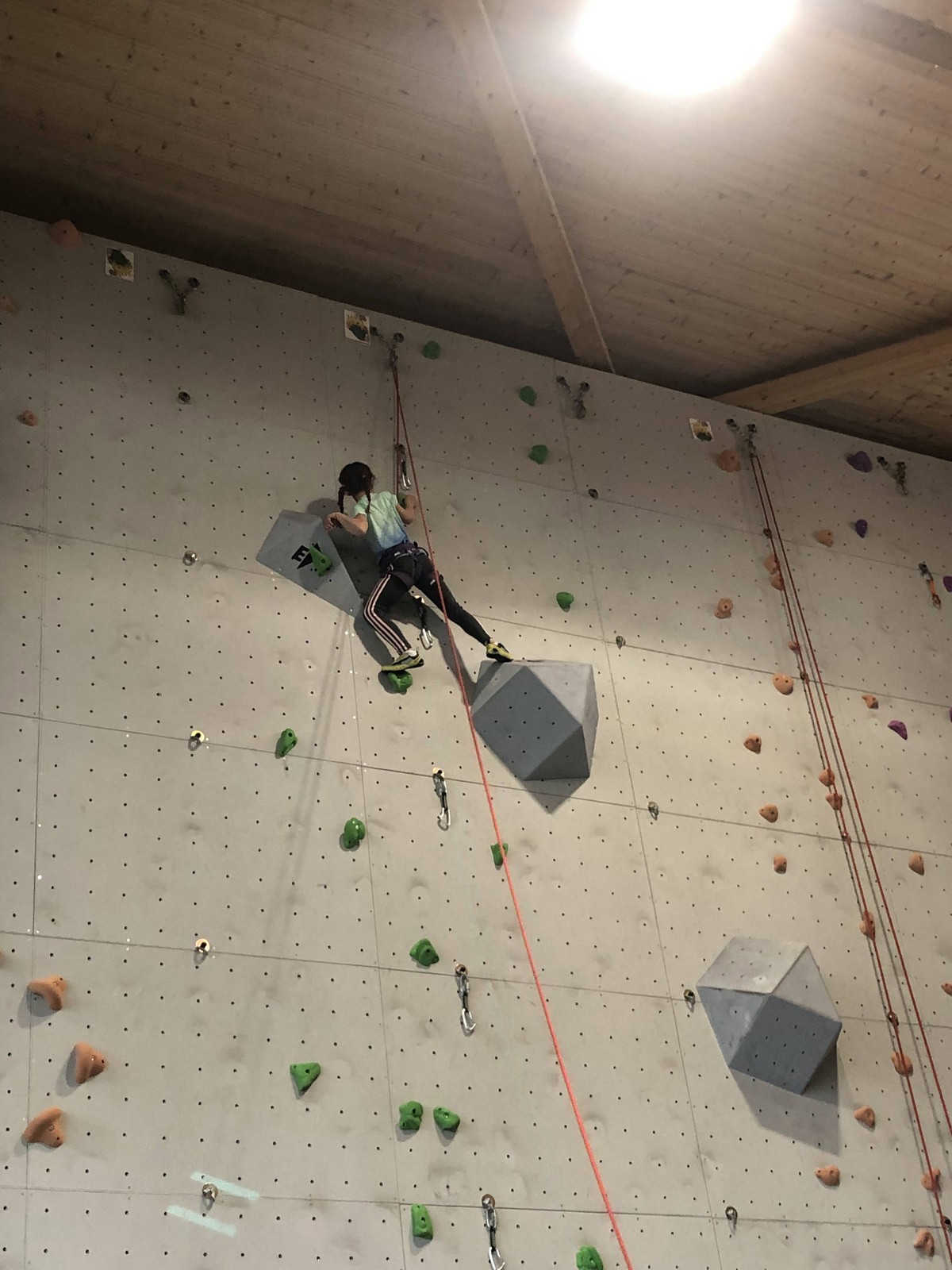 Hanaé est la première à s’engager. Elle grimpe comme elle sait faire : tout en dynamisme et précision, vite et bien. Aux trois quarts de la voie, un jeté latéral manqué l’envoie dans la corde. Pas mal !