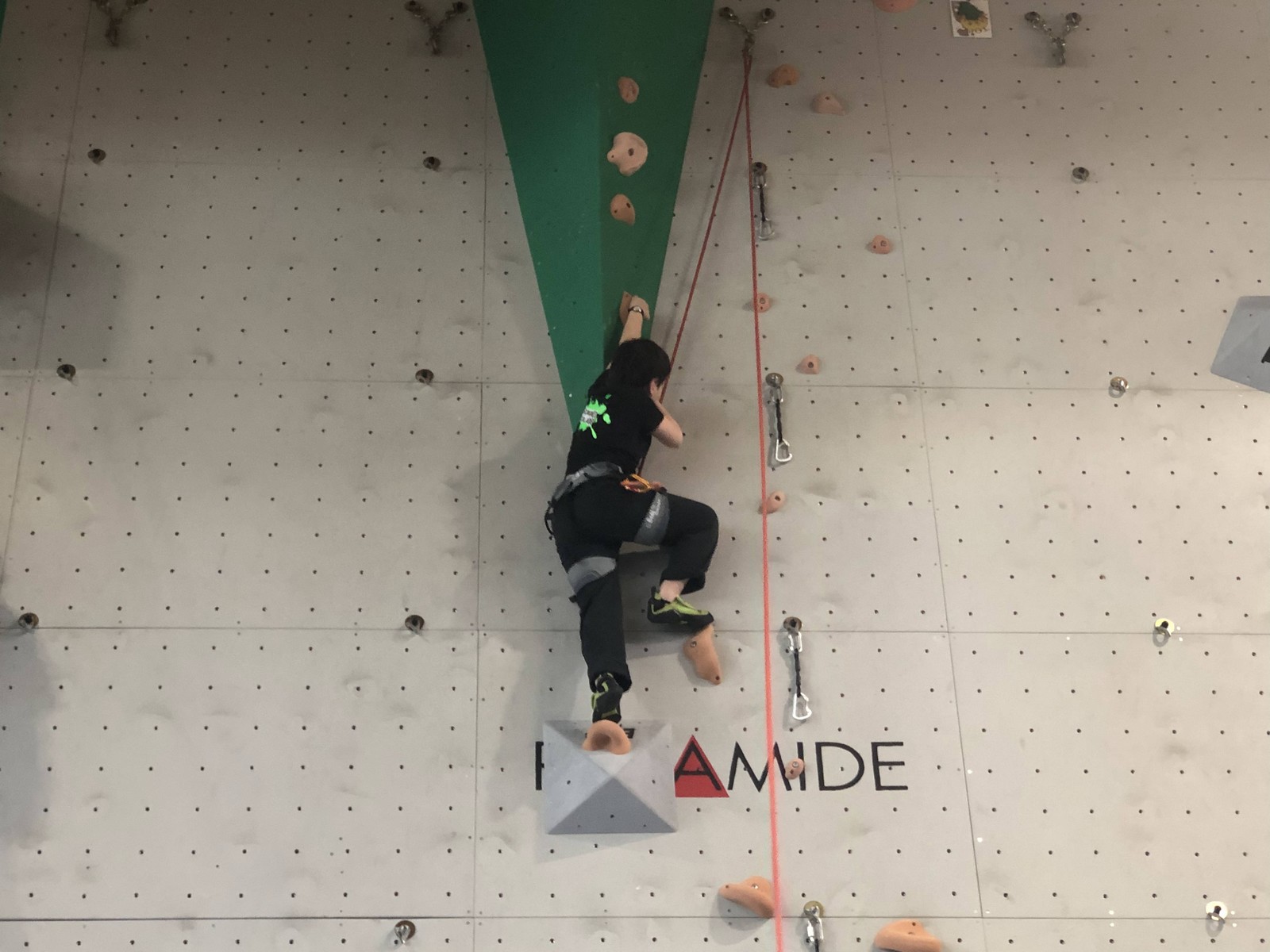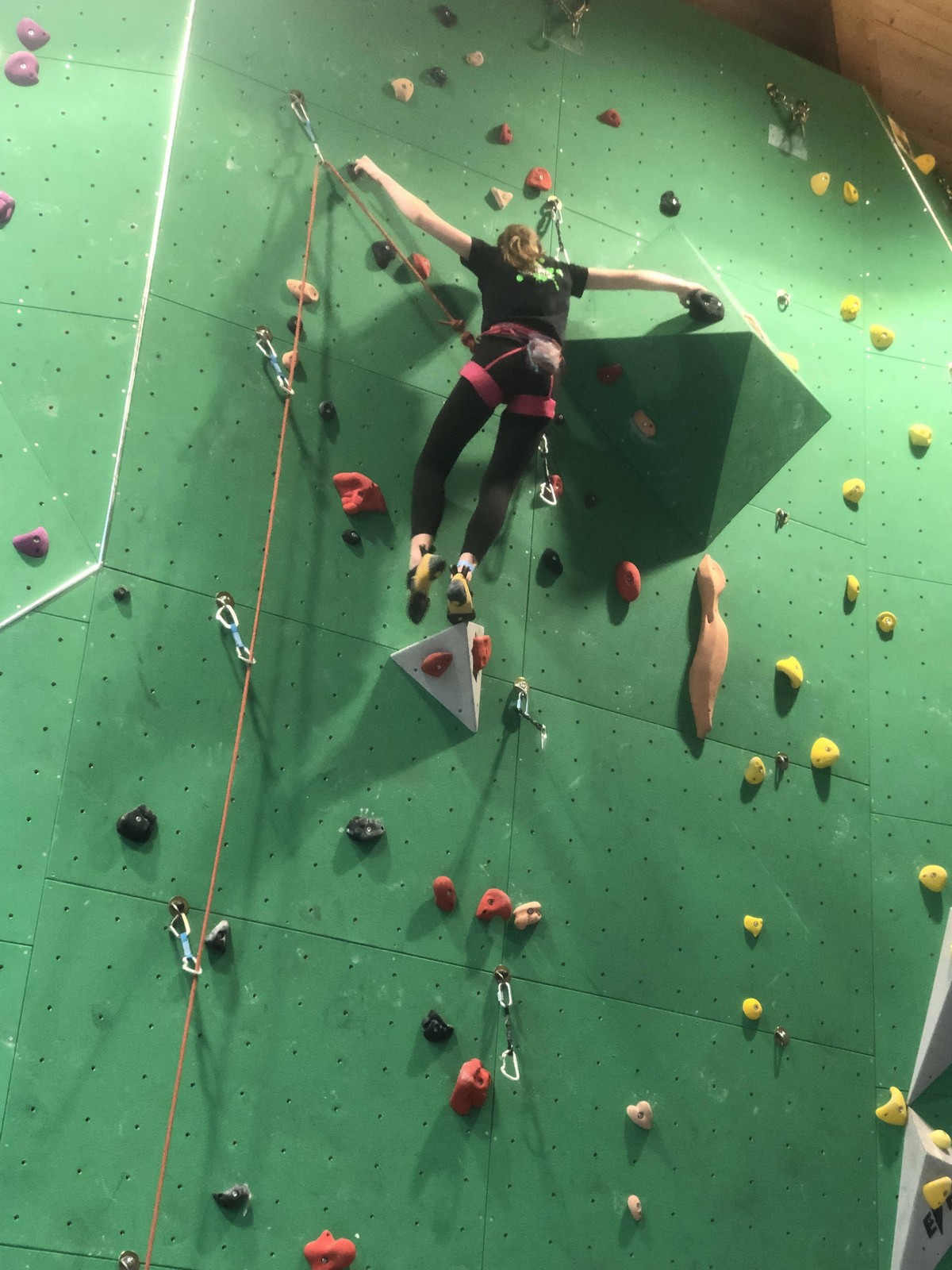 Elles sont donc 3 à s’élancer, Lya la première. Lya a de la marge et l’avantage de la taille, mais peu d’expérience et ne part pas concentrée. Elle se trompe sur beaucoup de mouvements mais parvient à s’en sortir malgré le coût en énergie. Aux trois quarts de la voie, elle choisit la mauvaise prise en allant chercher une prise de pied main droite et ça ne pardonne pas !