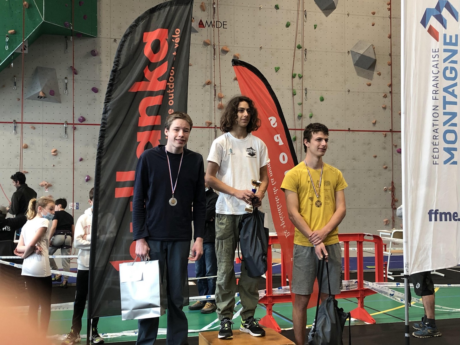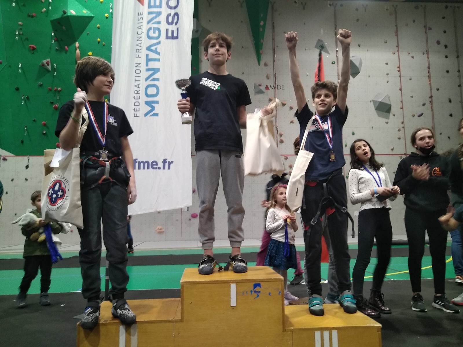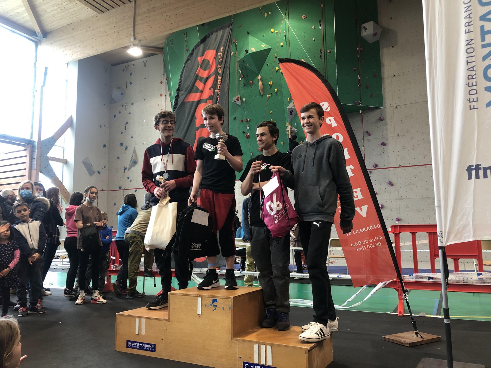 Chez les garçons, Théo et Mathis représentent le club. Mathis place les pieds trop haut dans la traversée finale de la voie 3 et ne parvient pas à déclencher le dernier mouvement. Il termine 3ème, déçu. Théo, qui passait après et fort de cette expérience, ne fait pas la même erreur et termine en finale avec ses 3 voies en poche.