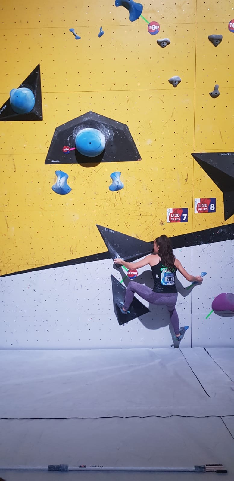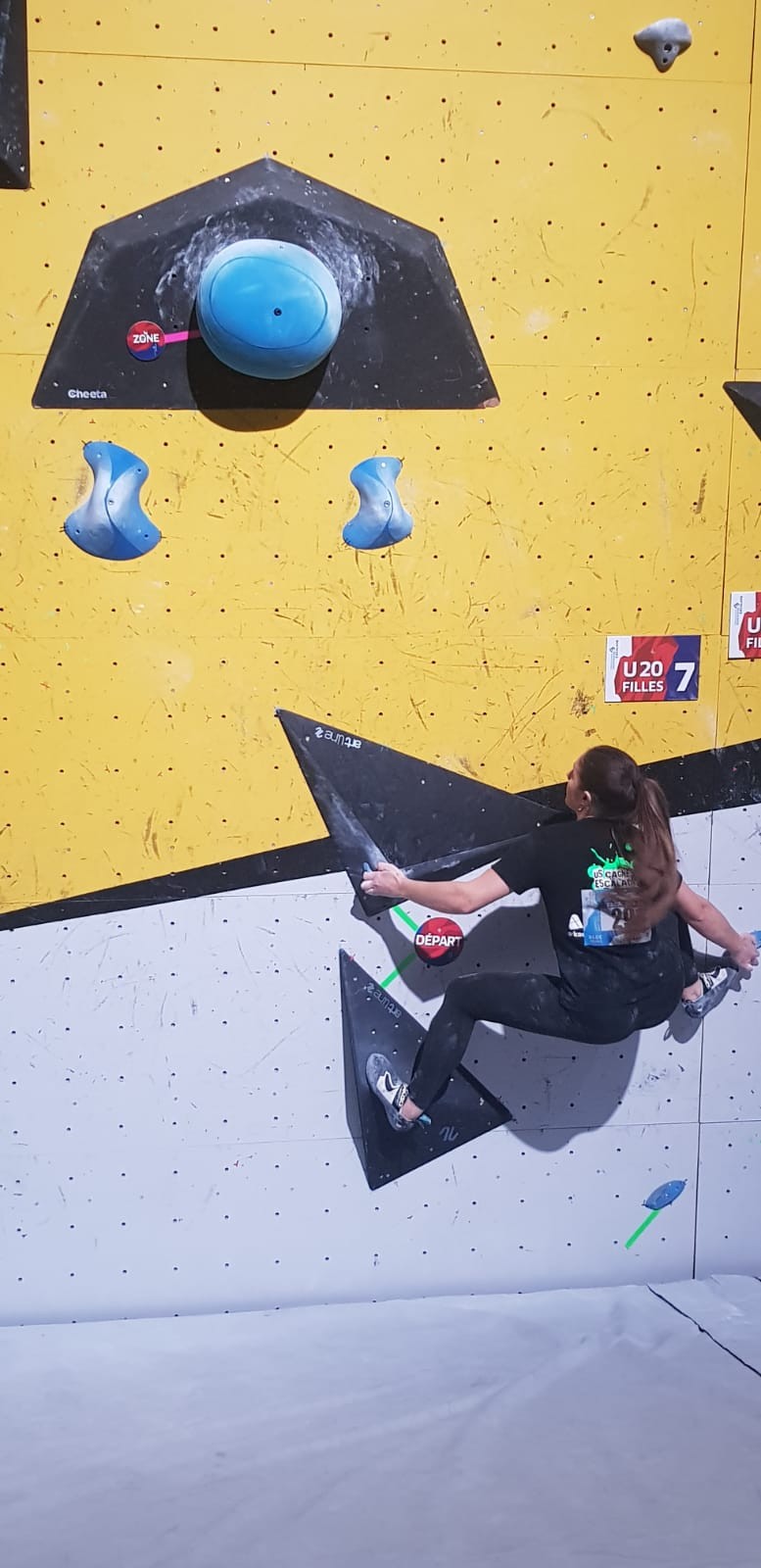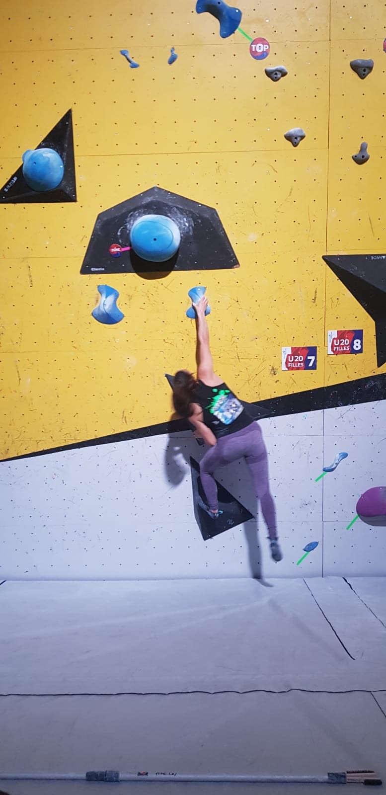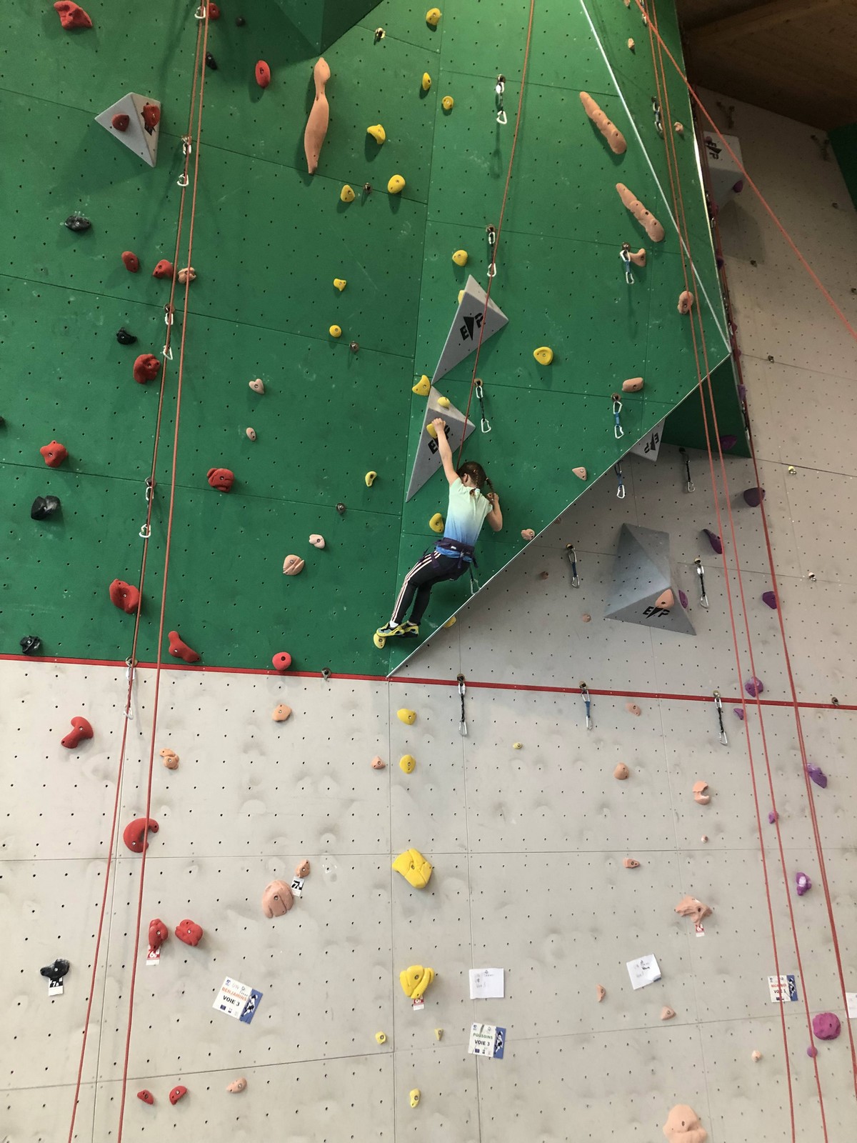 Les 3 premières voies étaient vraiment faciles pour Léane, Hanaé et Emma. Leur voie de finale, c’est une autre paire de manche. Bonne rési sur prises moyennes, pas très compliquée en lecture mais qui zigzague pas mal.