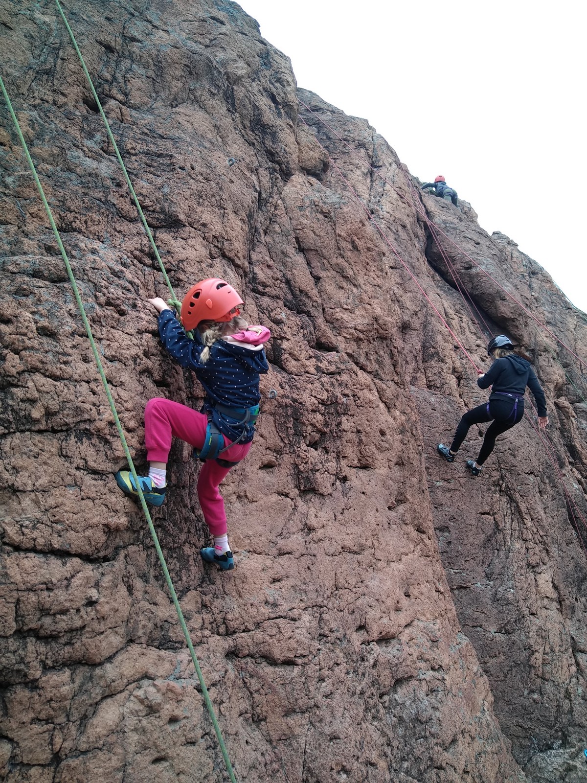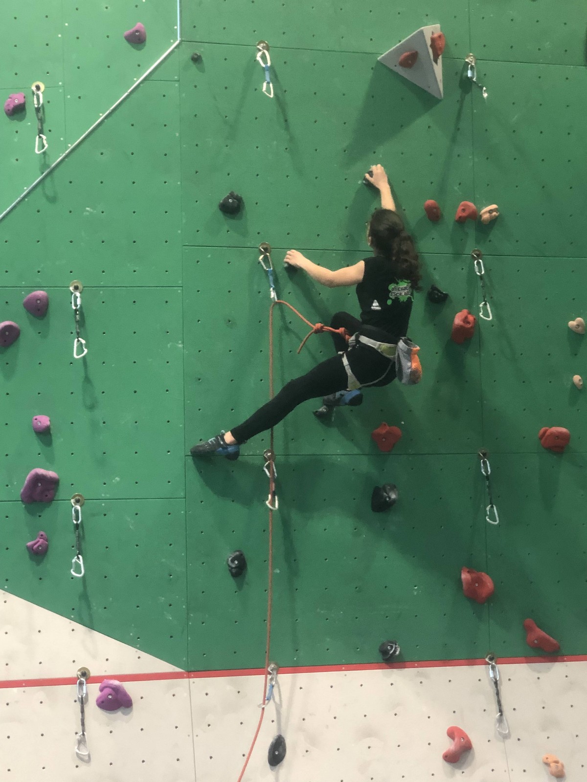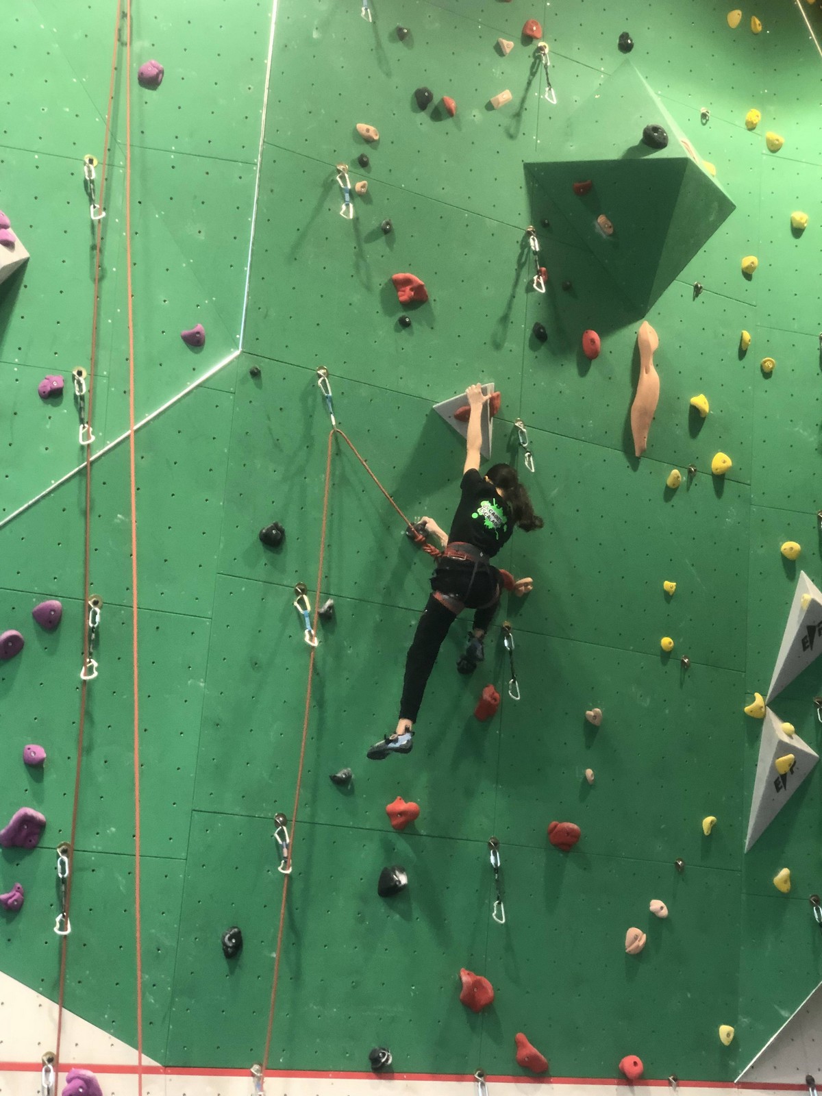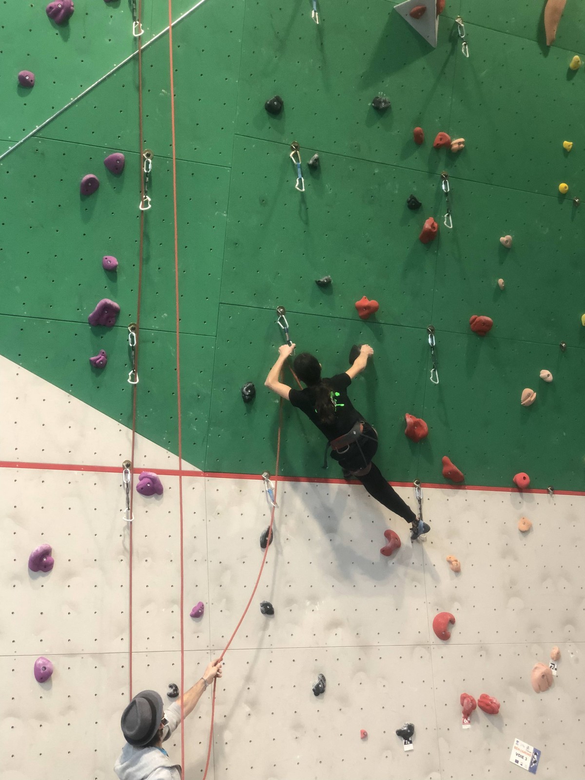 Les 3 premières voies étaient vraiment faciles pour Léane, Hanaé et Emma. Leur voie de finale, c’est une autre paire de manche. Bonne rési sur prises moyennes, pas très compliquée en lecture mais qui zigzague pas mal.