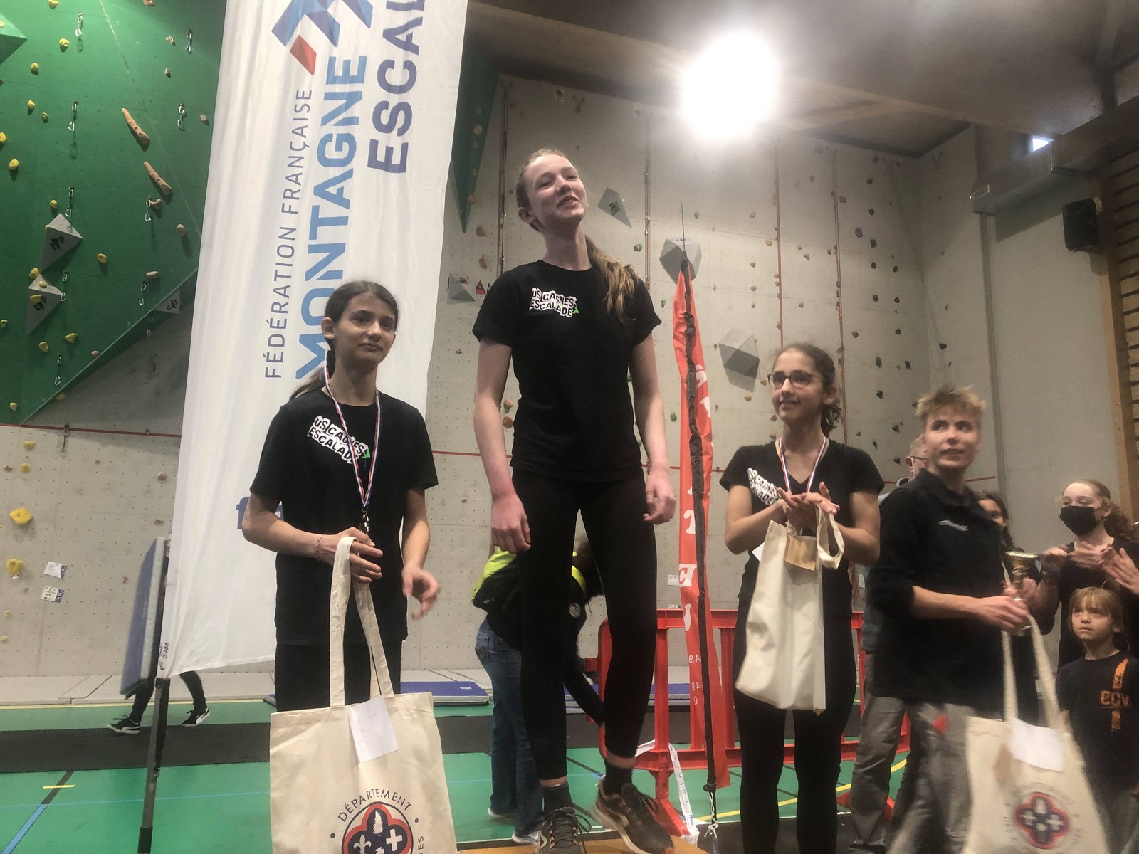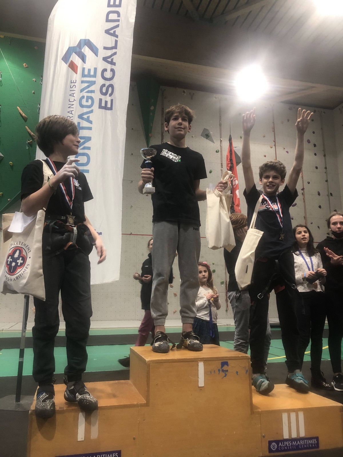 Ils sont 6 dont 3 de l’USCagnes à sortir la voie 3 et à se retrouver un finale : Gabriel et Timéo, sans surprise, mais aussi Matéo qui a topé la voie en même temps que le gong ! Ouf !