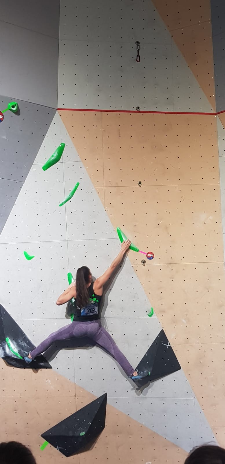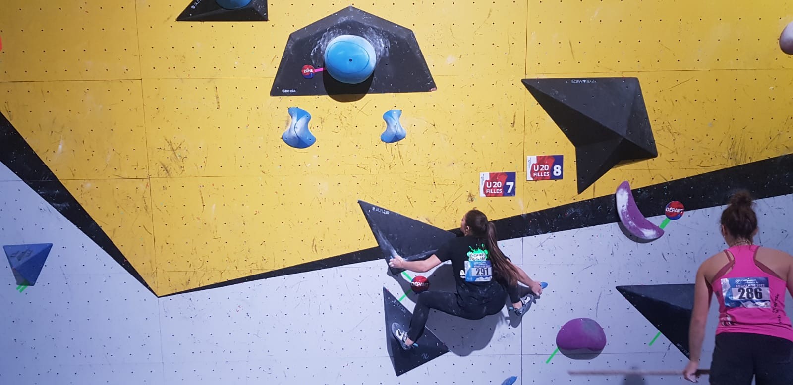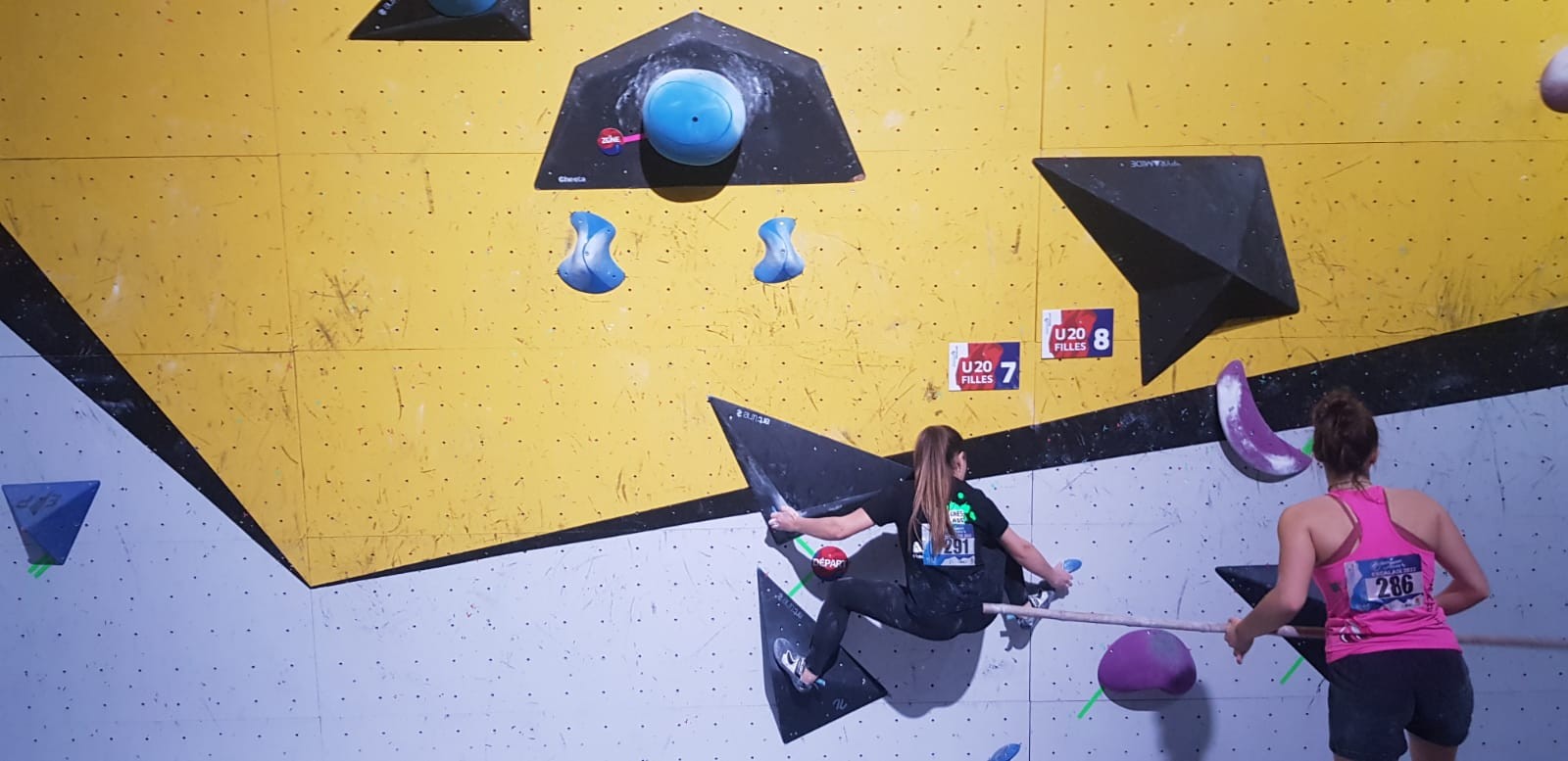 La dernière à s’élancer, Kahestelle, du club de Villeneuve-Loubet, grimpe beaucoup moins bien que Romane. On la sent tendue et beaucoup moins à l’aise dans les mouvements mais ça passe malgré tout. Elle arrive à développer un tout petit peu plus que Romane et tombe sur la prise que Romane a manqué. Elle passe devant d’un cheveu ! Bravo à elle.