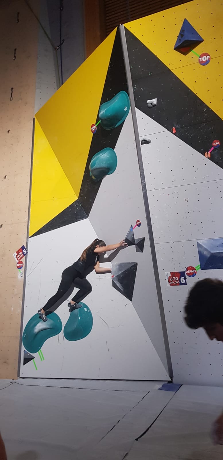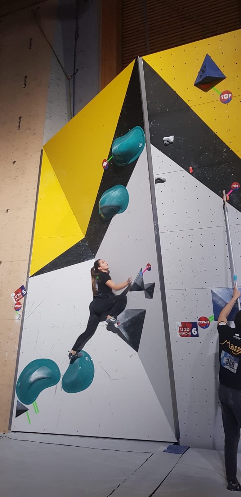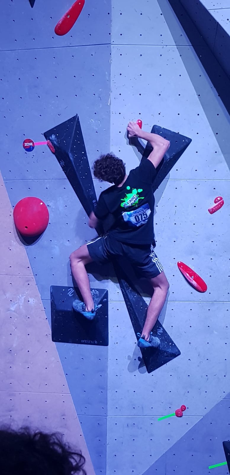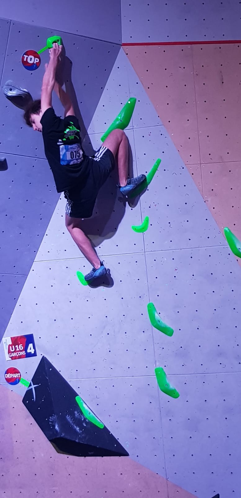 Chez les garçons, Arthur fait une belle prestation dans les 2 premières voies mais le manque d’expérience lui vaudra une chute dans la voie 3 qui lui donne la 15ème place.
