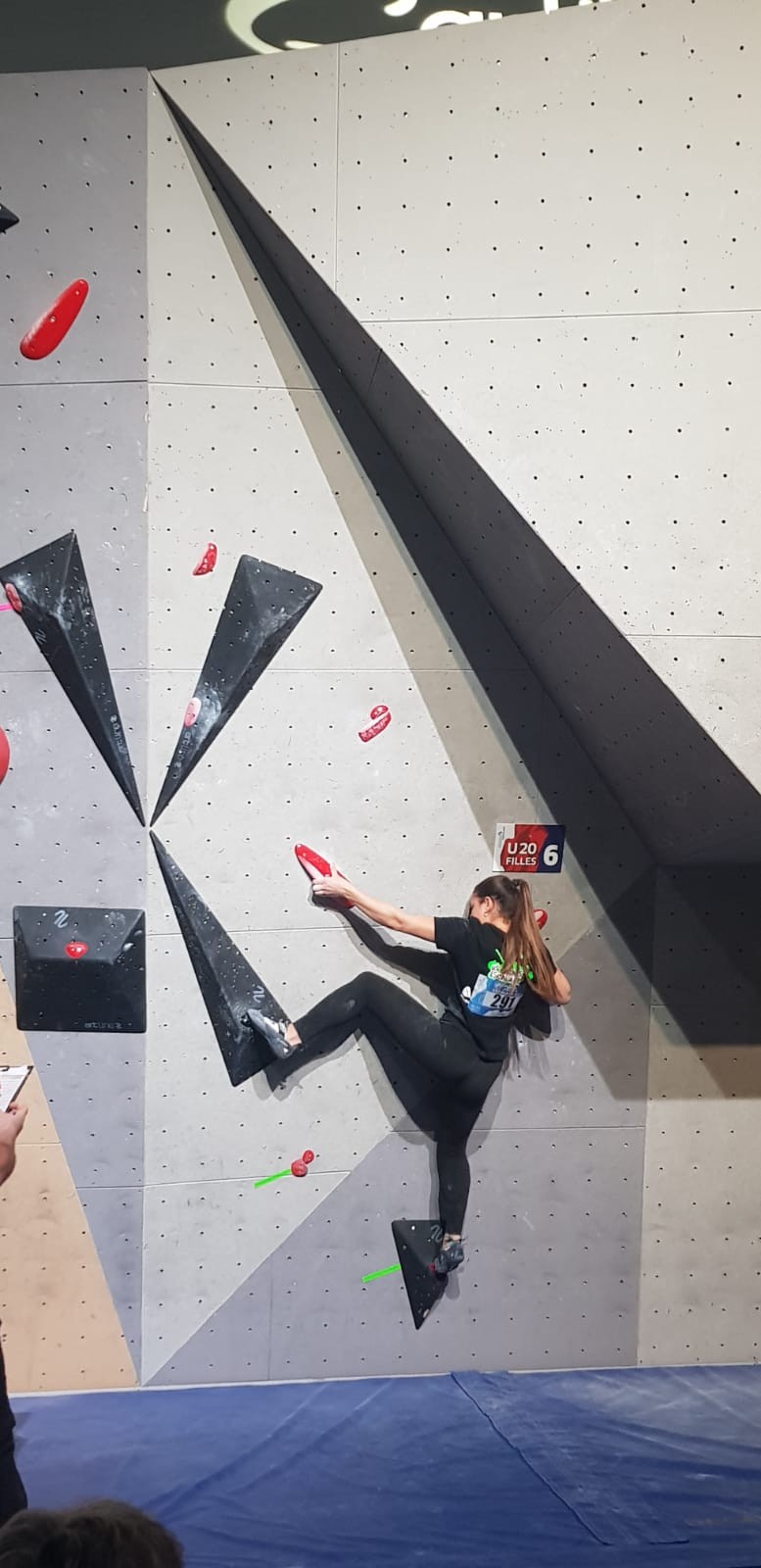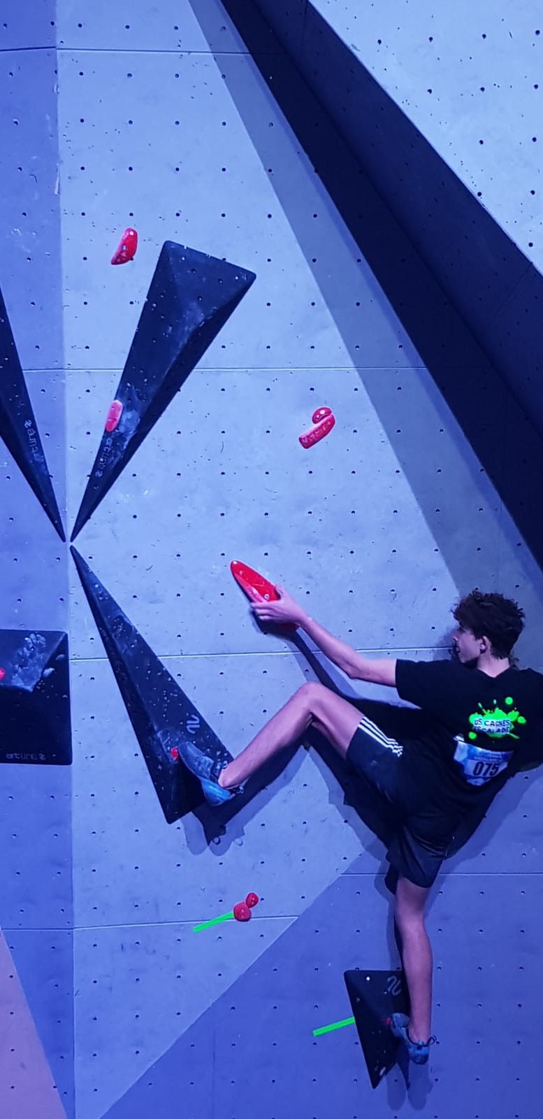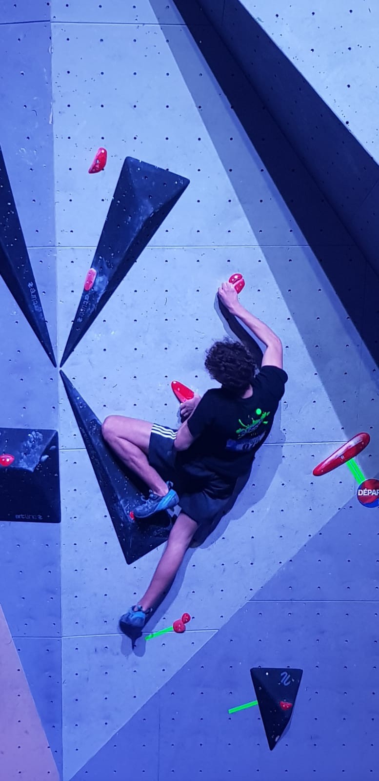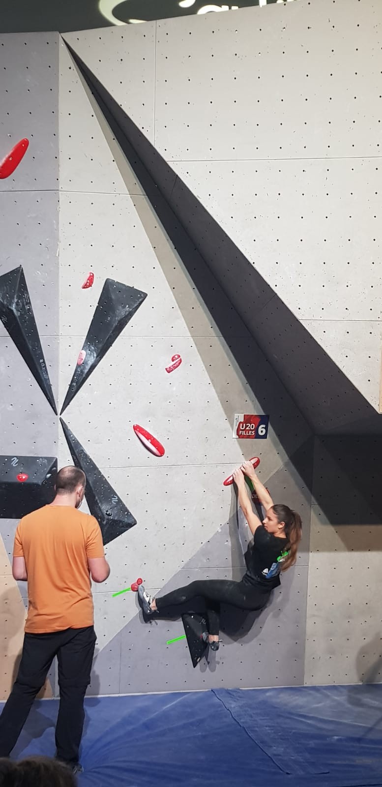 Chez les garçons, Arthur fait une belle prestation dans les 2 premières voies mais le manque d’expérience lui vaudra une chute dans la voie 3 qui lui donne la 15ème place.