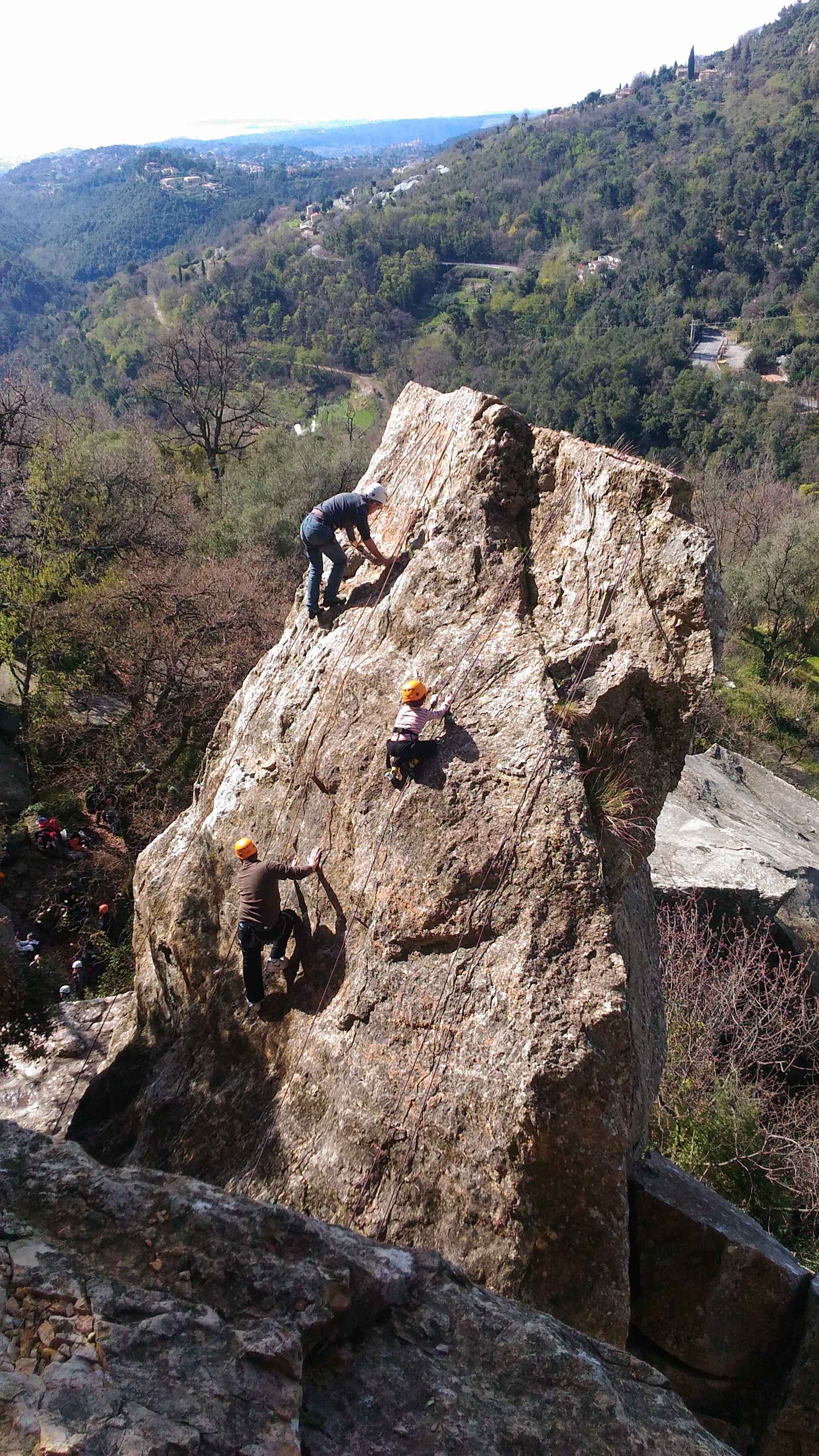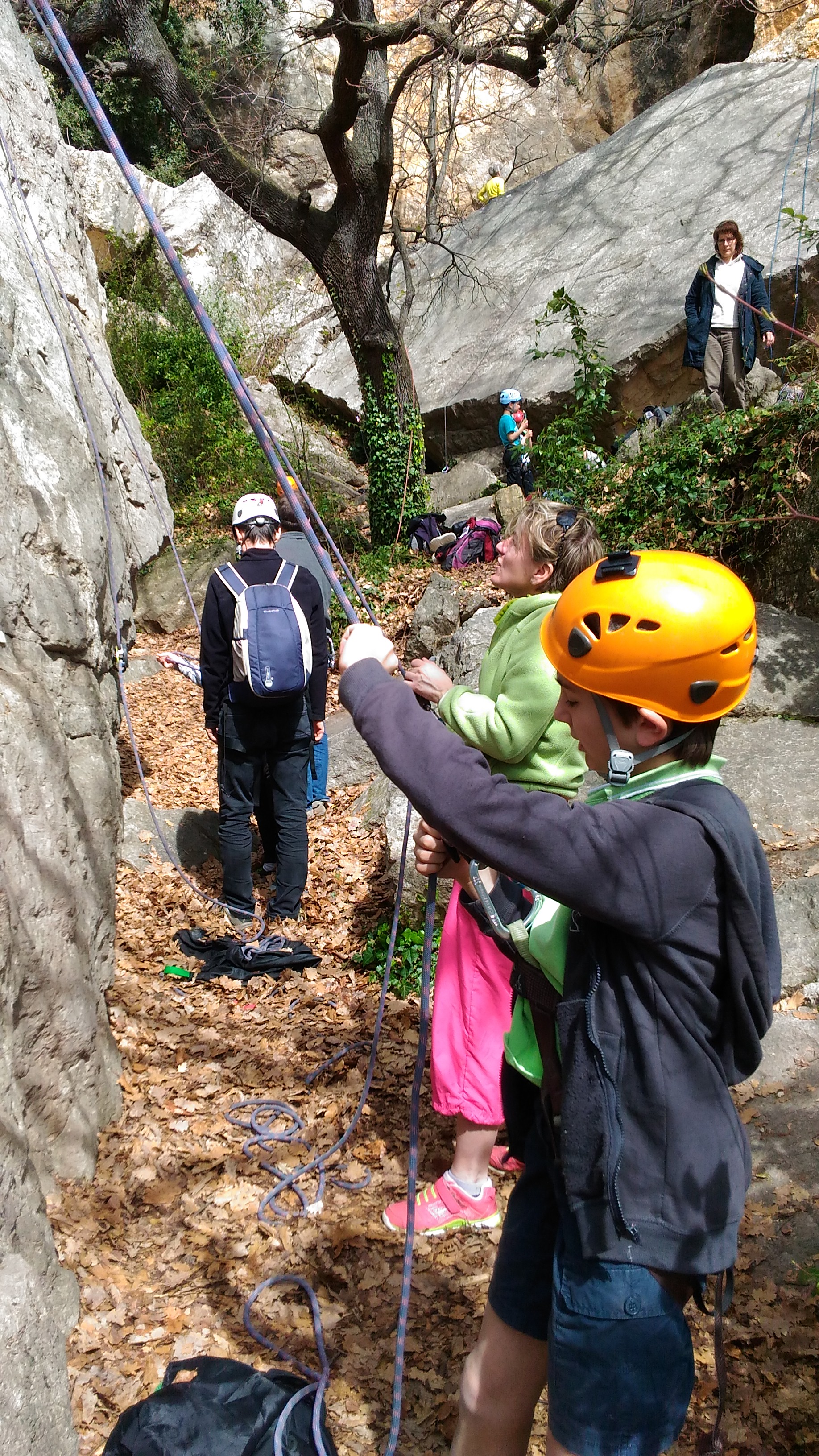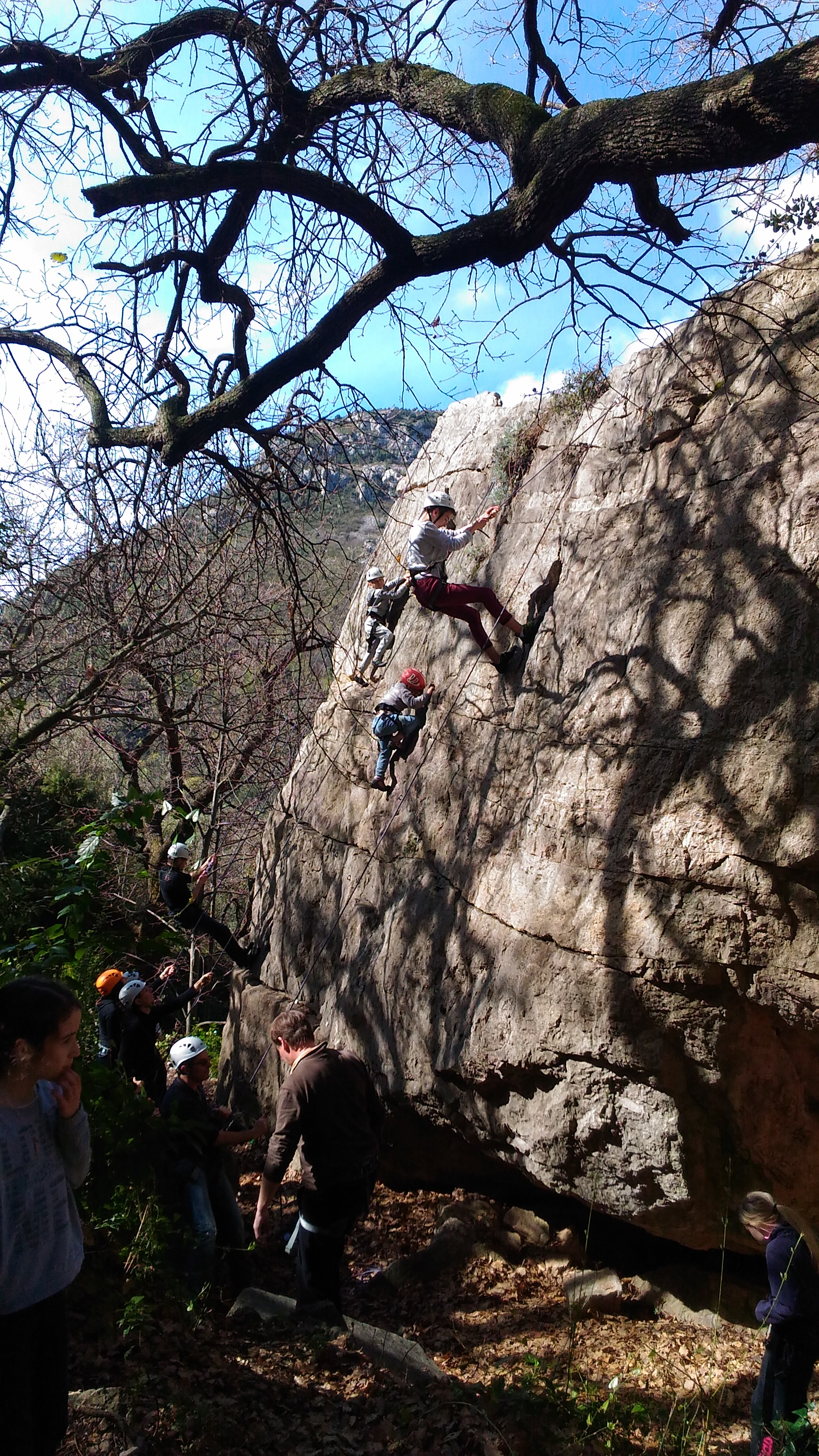 Je tire mon chapeau aux parents, à chaque sortie falaise je me rends compte qu’un grand nombre d’entre eux savent maintenant assurer en toute sécurité. Attention toute fois pour les novices à ne pas hésiter à faire appel à un référent afin qu’il vienne s’assurer de la bonne mise en place de l’appareil d’assurage ainsi que du nœud de huit et confirme le départ. Cette participation active a permis aux enfants d’en profiter un maximum, et même certains parents se sont pris au jeu d’essayer quelques voies. Parfois avec des chaussons qui ont été ressorti du placard après plusieurs années !
