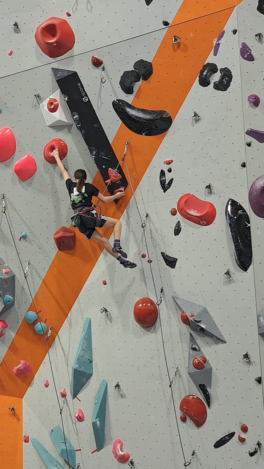 Le samedi, Lia portait le tout premier dossard chez les U17 filles. Petit coup de pression, mais heureusement, quelques vétéranes grimpaient dans les mêmes voies juste avant, histoire de grappiller des infos supplémentaires par rapport aux vidéos de démo.
