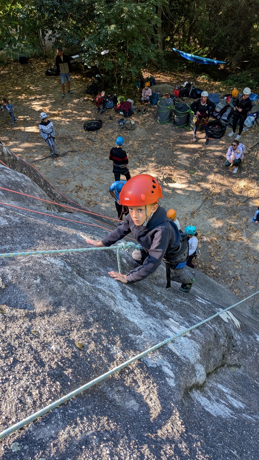 Anton, qui est un fidèle aux sorties falaises, arrive le premier accompagné de ses parents et de sa petite sœur. Rapidement il équipe son papa d’un baudrier puis fait de même avant d’aller s’encorder dans une des nombreuses voies disponibles. Peu après Kim fait son apparition et comme à son habitude parcourt avec aisance de nombreuses longueurs. Xavier est aussi présent avec ses deux enfants dont le petit frère Max prend tout son courage pour réaliser de belles descentes. Bientôt Hugo, Stella, Léo, Jules, Charlotte, Émilie, Clara , Paul, Louay et bien d’autres courageux bravant la canicule se joignent au rassemblement. Nous avons là un joli groupe efficace qui exploite pleinement les moulinettes tout en bénéficiant encore d’une ombre qui s’amenuise dangereusement.