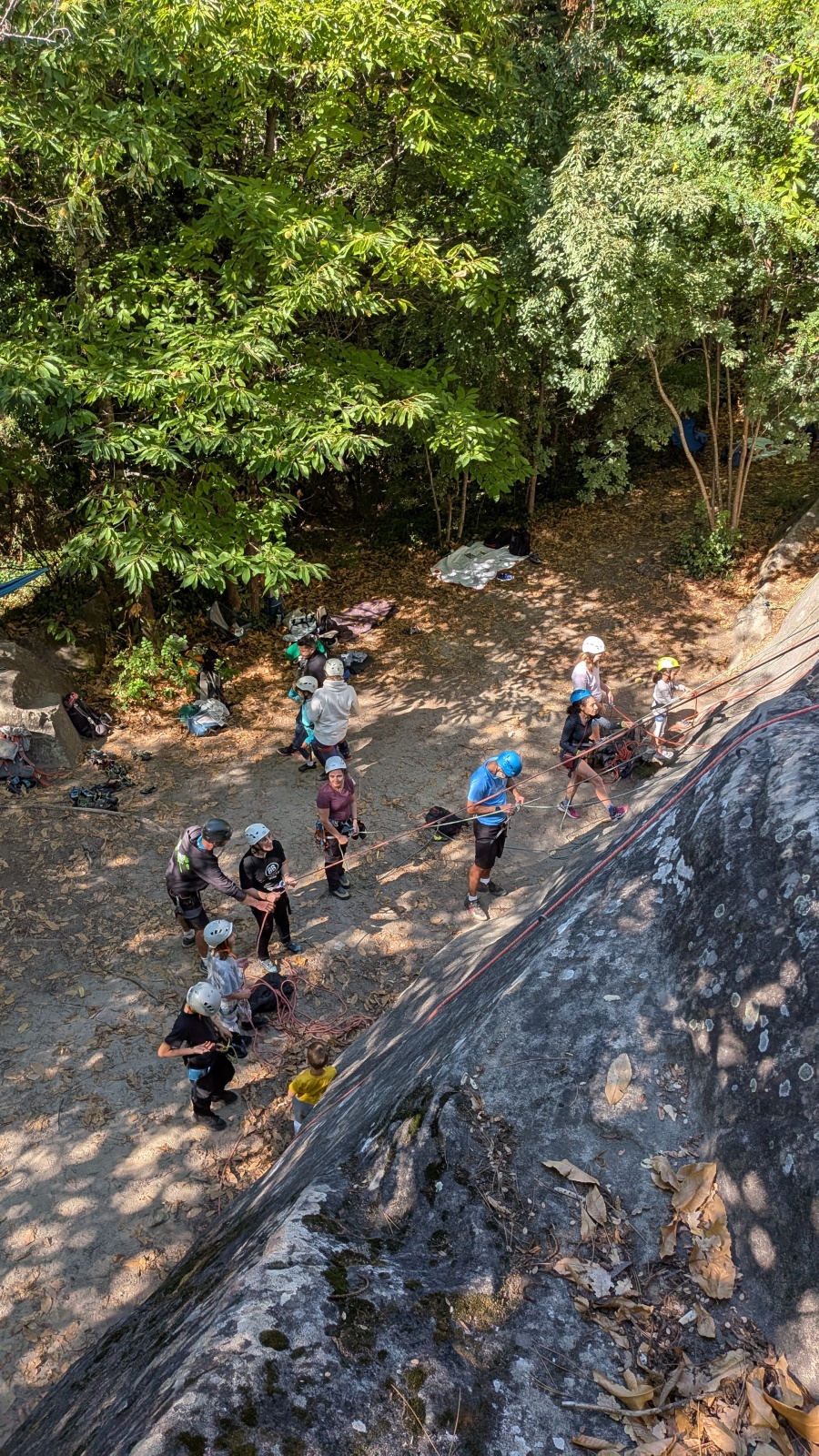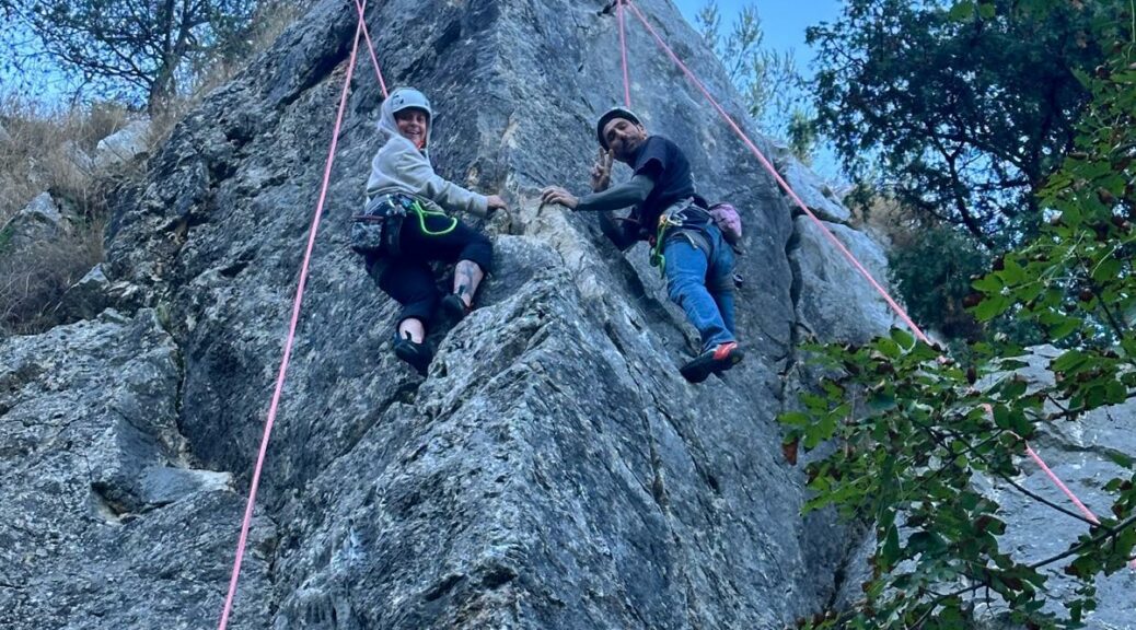 Sur place Sylvain et moi même, largement aidé par Julien qui jette les cordes du sol pour un « ravitaillement » rapide, nous occupons de l’installation de la majorité des moulinettes et de la tyrolienne.  Donna qui joue désormais les premiers rôles dans la gestion de l’USC ne se contente pas de l’administratif et monte la corde dans un 6a+ aux grosses prises glissantes. Quelle progression et quelle prise de confiance ! Léane pour se rassurer sur sa condition physique se charge de poser les cordes dans les longueurs les plus dures.